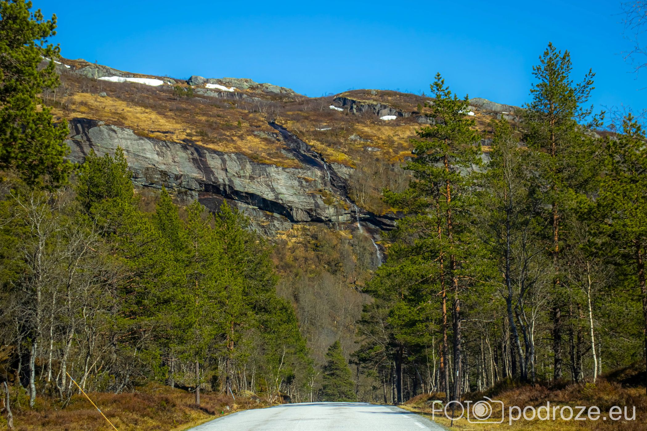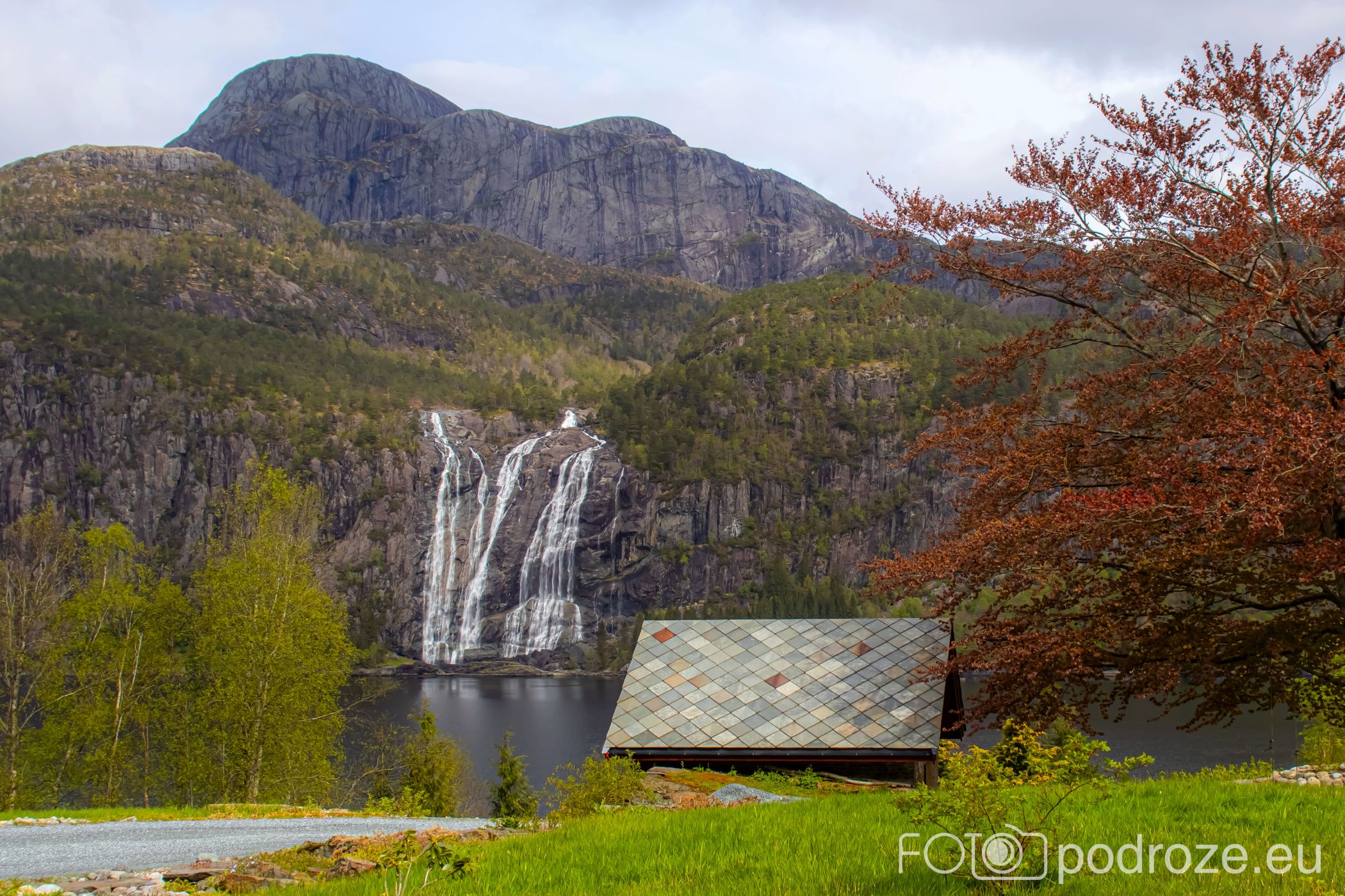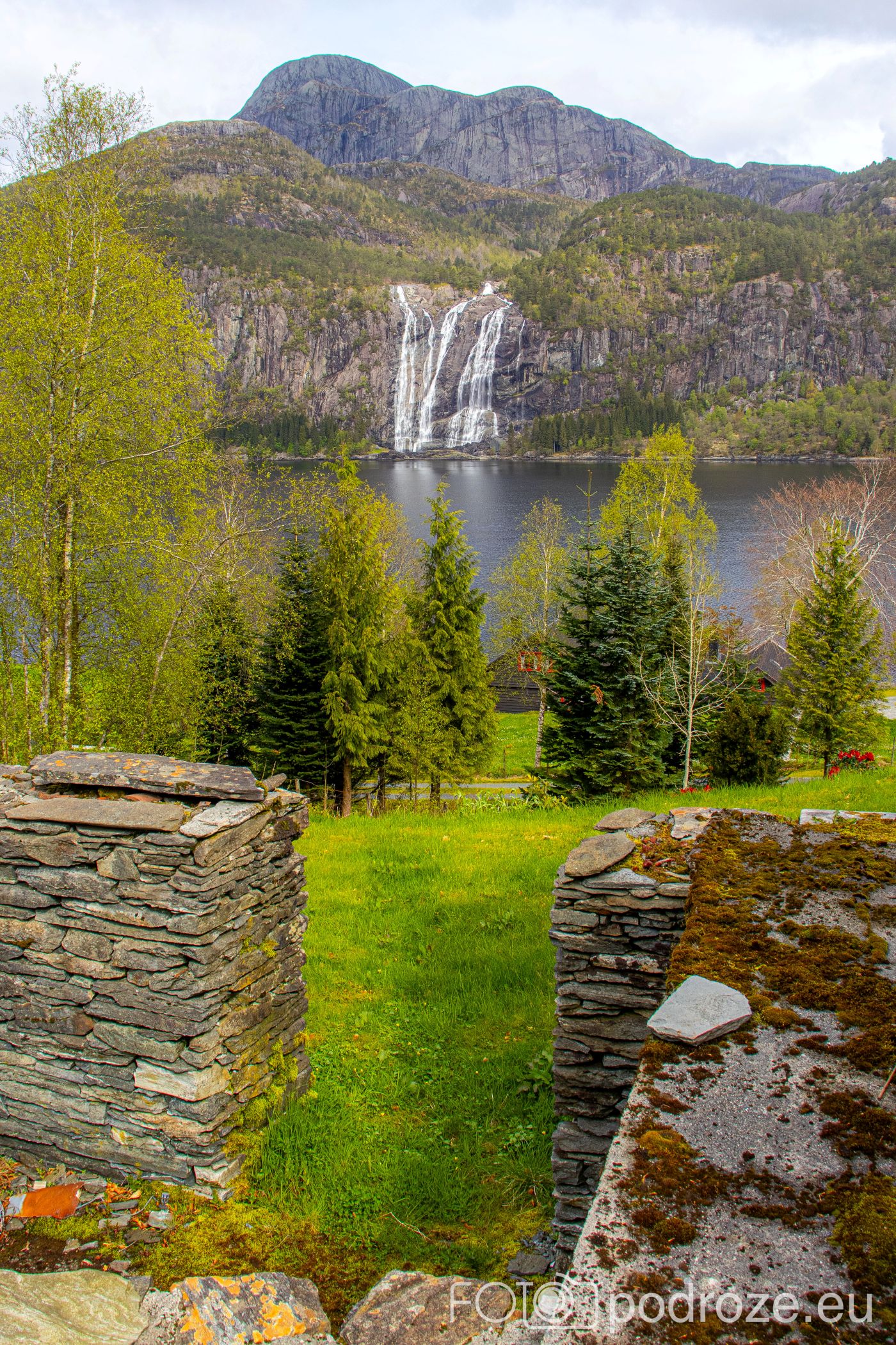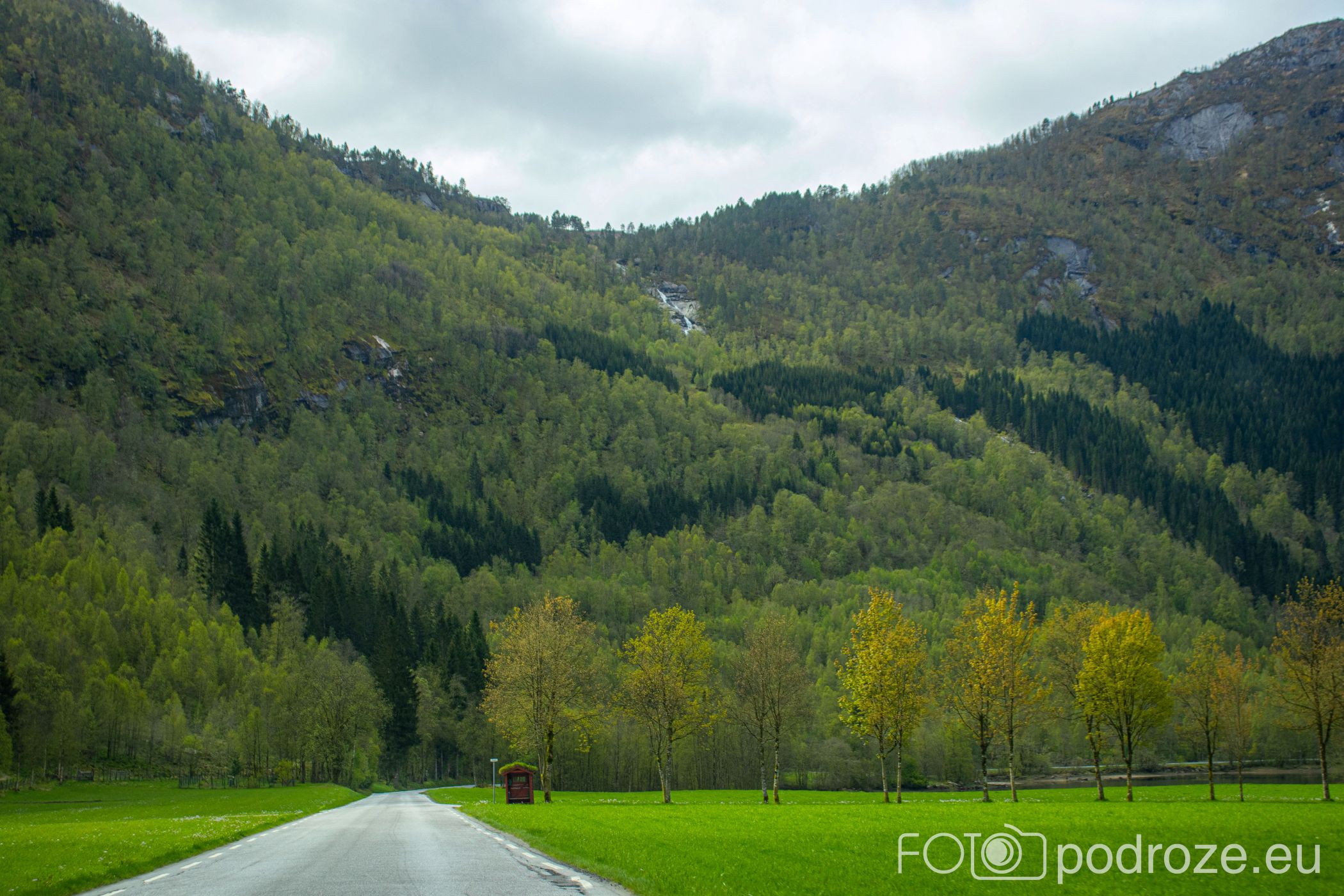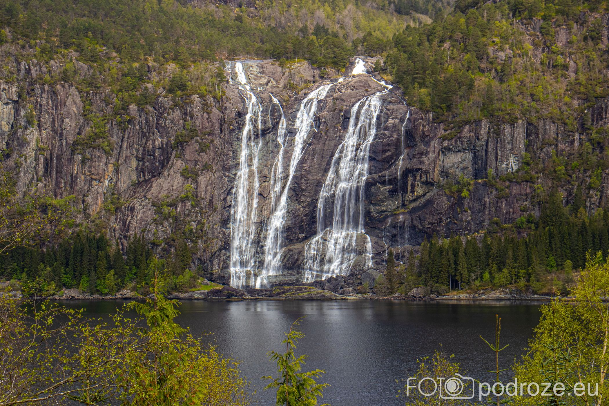 Zatrzymujemy się nad fordem tylko w jednym miejscu z którego widać przepiękny wodospad po drugiej stronie wody. Laukelandsfossen to jeden z najbardziej efektownych wodospadów w okolicy. Ma około 135 metrów wysokości i w zależności od ilości wody, może osiągać nawet do 100 metrów szerokości, co czyni go jednym z bardziej imponujących w okolicy. Spływa po skalnej ścianie w szerokiej, rozlewającej się kaskadzie, a jego charakterystyczny kształt wynika z tego, że rzeka Storelva rozdziela się na kilka nurtów tuż przed spadkiem.
