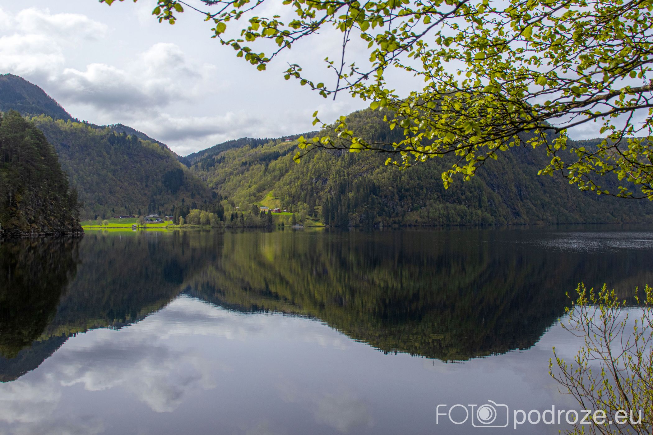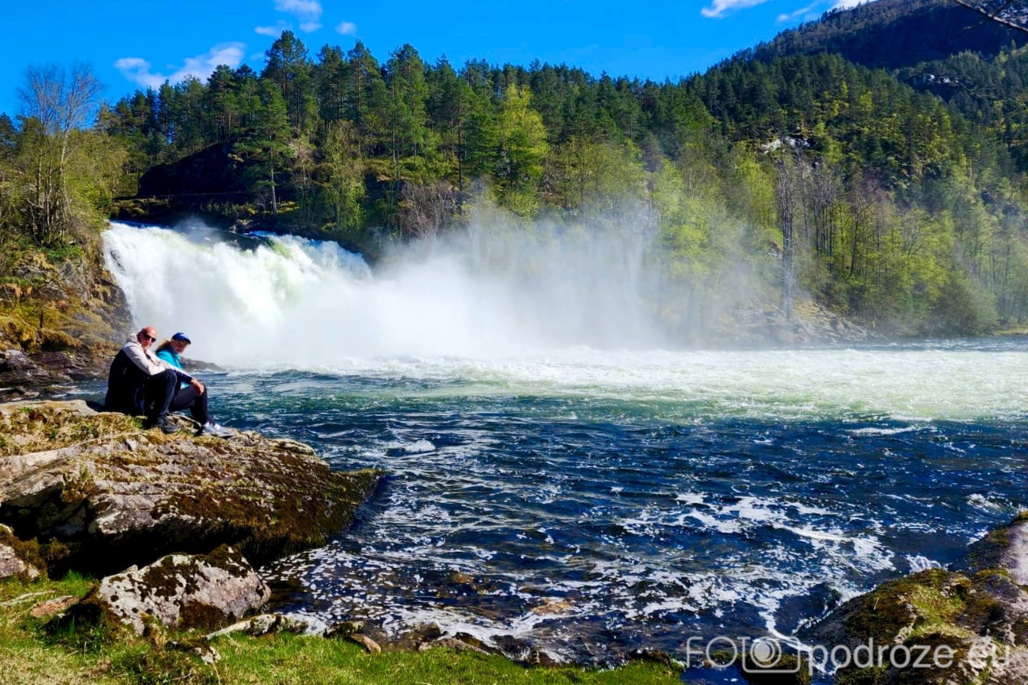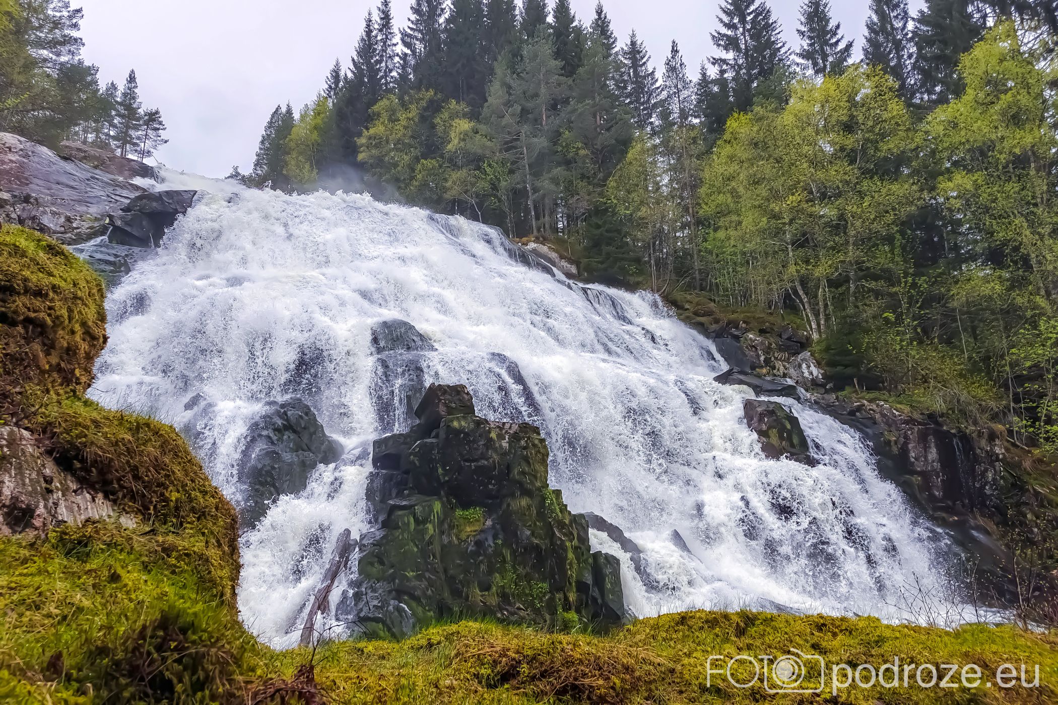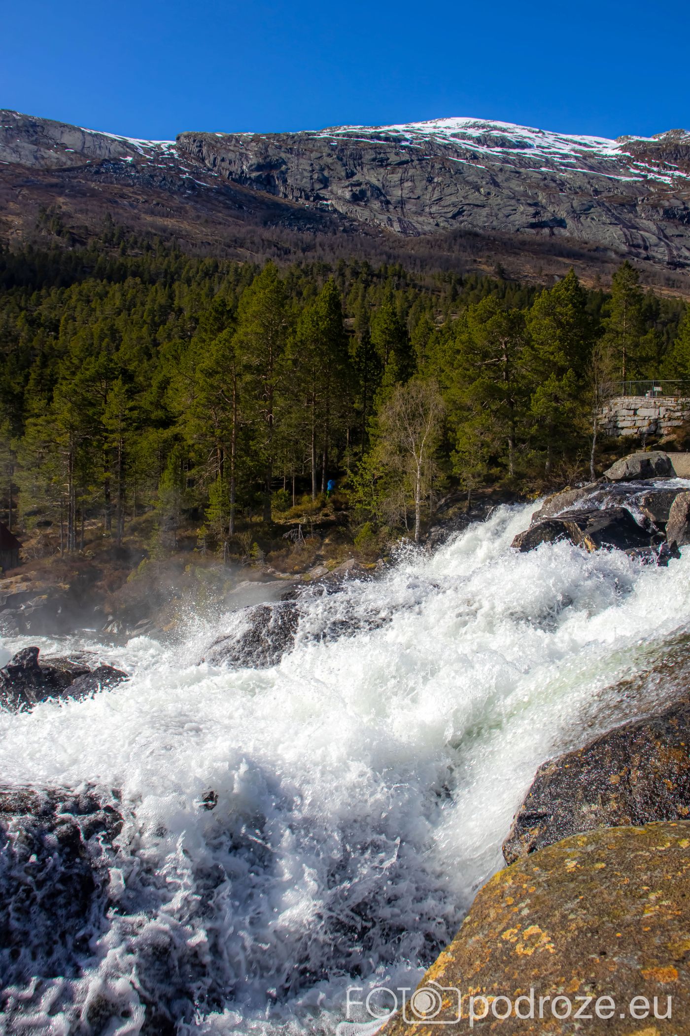 Zatrzymujemy się nad fordem tylko w jednym miejscu z którego widać przepiękny wodospad po drugiej stronie wody. Laukelandsfossen to jeden z najbardziej efektownych wodospadów w okolicy. Ma około 135 metrów wysokości i w zależności od ilości wody, może osiągać nawet do 100 metrów szerokości, co czyni go jednym z bardziej imponujących w okolicy. Spływa po skalnej ścianie w szerokiej, rozlewającej się kaskadzie, a jego charakterystyczny kształt wynika z tego, że rzeka Storelva rozdziela się na kilka nurtów tuż przed spadkiem.