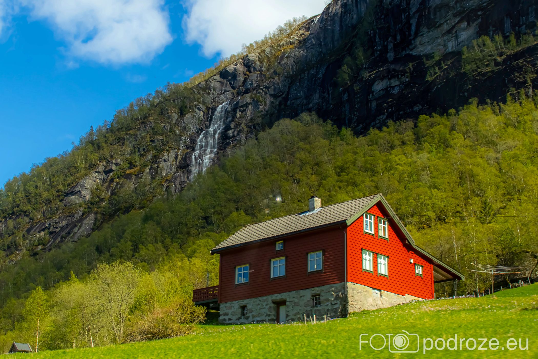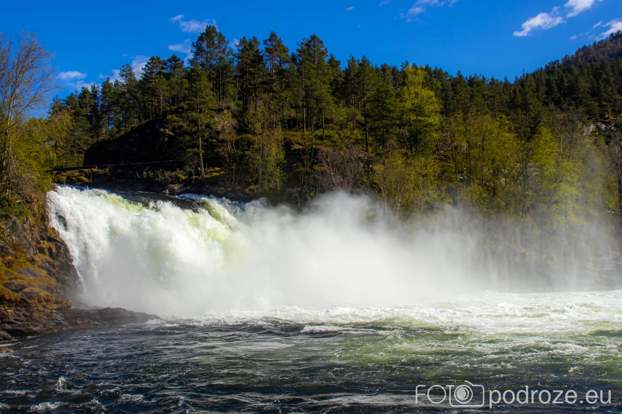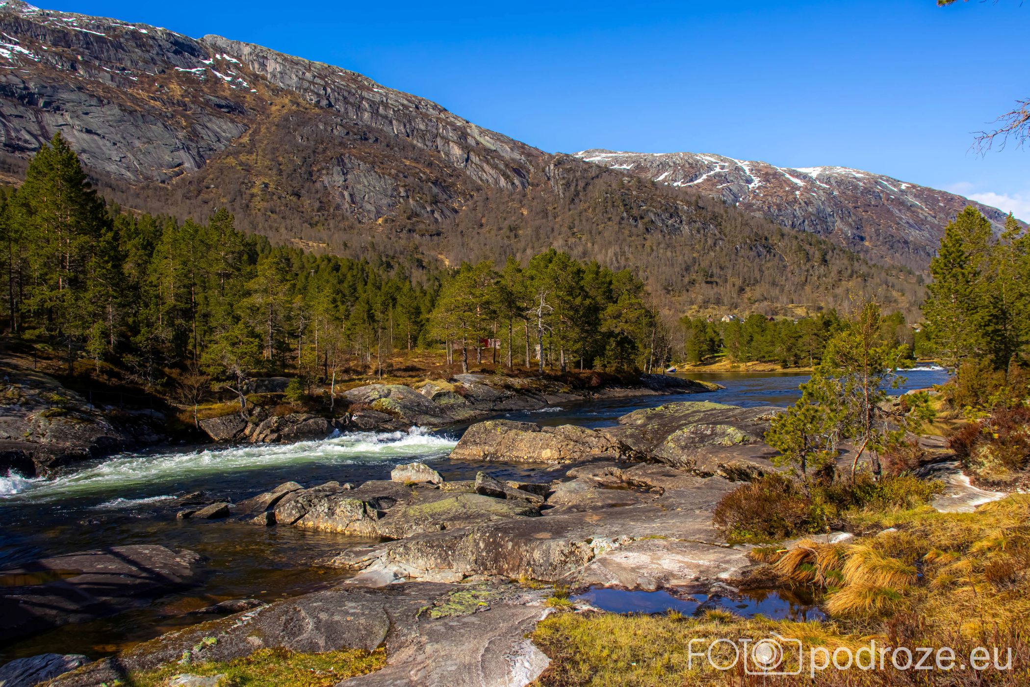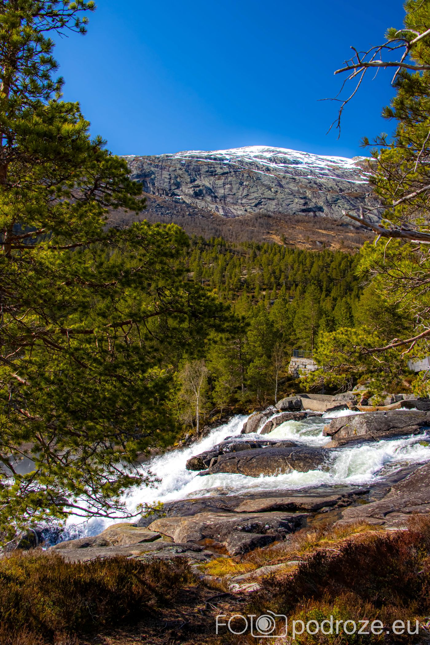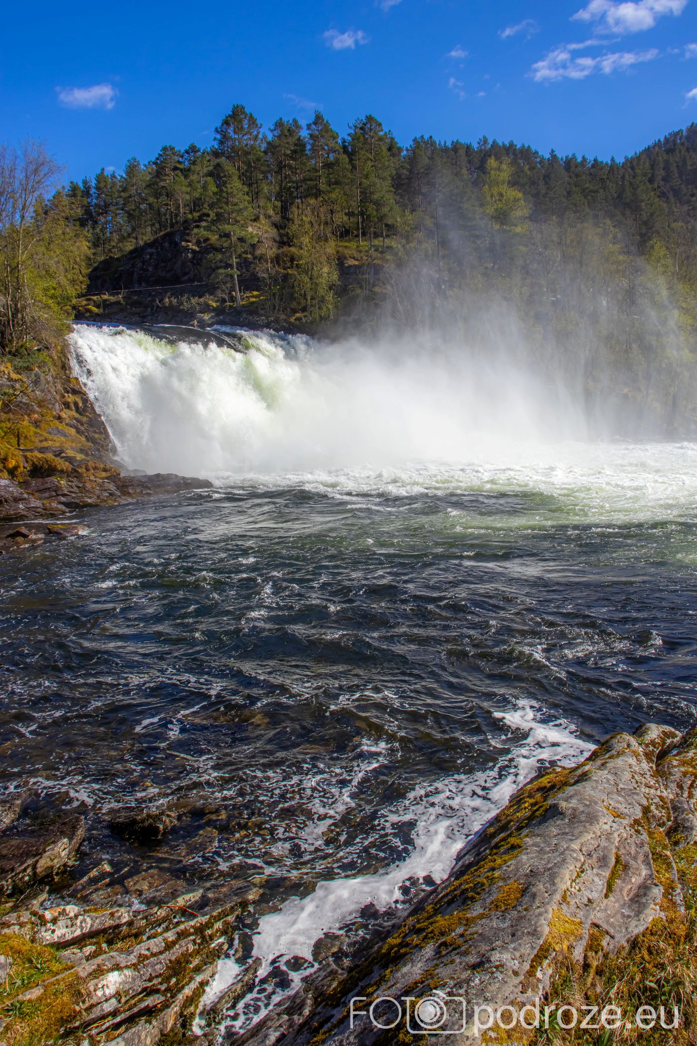 Zatrzymujemy się nad fordem tylko w jednym miejscu z którego widać przepiękny wodospad po drugiej stronie wody. Laukelandsfossen to jeden z najbardziej efektownych wodospadów w okolicy. Ma około 135 metrów wysokości i w zależności od ilości wody, może osiągać nawet do 100 metrów szerokości, co czyni go jednym z bardziej imponujących w okolicy. Spływa po skalnej ścianie w szerokiej, rozlewającej się kaskadzie, a jego charakterystyczny kształt wynika z tego, że rzeka Storelva rozdziela się na kilka nurtów tuż przed spadkiem.