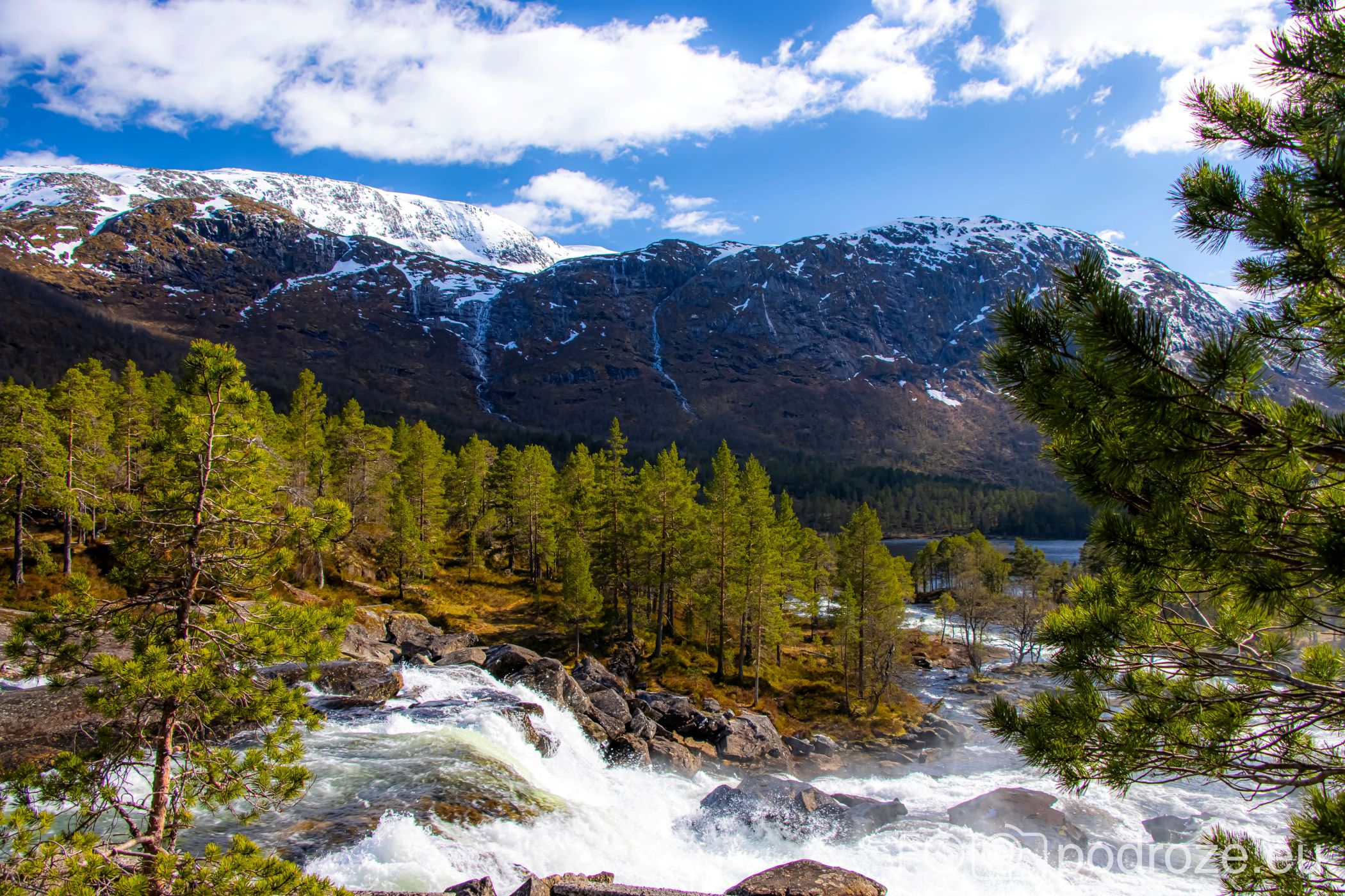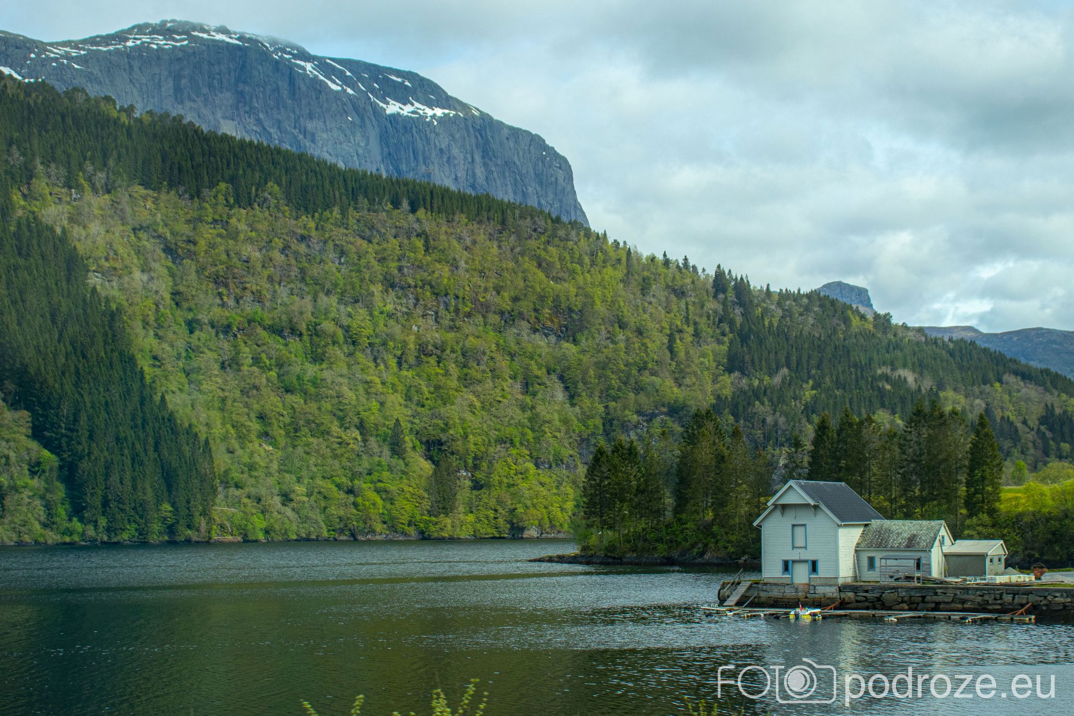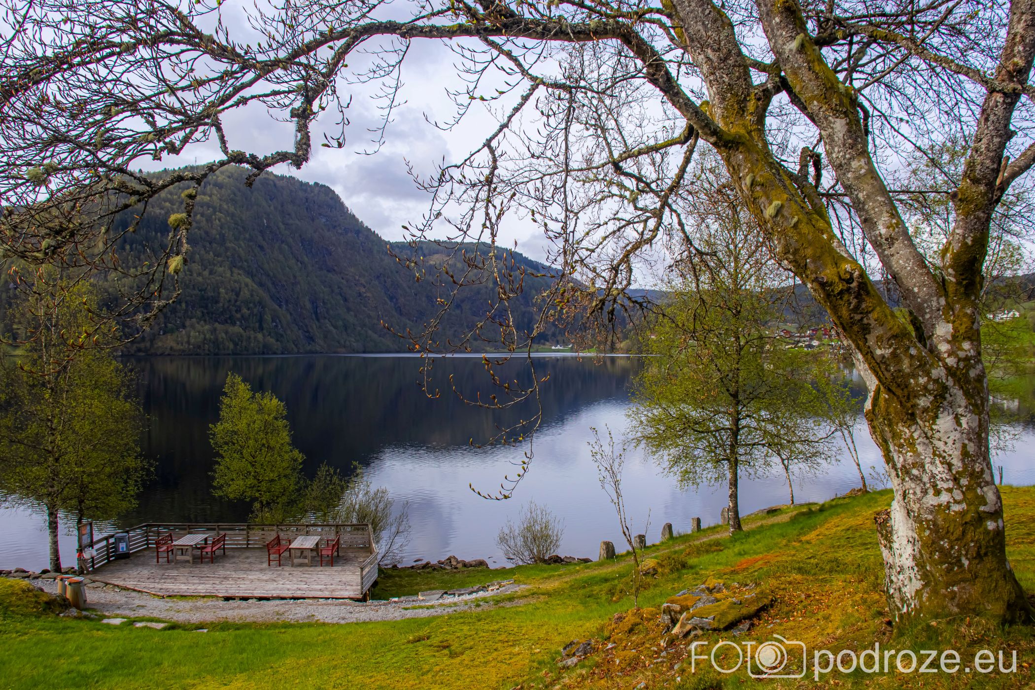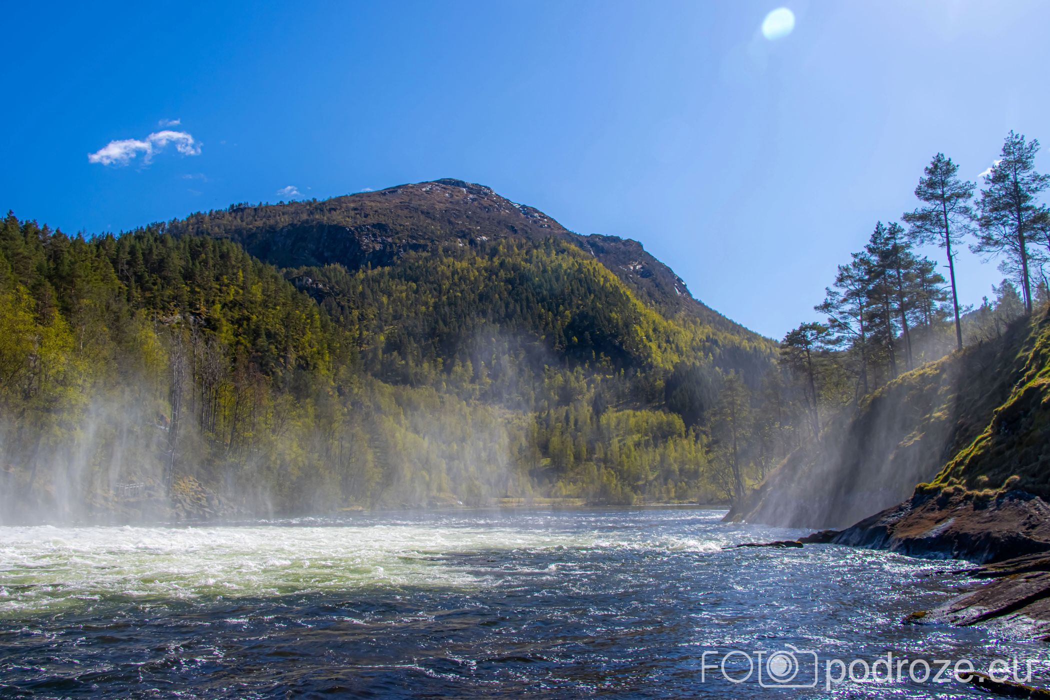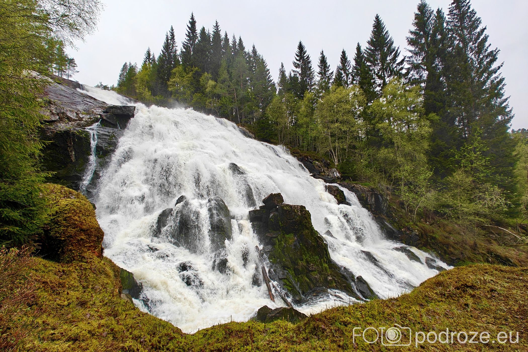 Zatrzymujemy się nad fordem tylko w jednym miejscu z którego widać przepiękny wodospad po drugiej stronie wody. Laukelandsfossen to jeden z najbardziej efektownych wodospadów w okolicy. Ma około 135 metrów wysokości i w zależności od ilości wody, może osiągać nawet do 100 metrów szerokości, co czyni go jednym z bardziej imponujących w okolicy. Spływa po skalnej ścianie w szerokiej, rozlewającej się kaskadzie, a jego charakterystyczny kształt wynika z tego, że rzeka Storelva rozdziela się na kilka nurtów tuż przed spadkiem.