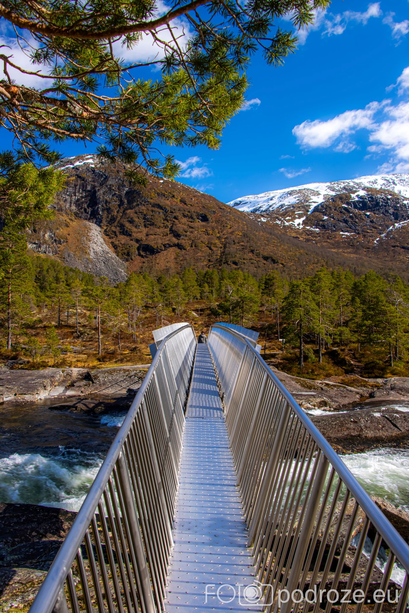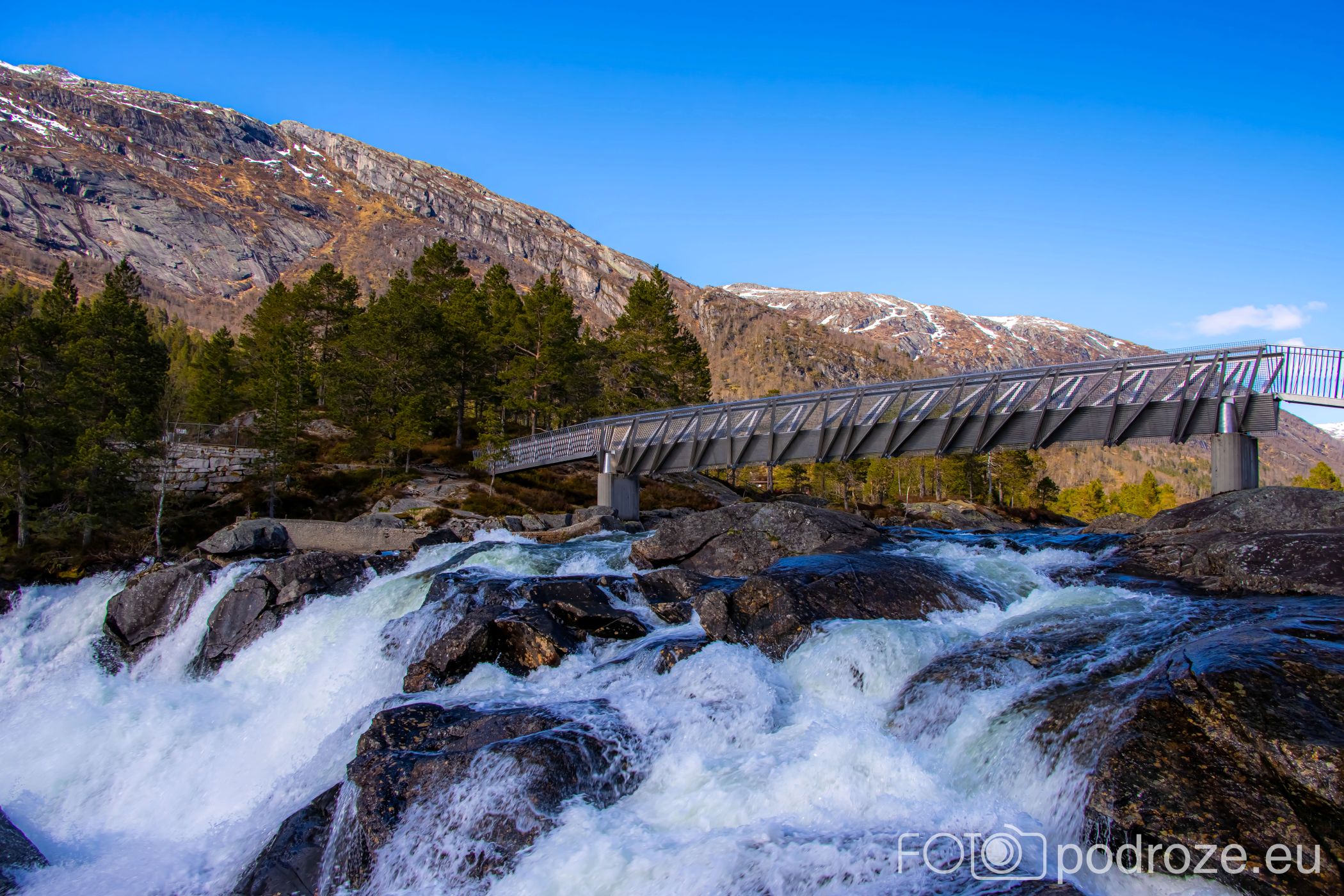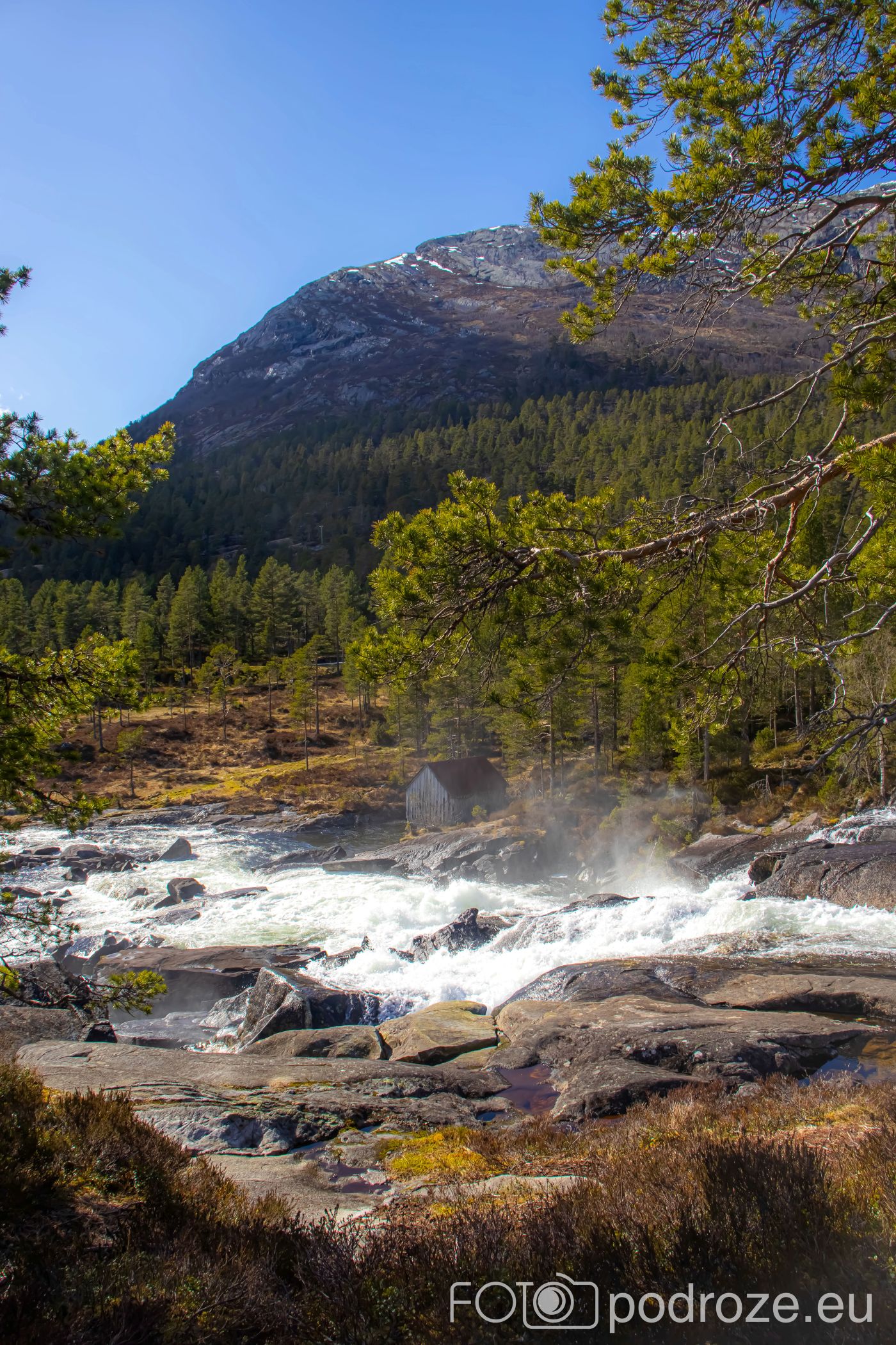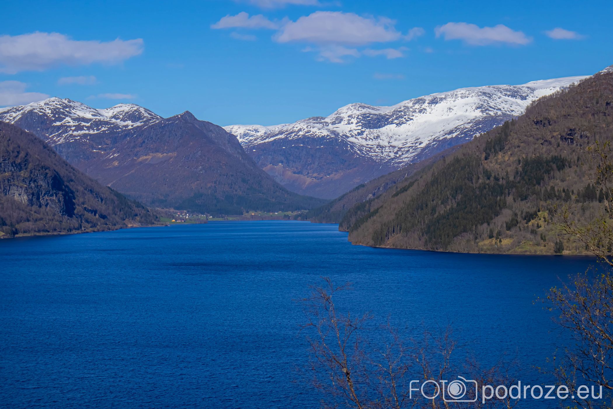 Zatrzymujemy się nad fordem tylko w jednym miejscu z którego widać przepiękny wodospad po drugiej stronie wody. Laukelandsfossen to jeden z najbardziej efektownych wodospadów w okolicy. Ma około 135 metrów wysokości i w zależności od ilości wody, może osiągać nawet do 100 metrów szerokości, co czyni go jednym z bardziej imponujących w okolicy. Spływa po skalnej ścianie w szerokiej, rozlewającej się kaskadzie, a jego charakterystyczny kształt wynika z tego, że rzeka Storelva rozdziela się na kilka nurtów tuż przed spadkiem.