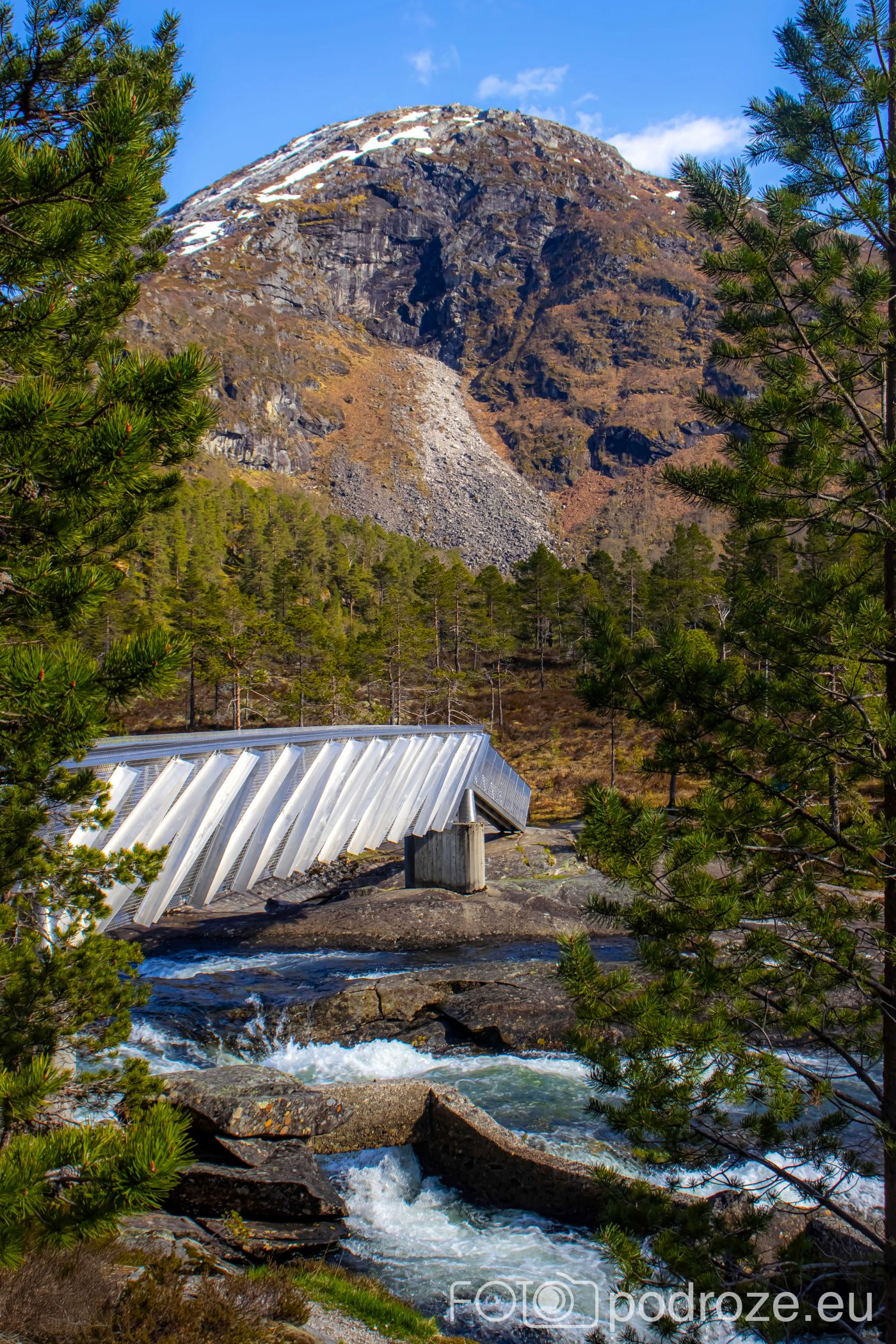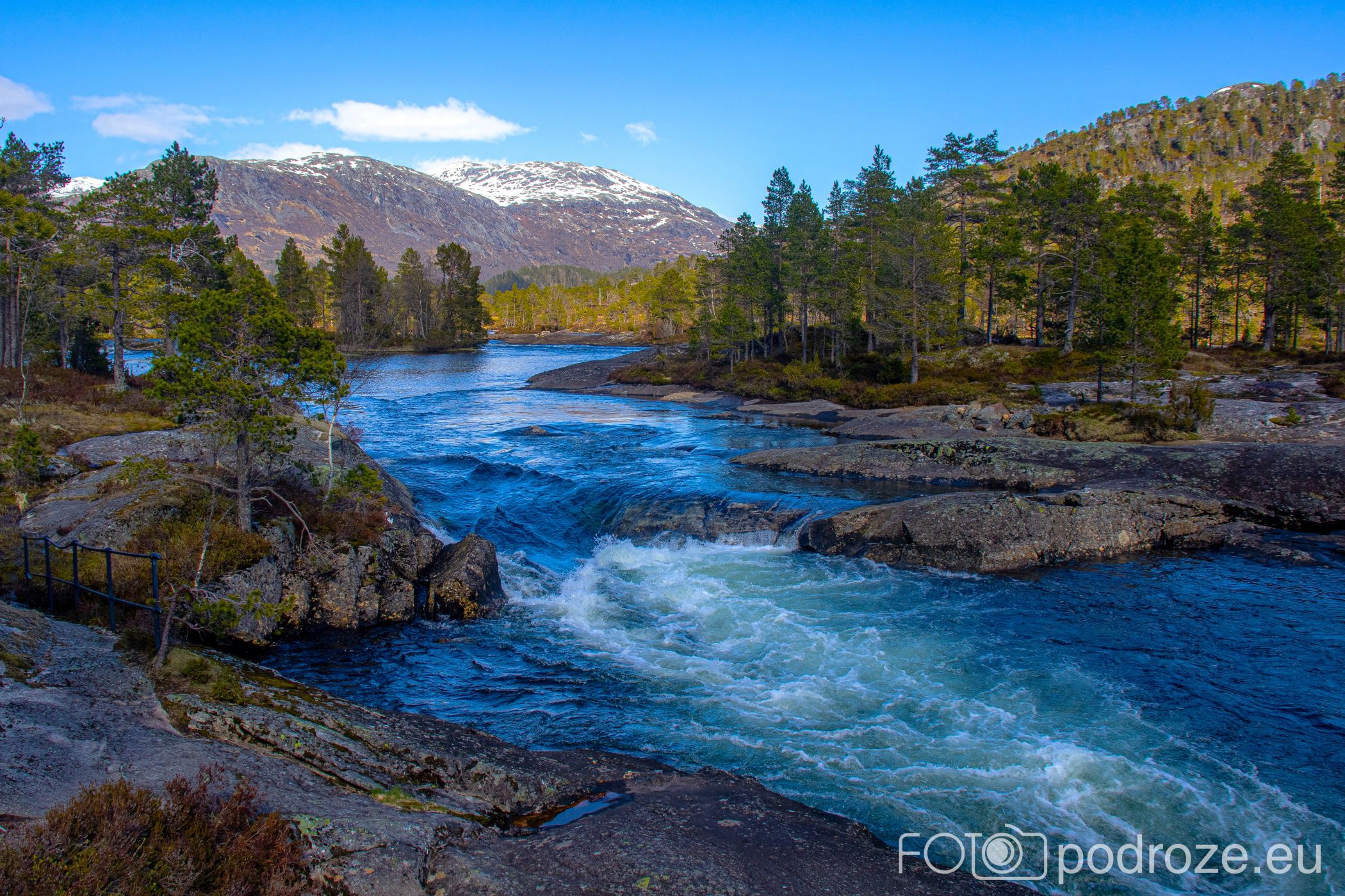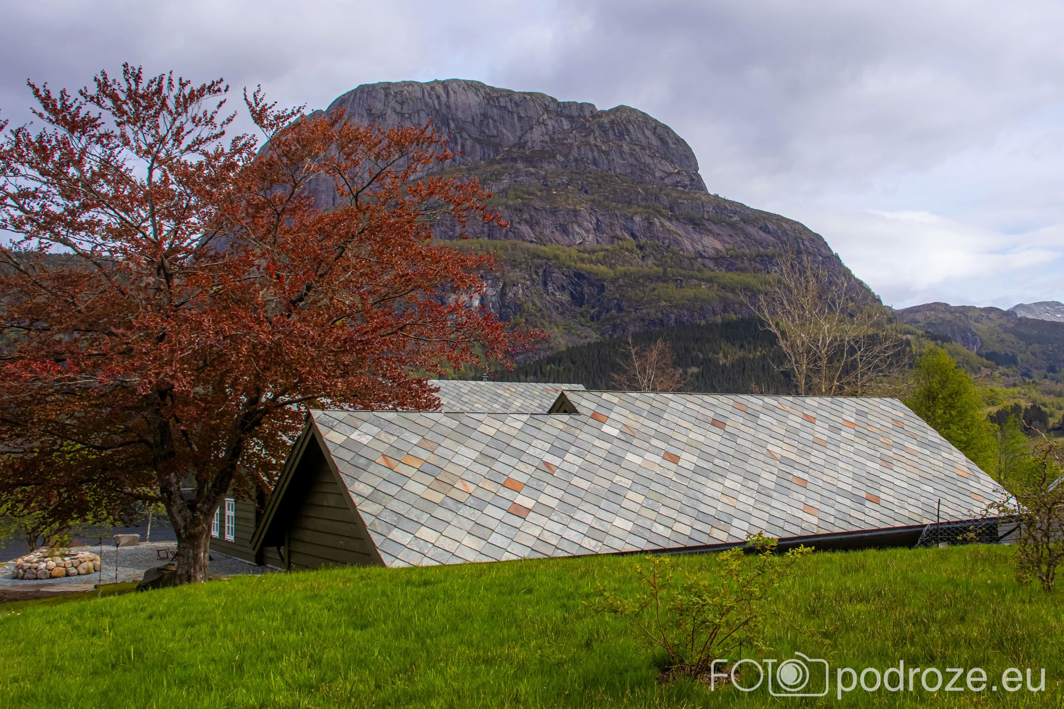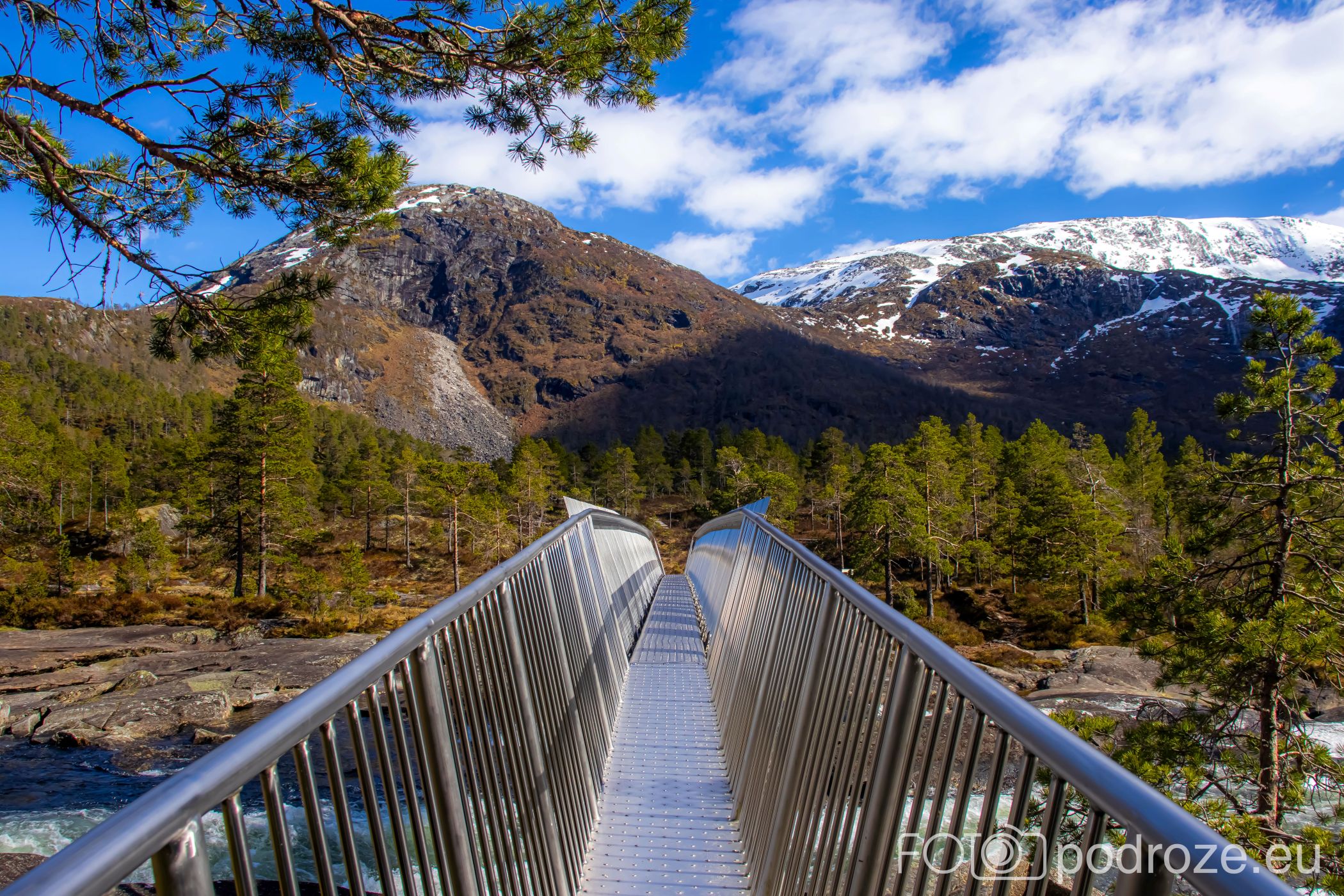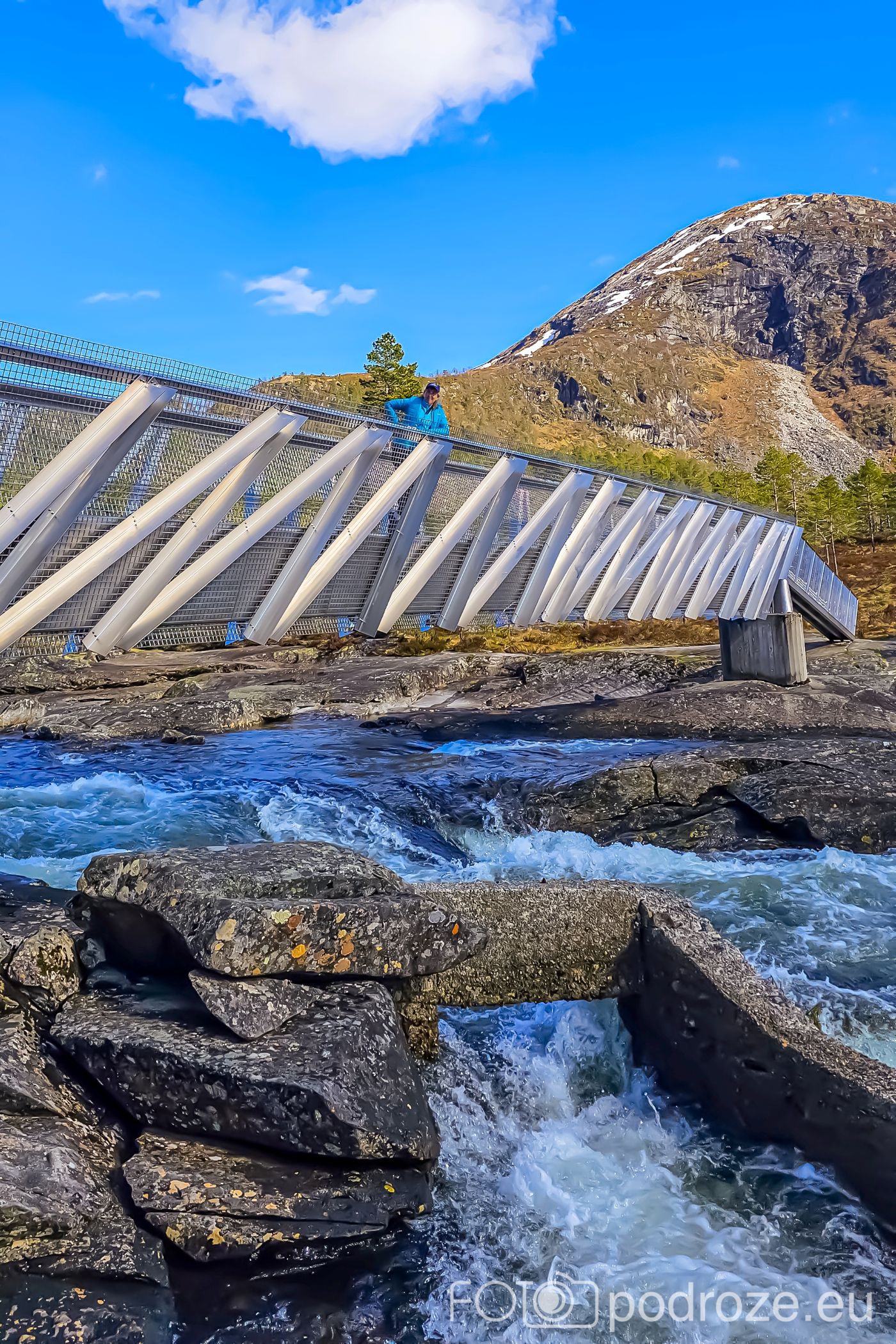 Zatrzymujemy się nad fordem tylko w jednym miejscu z którego widać przepiękny wodospad po drugiej stronie wody. Laukelandsfossen to jeden z najbardziej efektownych wodospadów w okolicy. Ma około 135 metrów wysokości i w zależności od ilości wody, może osiągać nawet do 100 metrów szerokości, co czyni go jednym z bardziej imponujących w okolicy. Spływa po skalnej ścianie w szerokiej, rozlewającej się kaskadzie, a jego charakterystyczny kształt wynika z tego, że rzeka Storelva rozdziela się na kilka nurtów tuż przed spadkiem.