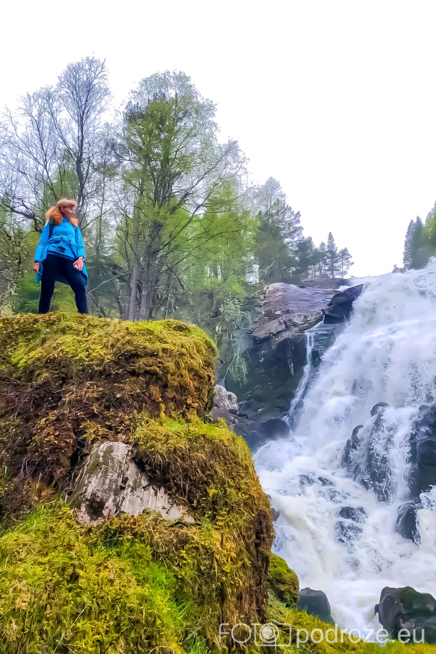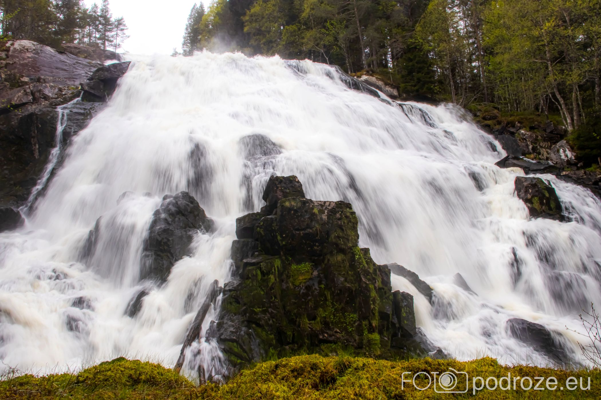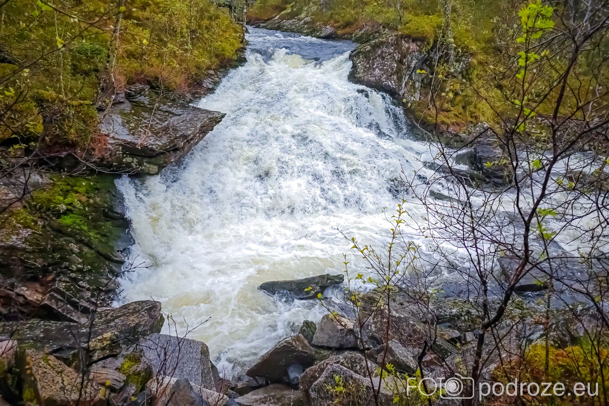 Po drodze mija się obłędny , spektakularny wodospad Halbrendsfossen. Jest jednym z tysięcy w Norwegii i nie ma nawet pinezki na mapie, ani oficjalnej ścieżki dojścia. Tylko huk wody i wydeptany lekko mech kierują nas we właściwe miejsce.