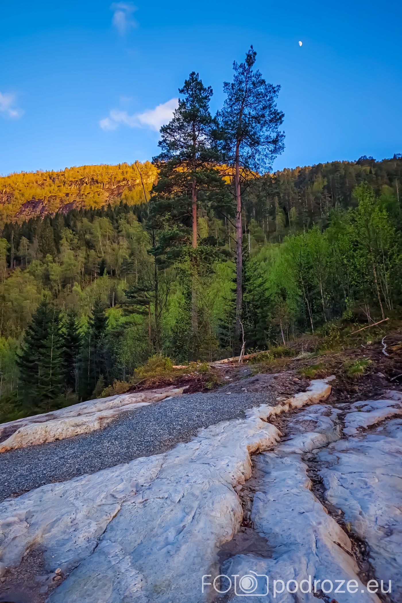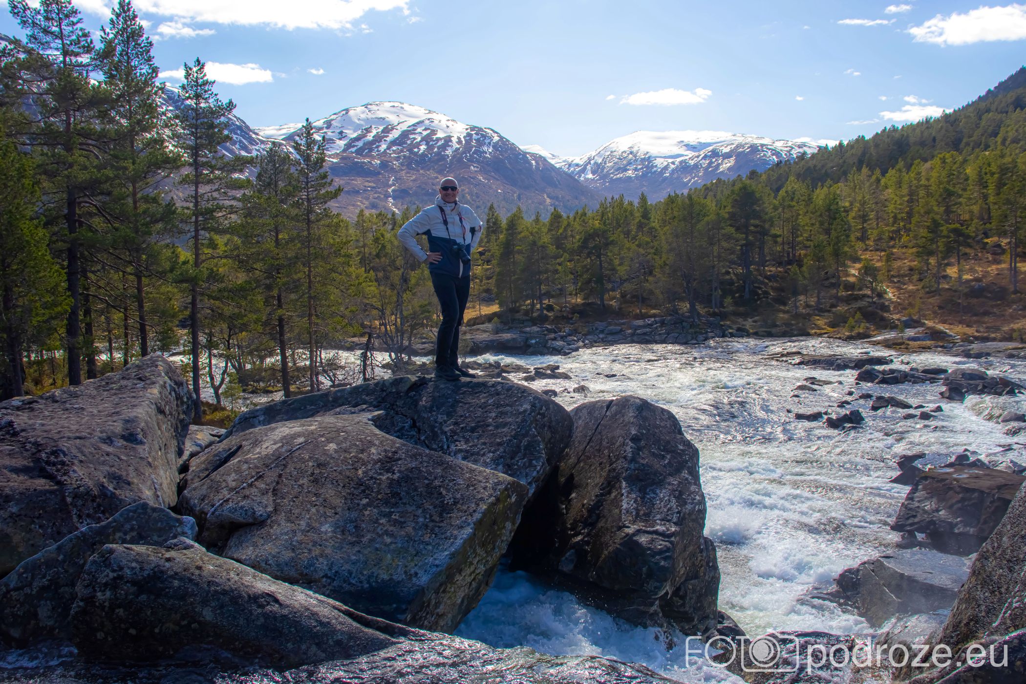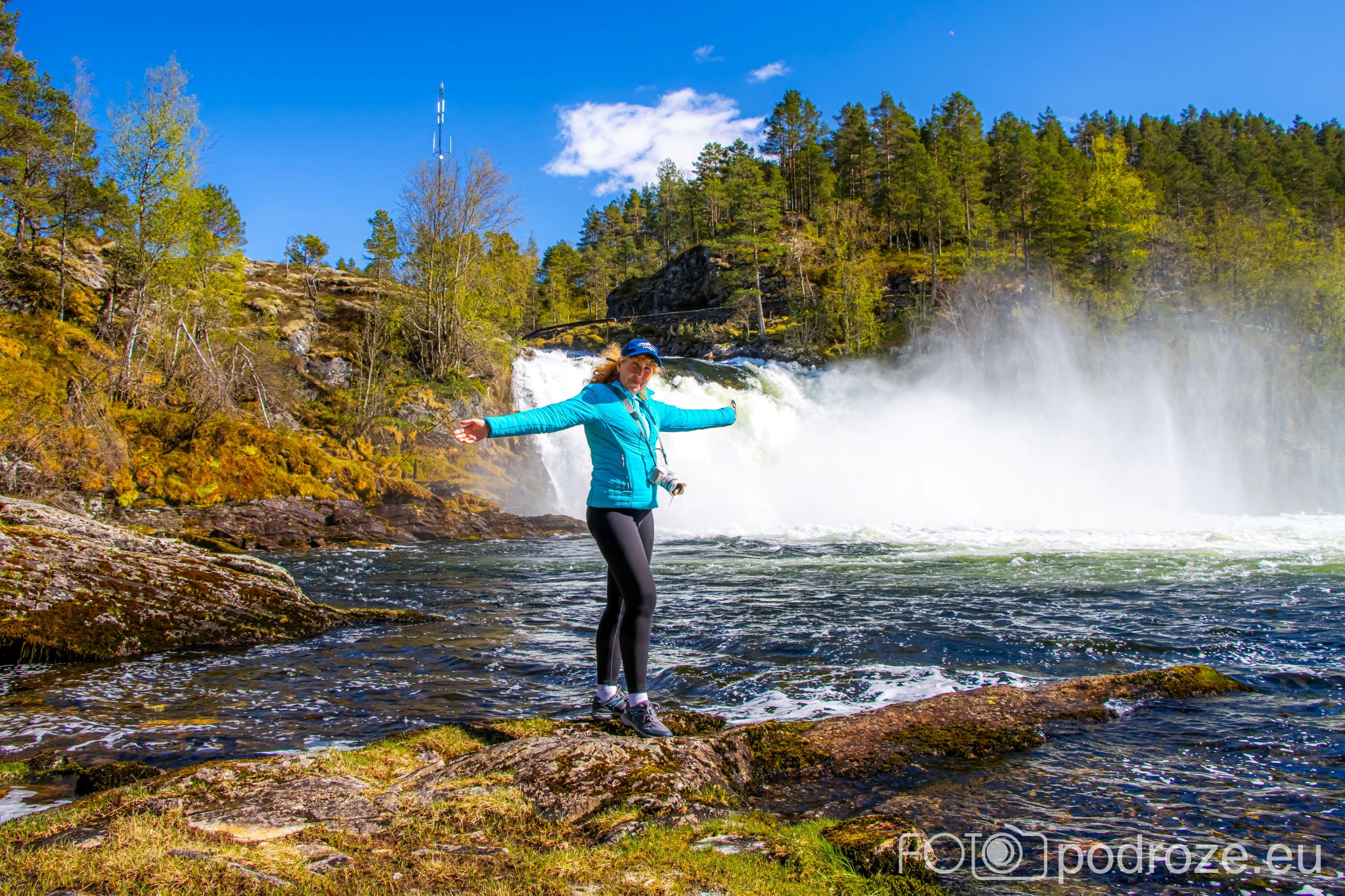 Po drodze mija się obłędny , spektakularny wodospad Halbrendsfossen. Jest jednym z tysięcy w Norwegii i nie ma nawet pinezki na mapie, ani oficjalnej ścieżki dojścia. Tylko huk wody i wydeptany lekko mech kierują nas we właściwe miejsce.