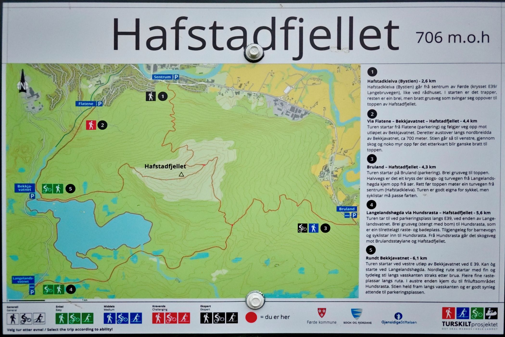 Jednym z najpopularniejszych szczytów w okolicy jest Hafstadfjellet, górujący nad miastem. Szlak prowadzący na jego wierzchołek jest dobrze oznakowany, ale momentami dość wymagający, szczególnie na końcowym podejściu. Wysiłek wynagradza jednak spektakularna panorama na Førde, dolinę oraz okoliczne góry. Proponowana trasa ze wszystkim punktami, których opis jest poniżej > MAPA