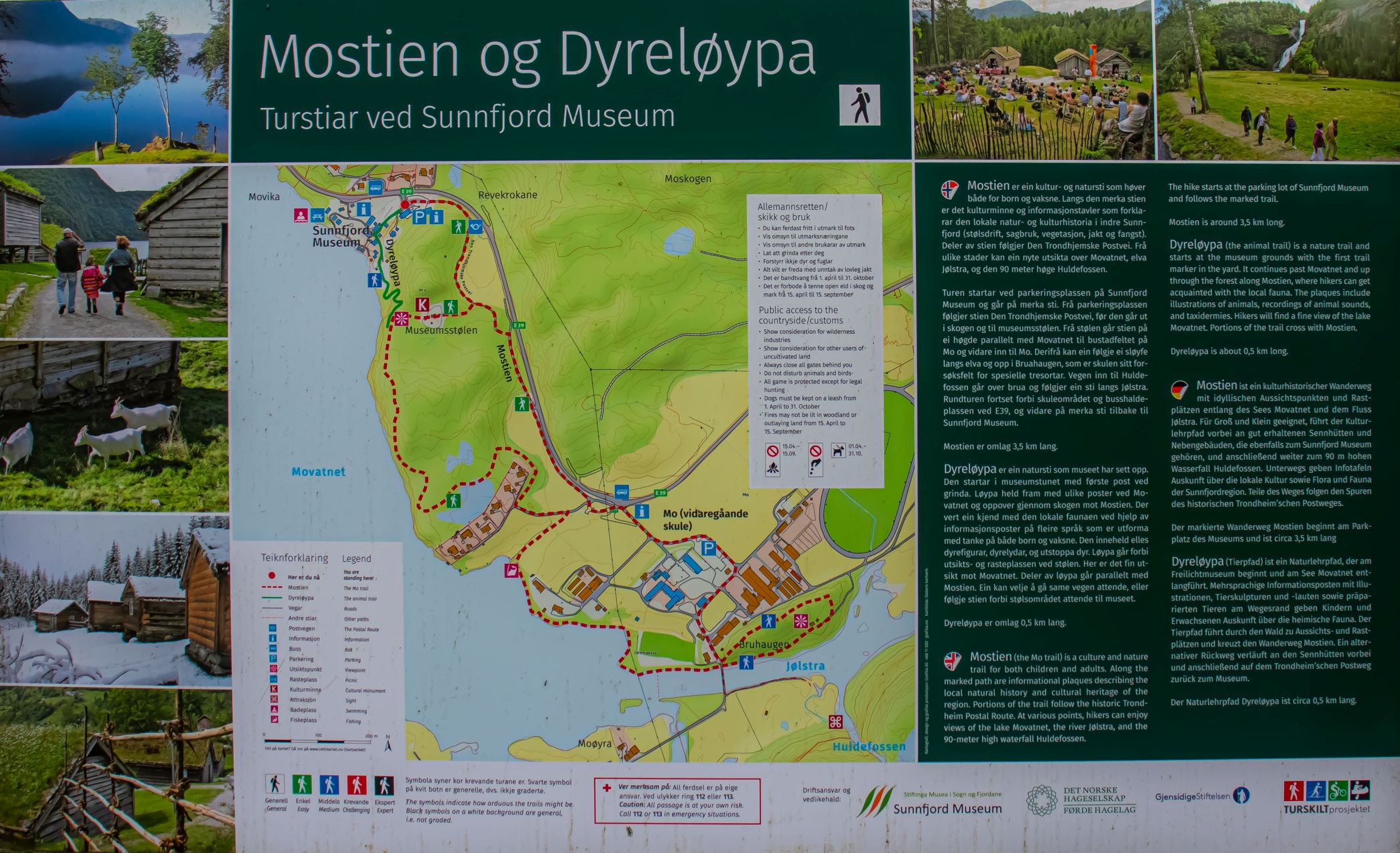 Szlak zaczyna się na parkingu przy Sunnfjord Museum i prowadzi wyraźnie oznakowaną ścieżką. Z parkingu trasa podąża Trondheim Postal Route, a następnie wchodzi do lasu i prowadzi w górę do pasterskiej chaty muzealnej. Stamtąd biegnie równolegle do jeziora Movatnet w kierunku osiedla Mo i szkoły rolniczej. Szlak do 90-metrowy wodospadu Huldefossen przebiega przez most, a następnie podąża wzdłuż rzeki Jølstra. Ze szkoły rolniczej można wrócić tą samą trasą do Sunnfjord Museum.