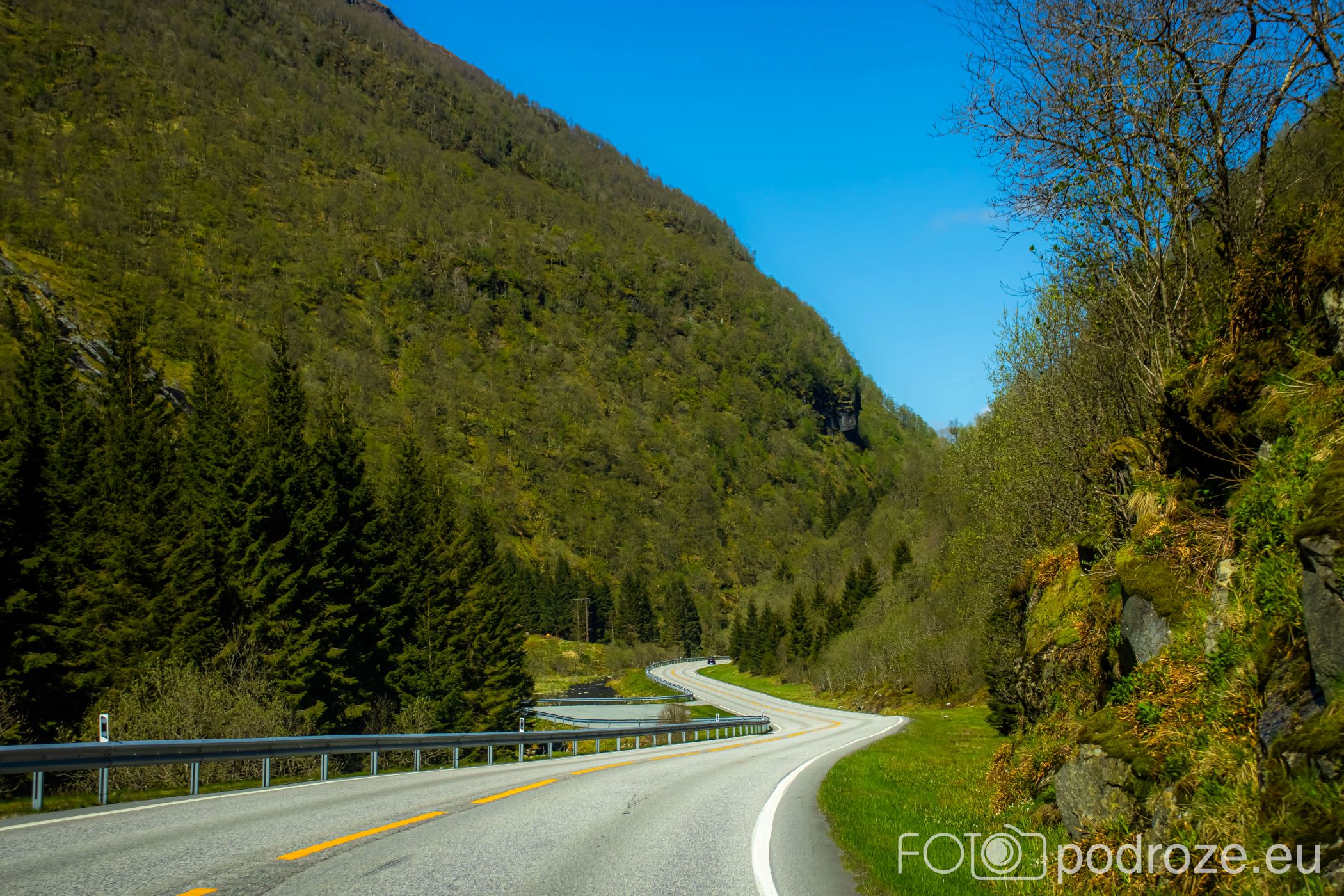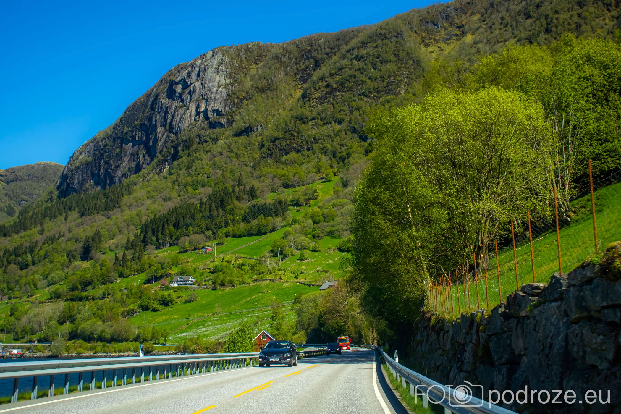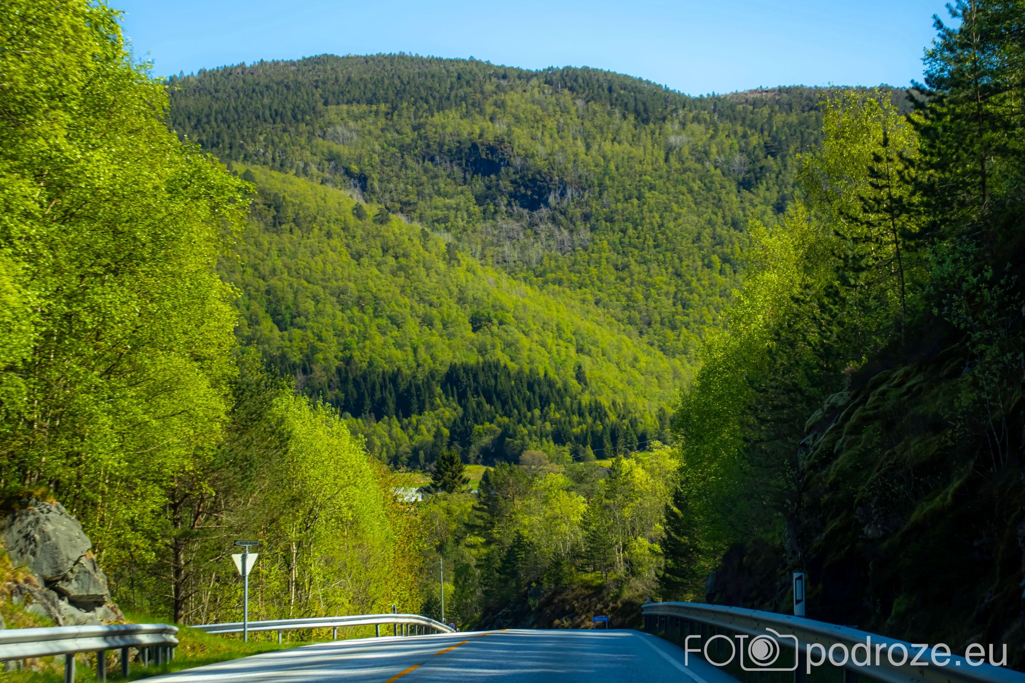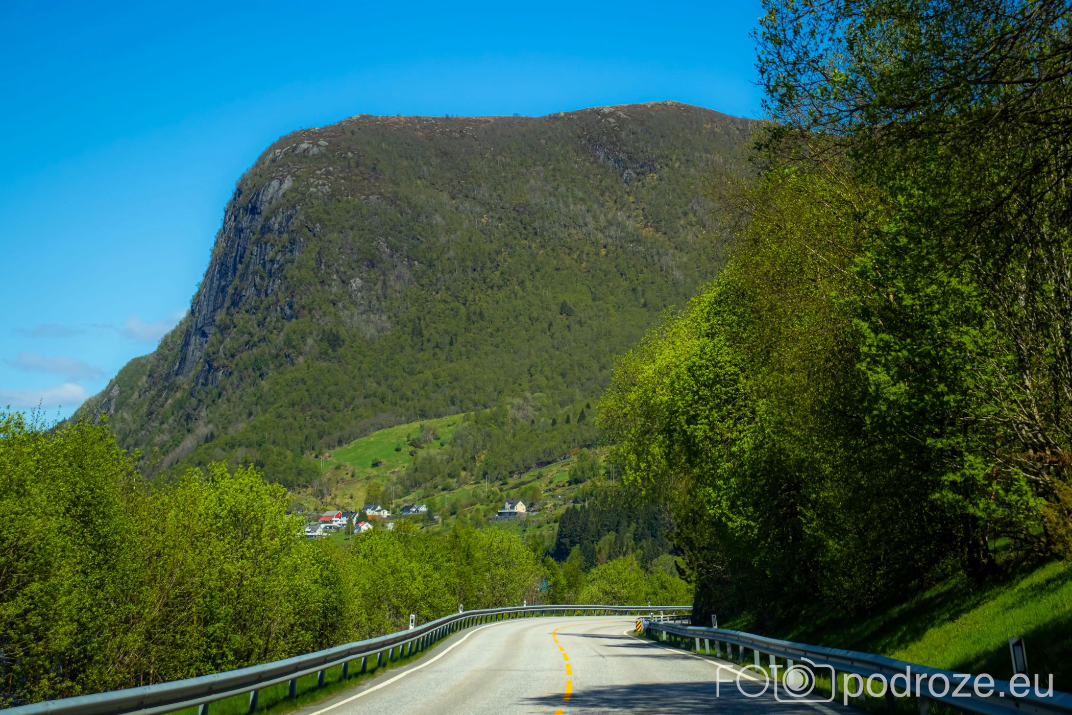 Ostatni odcinek drogi dojazdowej do fiordu główną szosą łączącą Bergen z Forde jest wyjątkowo malowniczy i prawie całkowicie pozbawiony jakiejkolwiek zabudowy. Taki piękny, dziki, zielony krajobraz.