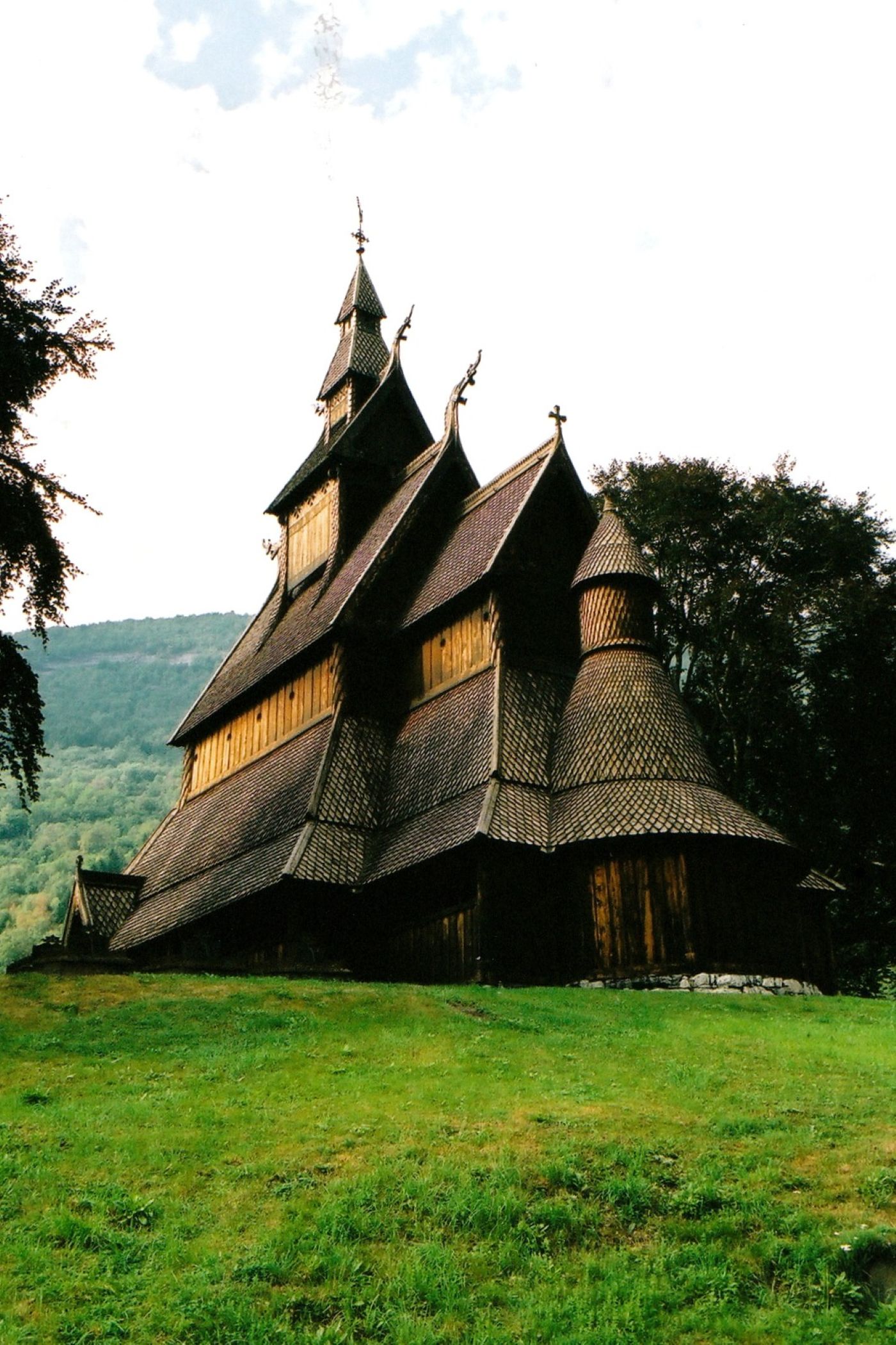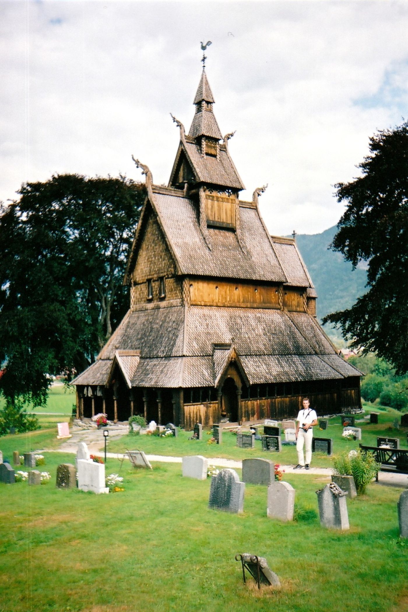Teraz przeskakujemy do środkowej części fiordu, gdzie zawitaliśmy w 2002 roku. Zatrzymaliśmy się wtedy przy jednym ze słynniejszych i piękniejszych kościółków. Hopperstad Stave Church to jeden z najlepiej zachowanych kościołów klepkowych w Norwegii, położony w miejscowości Vik nad Sognefjorden. Świątynia została zbudowana około 1130 roku, co czyni ją jednym z najstarszych tego typu obiektów w kraju. W XIX wieku była bliska zniszczenia, jednak została uratowana i odrestaurowana przez konserwatora Petera Andreasa Blixa, który przywrócił jej dawny wygląd.