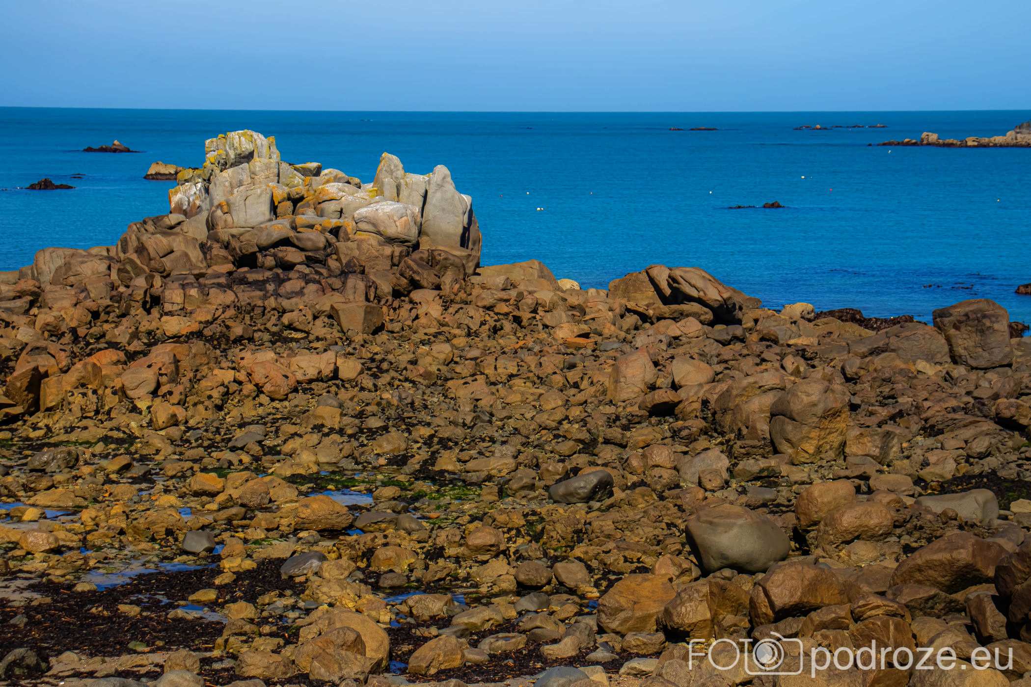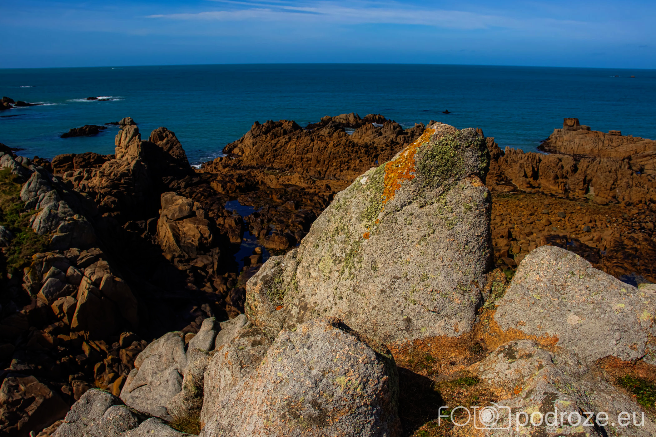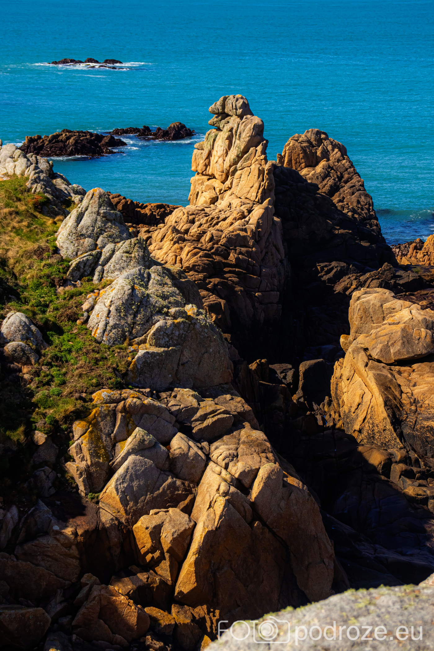 Jadąc dalej na zachód miniemy kolejne niesamowite fragmenty wybrzeża. Tu znajdują się jedne z najbardziej charakterystycznych formacji skalnych na wyspie: Monkey and Camel Rocks oraz Lions Rock. Te naturalnie ukształtowane granitowe skały, wyrzeźbione przez wiatr i wodę, przypominają sylwetki zwierząt, od których wzięły swoje nazwy. Z odpowiedniego kąta można dostrzec kontur małpy, wielbłąda, a także lwa. My się tych kształtów nie dopatrzyliśmy, ale może widok od zachodu nie był najlepszy. Skały są łatwo dostępne z pobliskich ścieżek przybrzeżnych i stanowią ciekawe przystanki na trasie między Grandes Rocques a Cobo Bay.