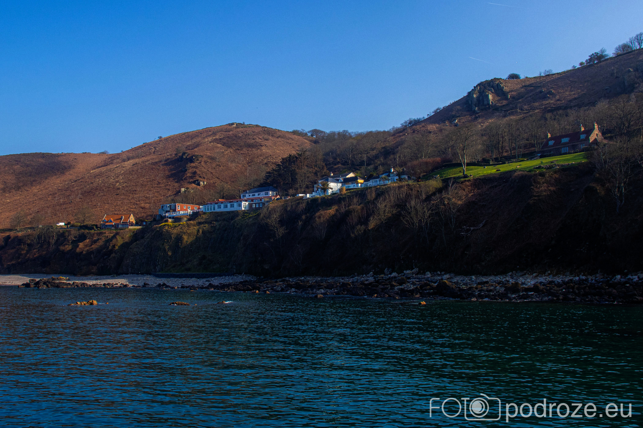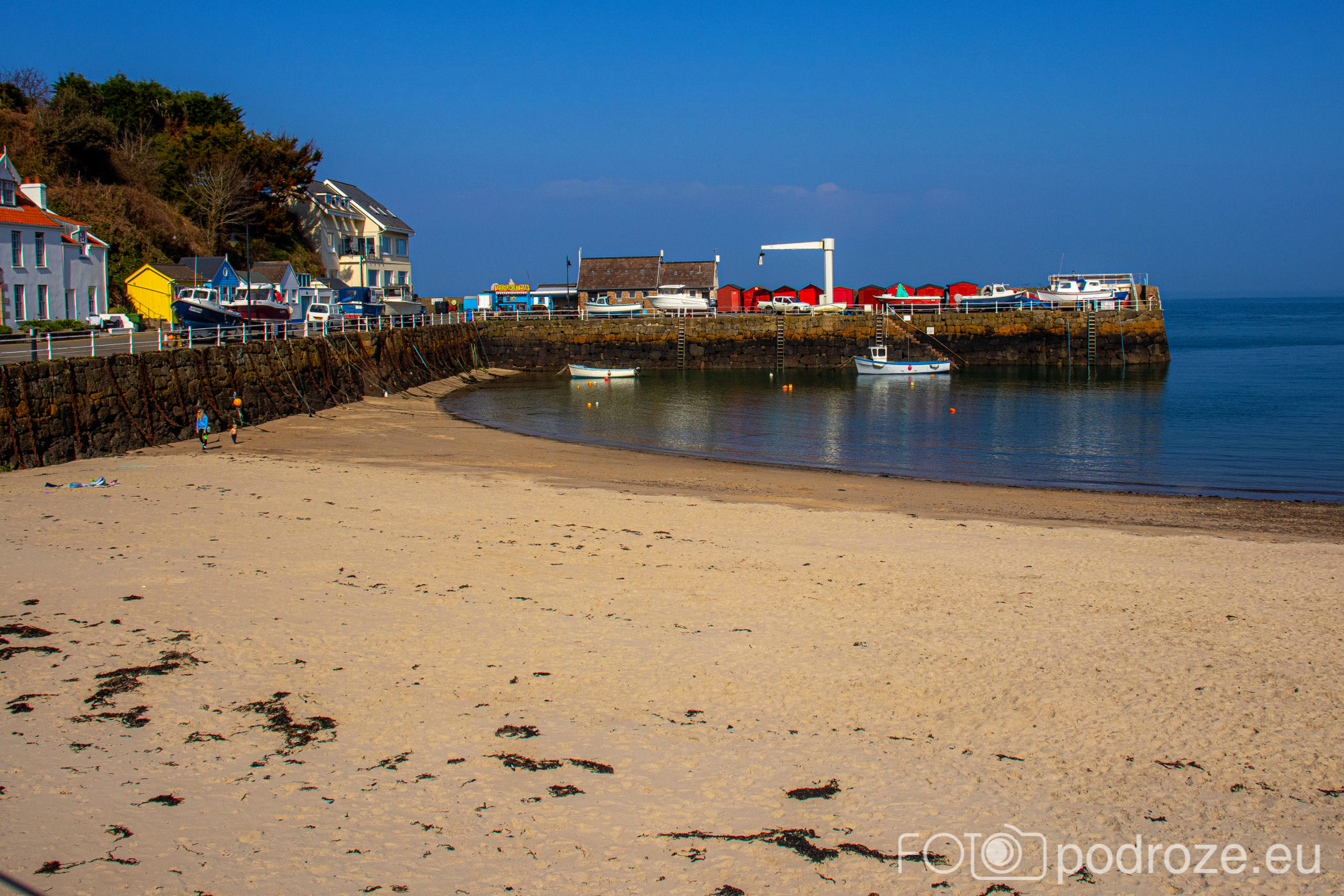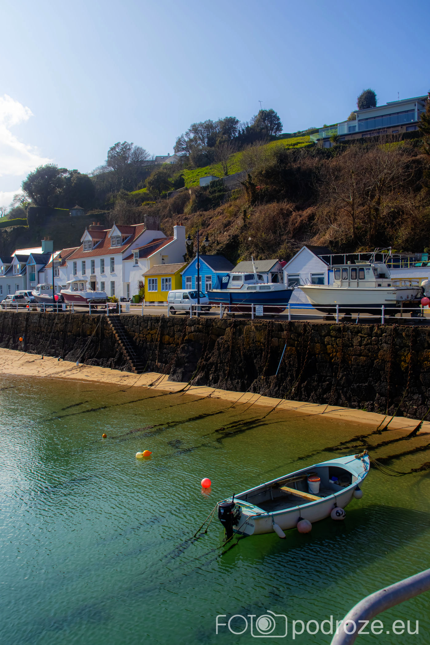 Nasz przewodnik po północnym wybrzeżu zacznę od maleńkiego porciku na wschodzie wybrzeża. Zatoka Rozel (Rozel Bay) to jedno z najbardziej malowniczych i spokojnych miejsc na północnym wybrzeżu Jersey. Ukryta między stromymi klifami, otoczona zielonymi wzgórzami i lasami, ma typową atmosferę małej rybackiej osady. To, co urzeka tu najbardziej to kolorowe, maleńkie drewniane domki przy nabrzeżu, jakże nie pasujące do obrazu bogatej wyspy.