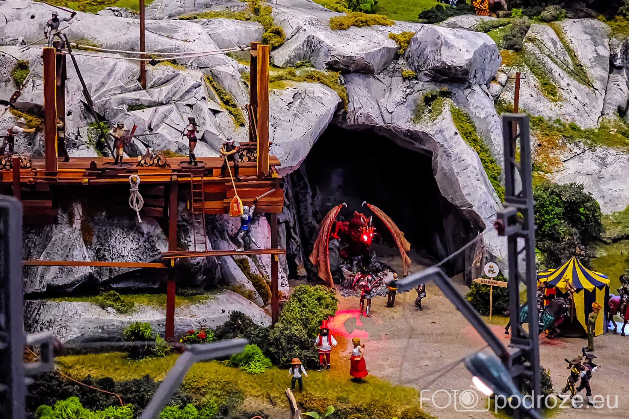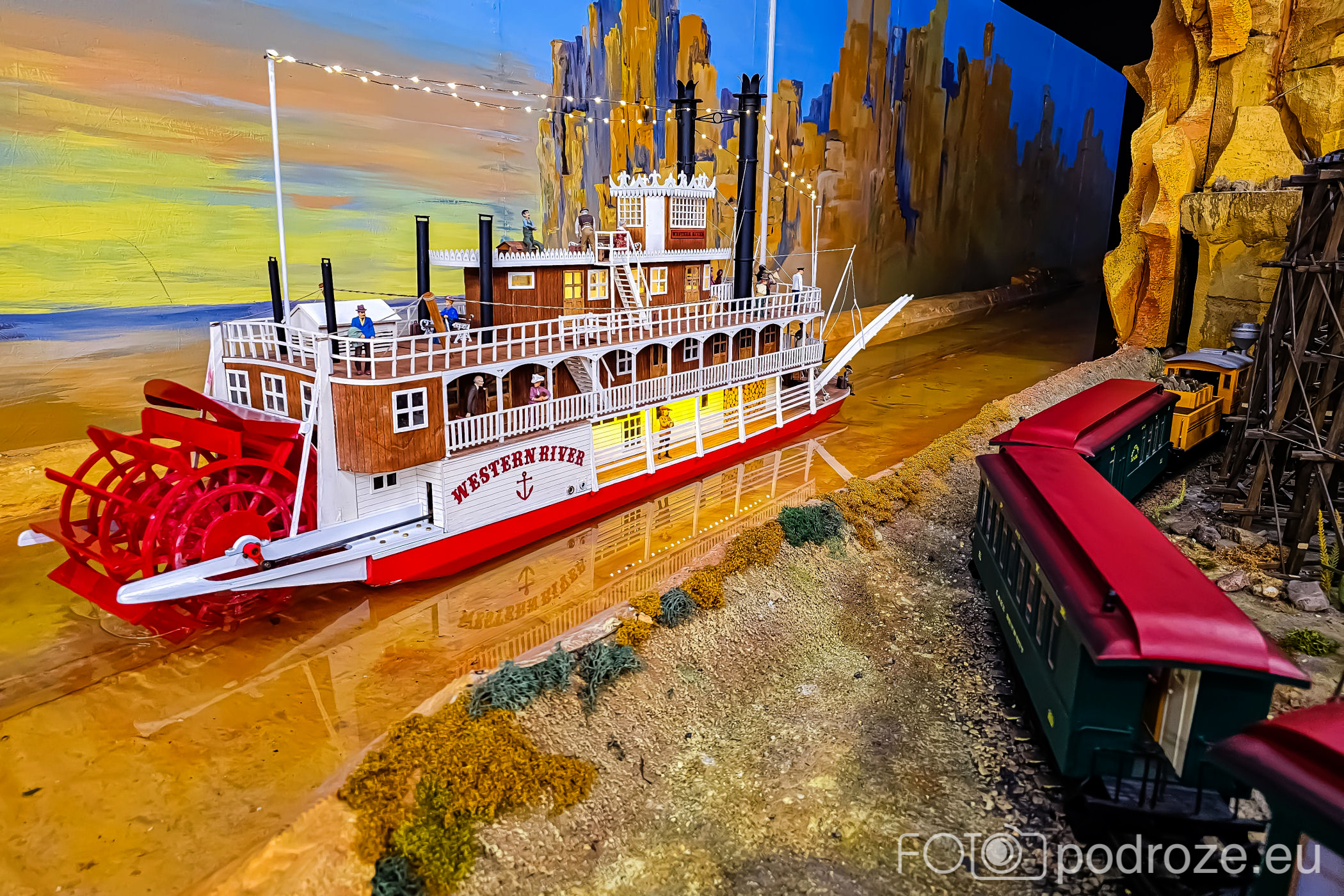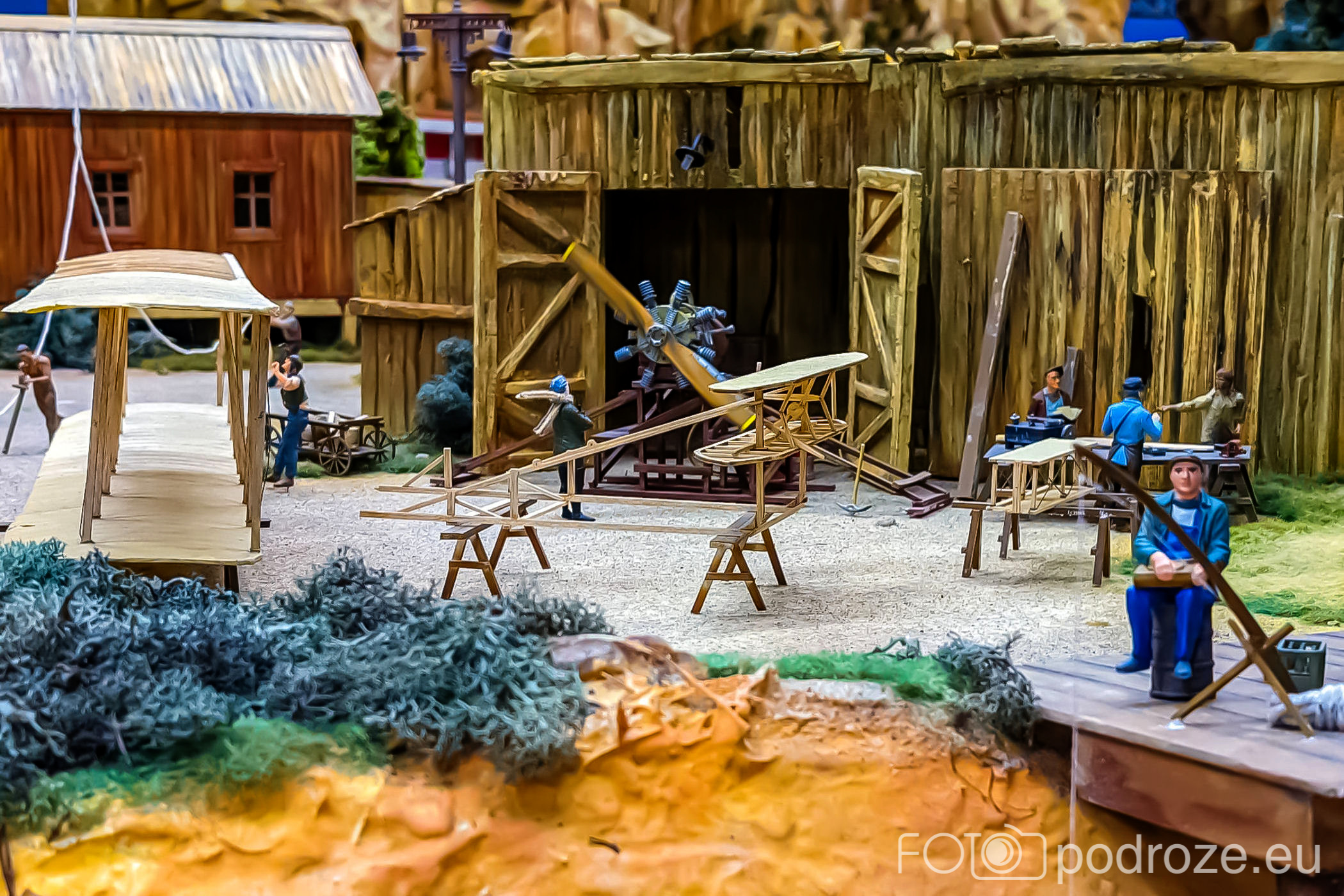 To, co widzimy na parterze, obok miasta z piernika jest troszeczkę chaotyczne. Są tu bowiem dinozaury, jest wojskowa scenka rodzajowa, a potem kopalnia. Jest też wodna makieta ze skałami z dalekiej Azji.