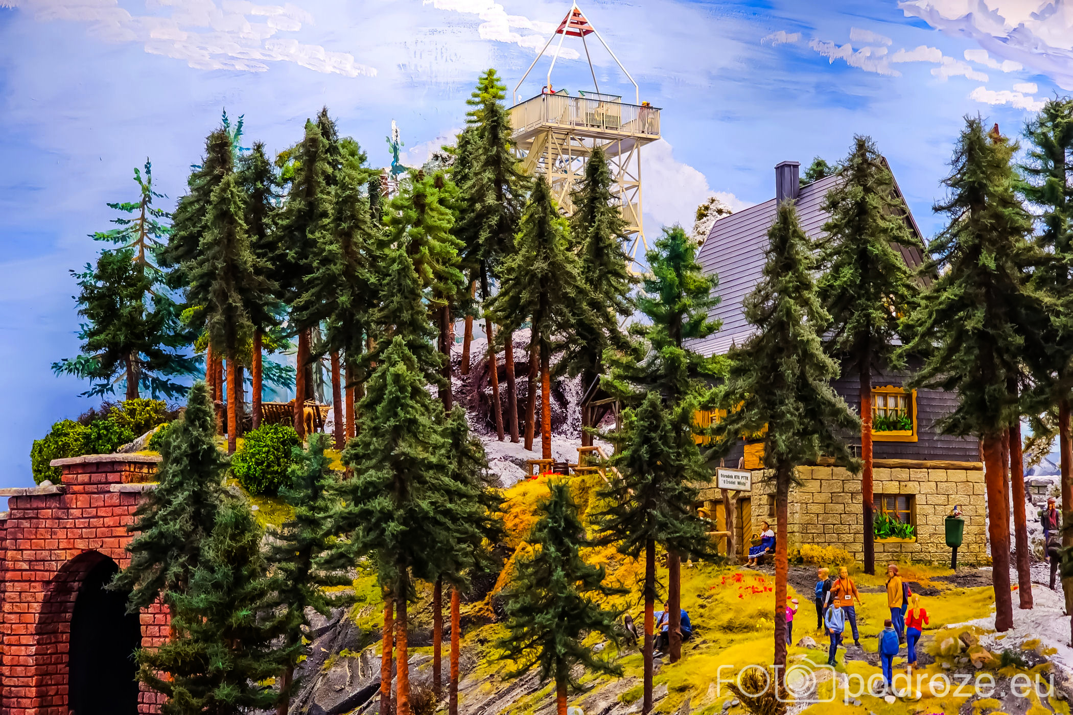 Makieta zrobiona jest niesamowicie, z jednej strony mamy lato, z drugiej zimę. Oczywiście jak w całym Kolejkowie są tu także pory dnia, nagle więc rozświetlają się lampy i budynki, a góry toną w półmroku .