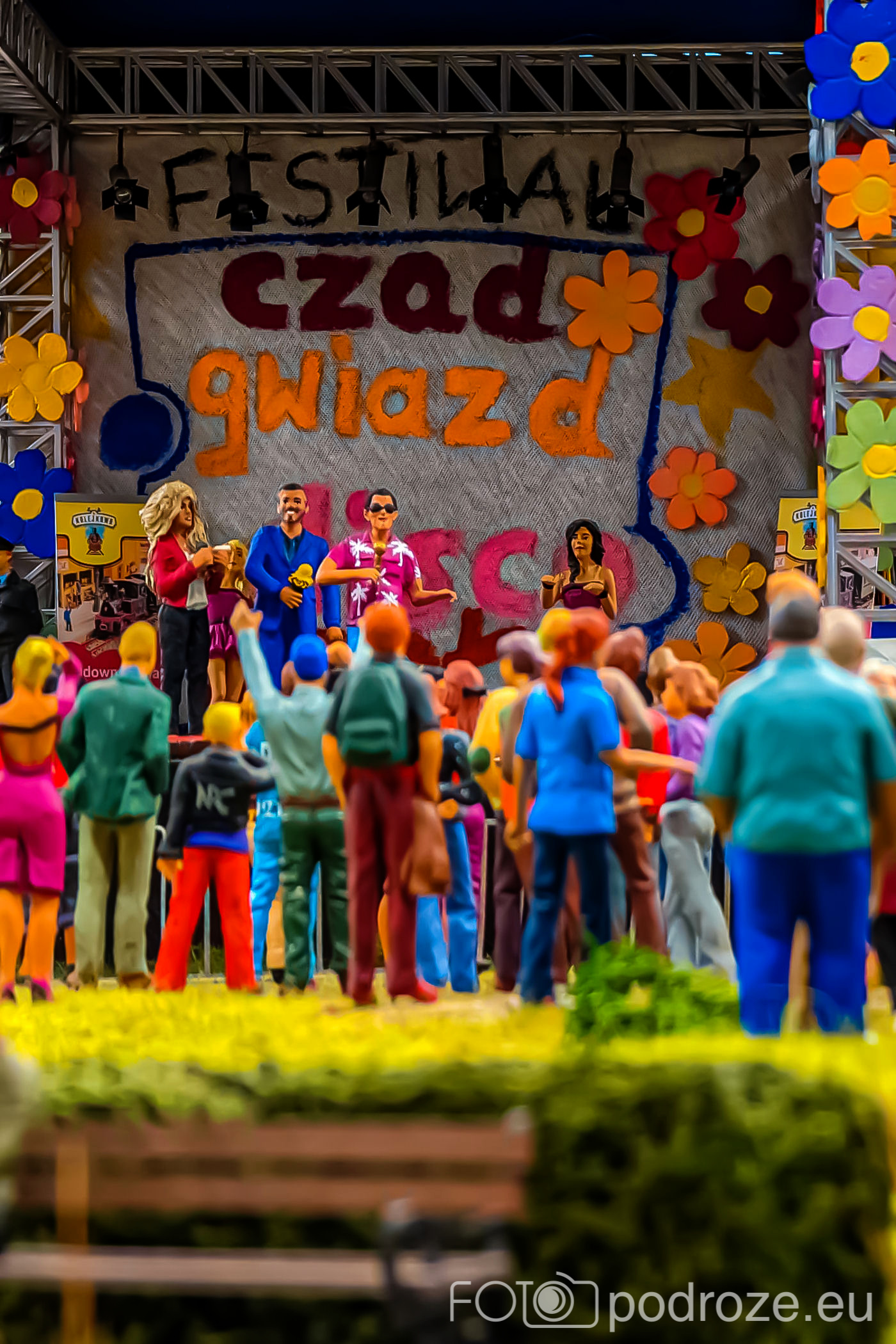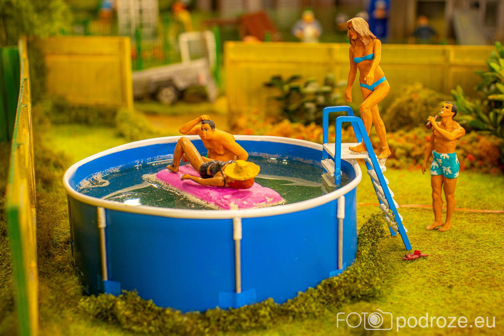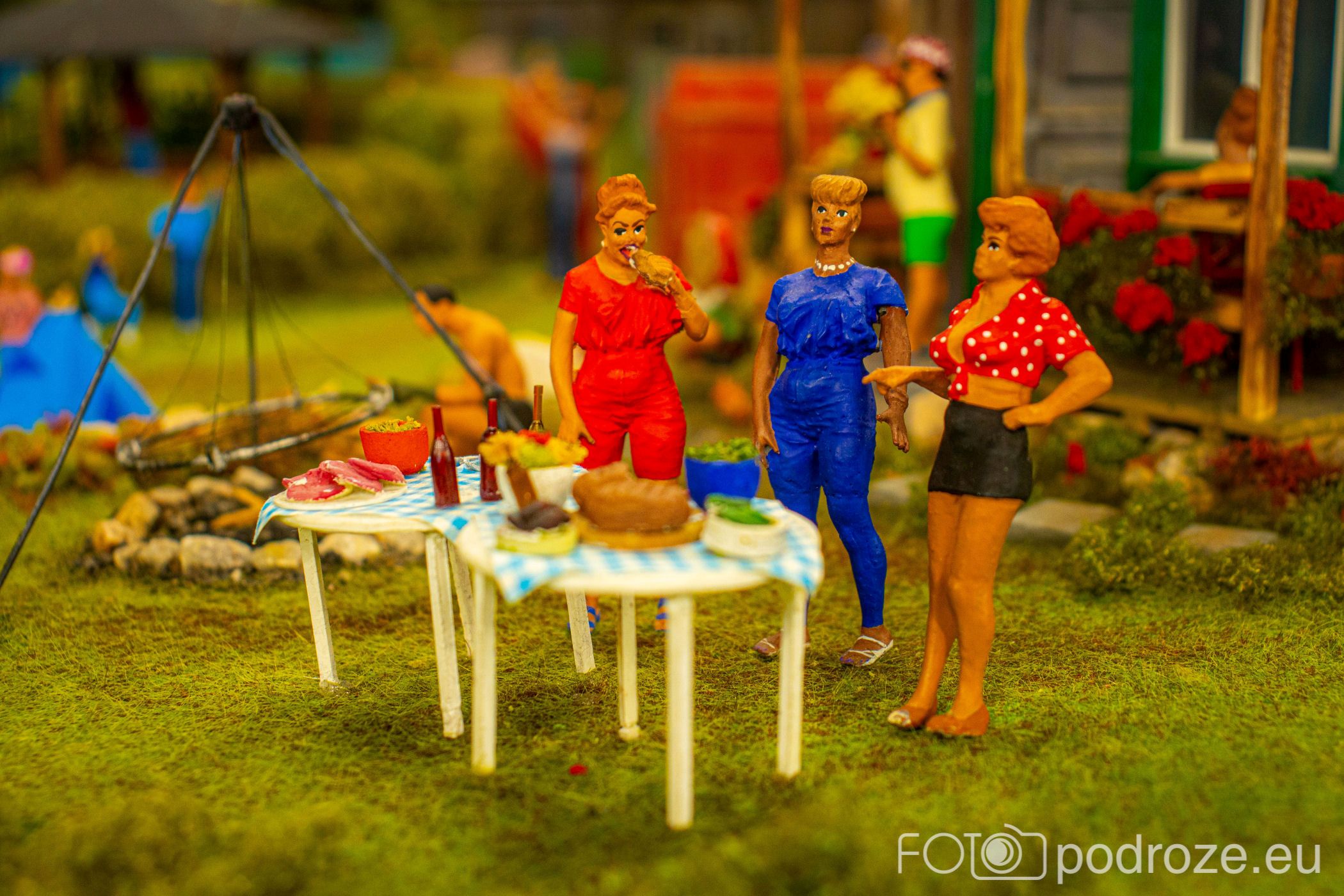 Ostatnia ogromna makieta to wyjątkowo ciekawy rejon. Mamy tu Zamek w Będzinie na wysokiej skale, pod nim odbywa się właśnie turniej rycerski. Po prawej stronie zamku jest piękny zalew, gdzie właśnie jest szczyt sezonu letniego, bo plaża zapełniona, a na wodzie jednostki pływające. Wokół oczywiście, jak przystało na Kolejkowo, jeździ kolejka. Na skałach wspinacze, na drodze turyści. Tętni tu wakacyjne życie. Jest na co popatrzeć.