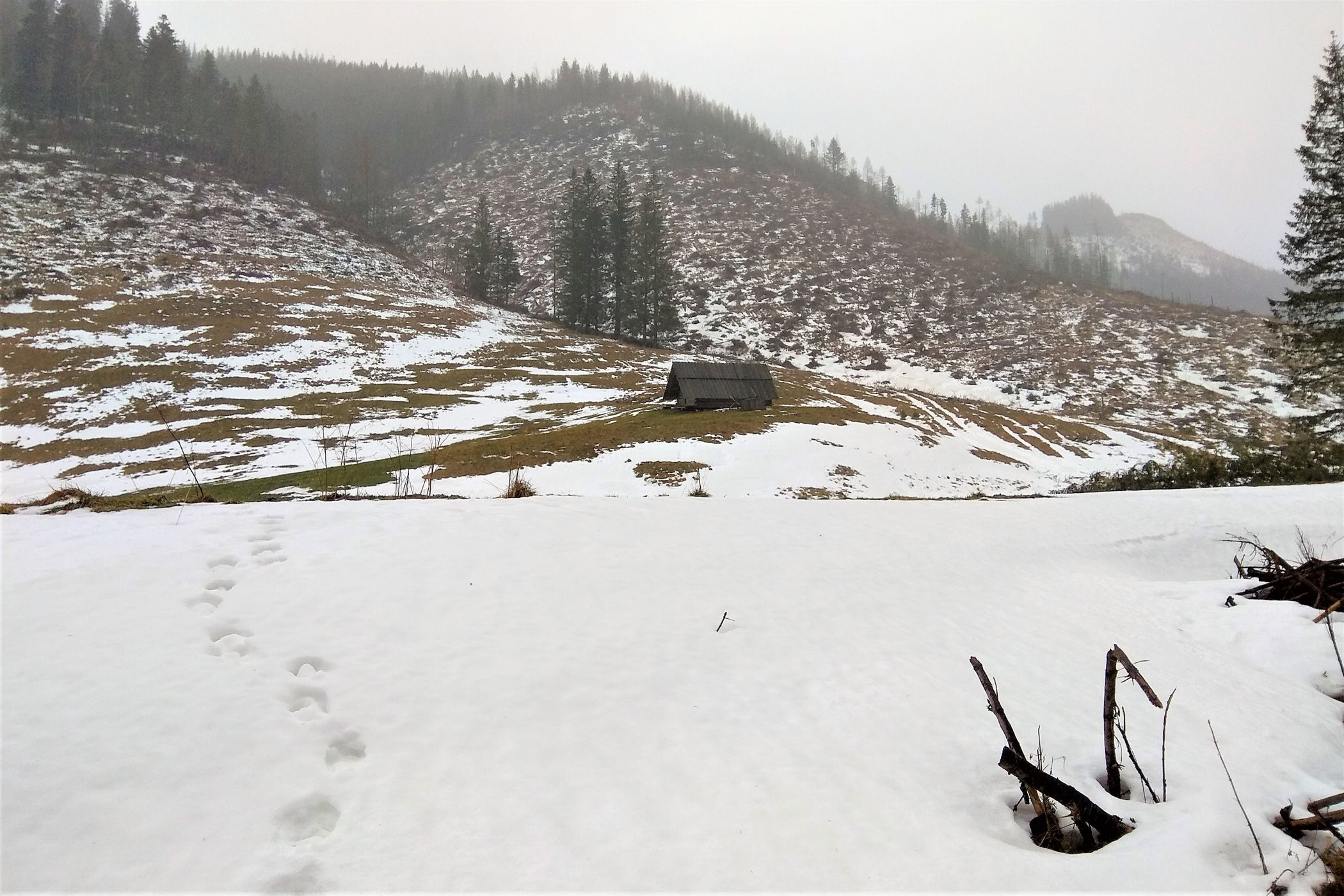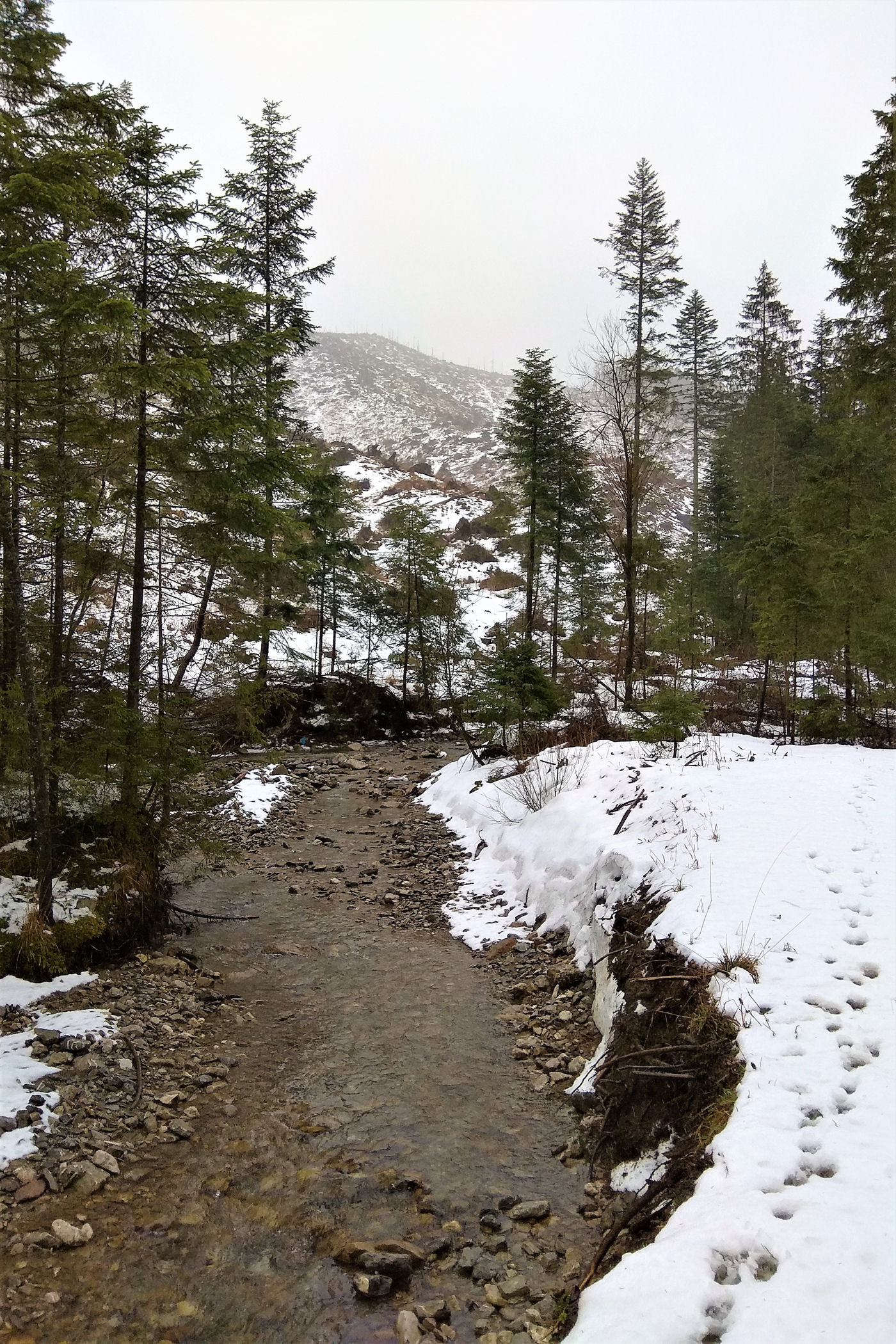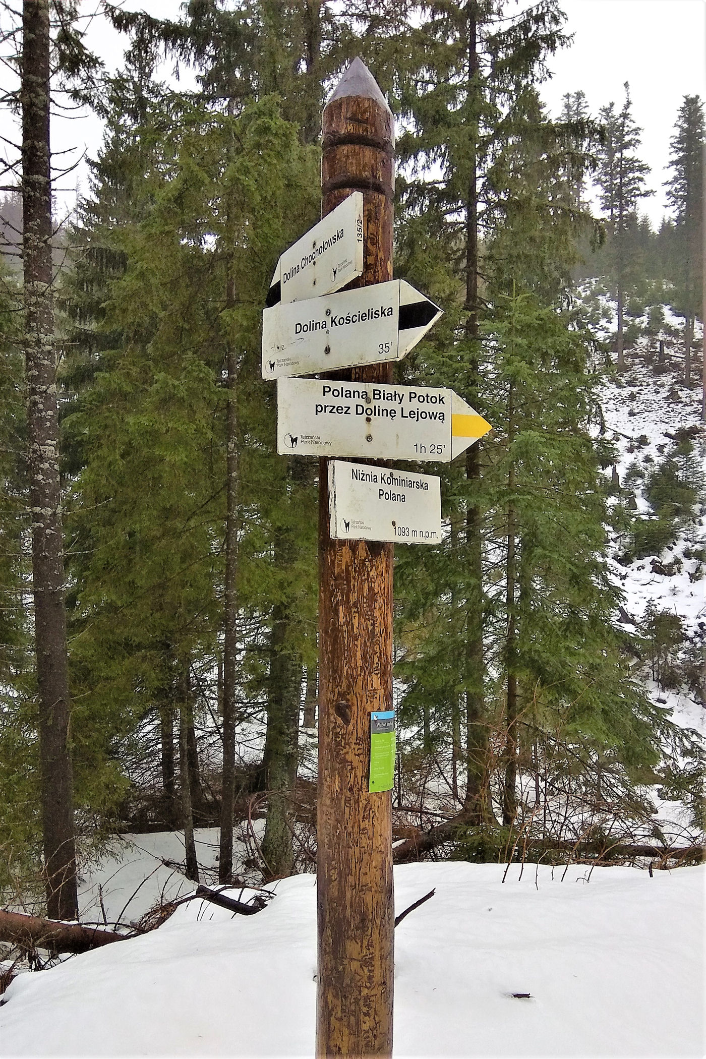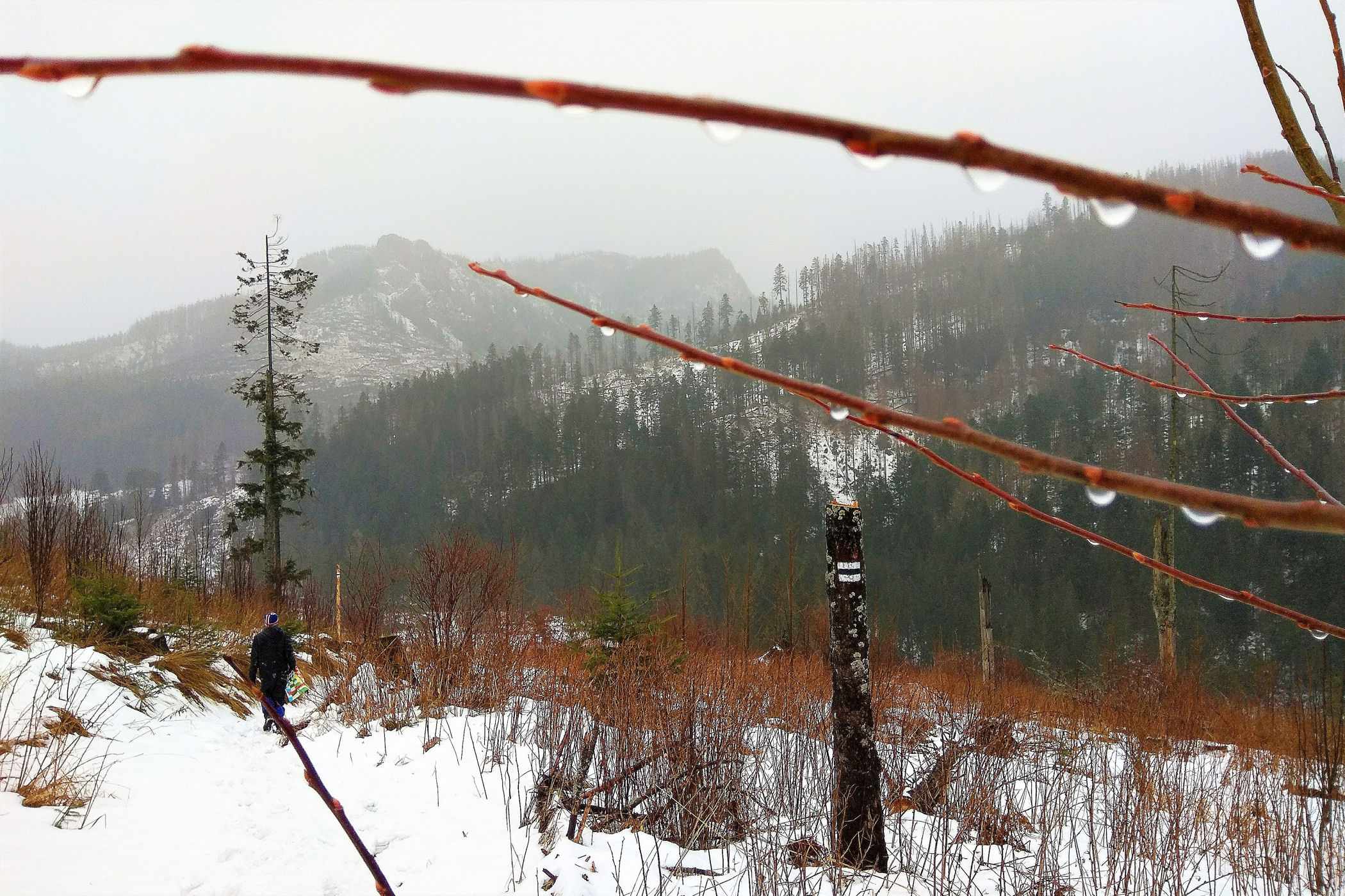 Wigilijna pogoda nas nie rozpieszcza, nagłe ocieplenie, rozmokły śnieg, a do tego cały dzień siąpiący deszcz. Około 11.30 ruszamy z naszego pensjonatu w Kirach w kierunku zachodnim . Pierwszy odcinek szlaku trzeba niestety pokonać ruchliwa drogą, ale już kawałek dalej jesteśmy w lesie i u wlotu Doliny Lejowej . To jedna z najmniej ciekawych dolin tatrzańskich, ale przy dzisiejszej pogodzie jest to w zasadzie bez znaczenia. Na Niżnej Kominiarskiej Polanie robimy sobie mały postój na świąteczne pierniki i herbatkę a następnie drogą Nad Reglami kierujemy się tak jak wczoraj do Doliny Kościeliskiej.