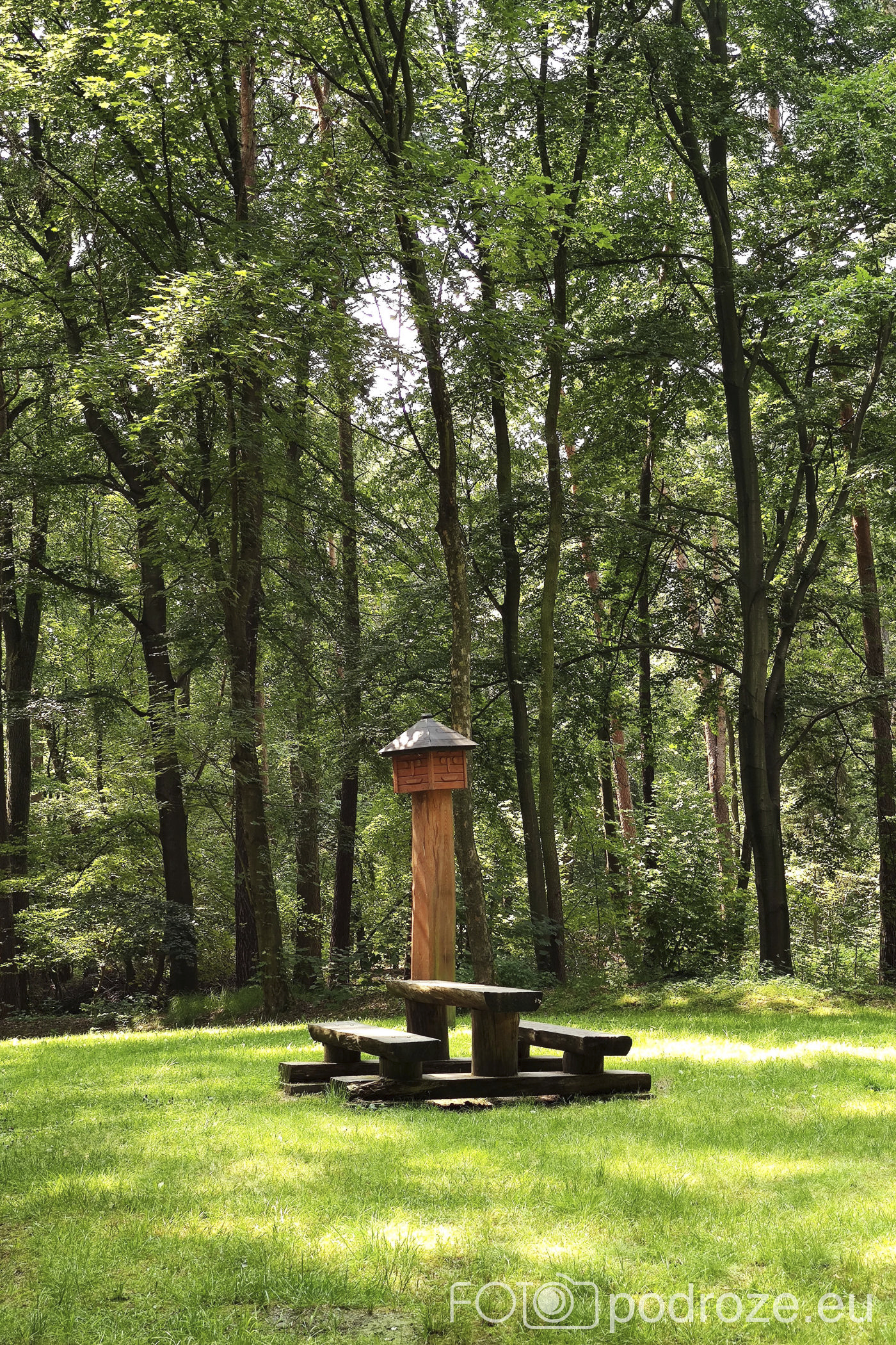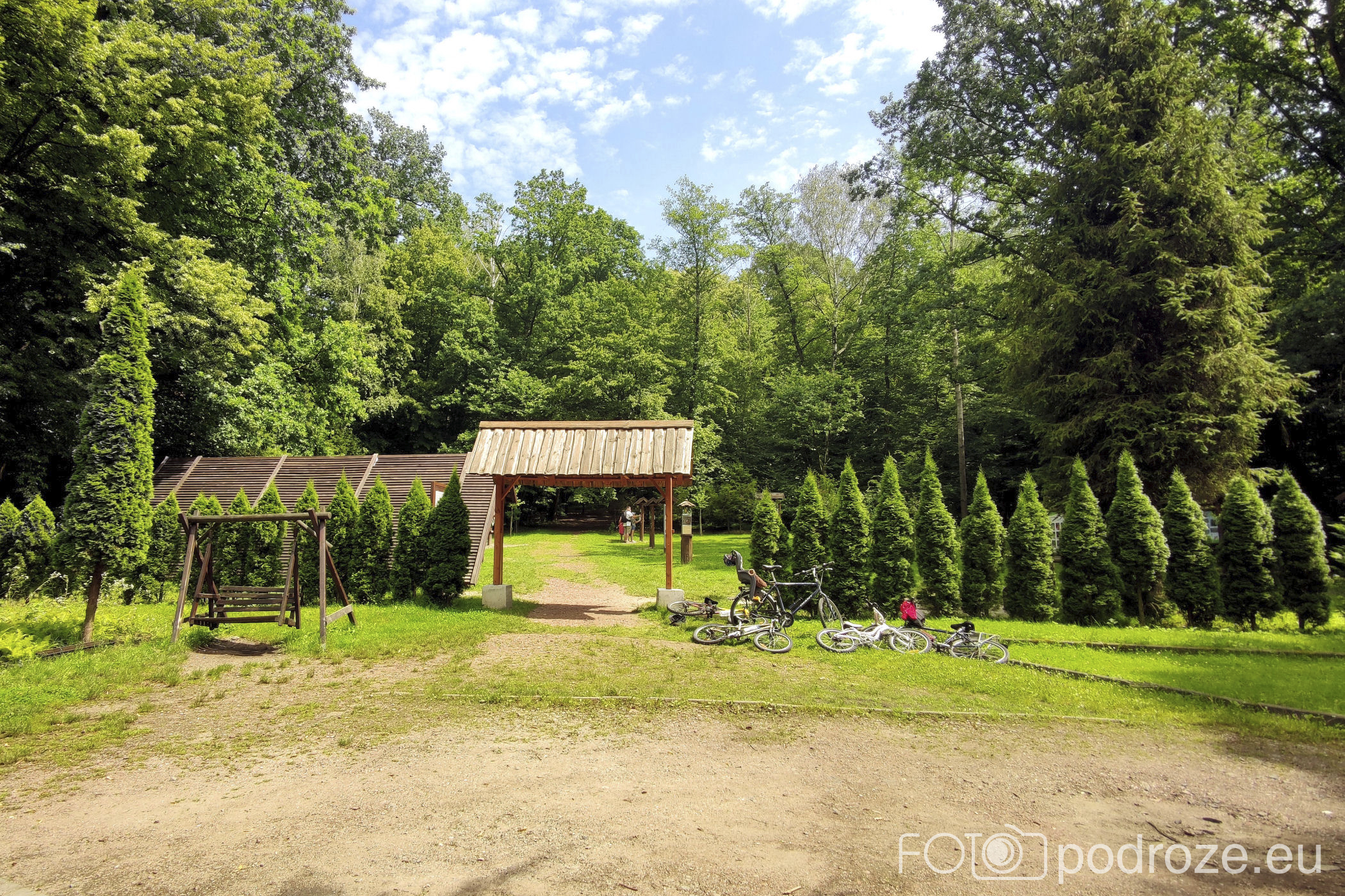 Teraz wędrujemy wgłąb lasu. Prowadzi przez niego mnóstwo ścieżek i szlaków. Na polanach znajdują się miejsca odpoczynku i ciekawe edukacyjne kompozycje i budowle. Możemy poszukać w lesie Studni Książęcej, potoku z kołem wodnym, albo stawów. Na terenie kompleksu zostało także odnalezione Cmentarzysko Kurchanowe. O tym odkryciu poczytamy na tablicy informacyjnej.