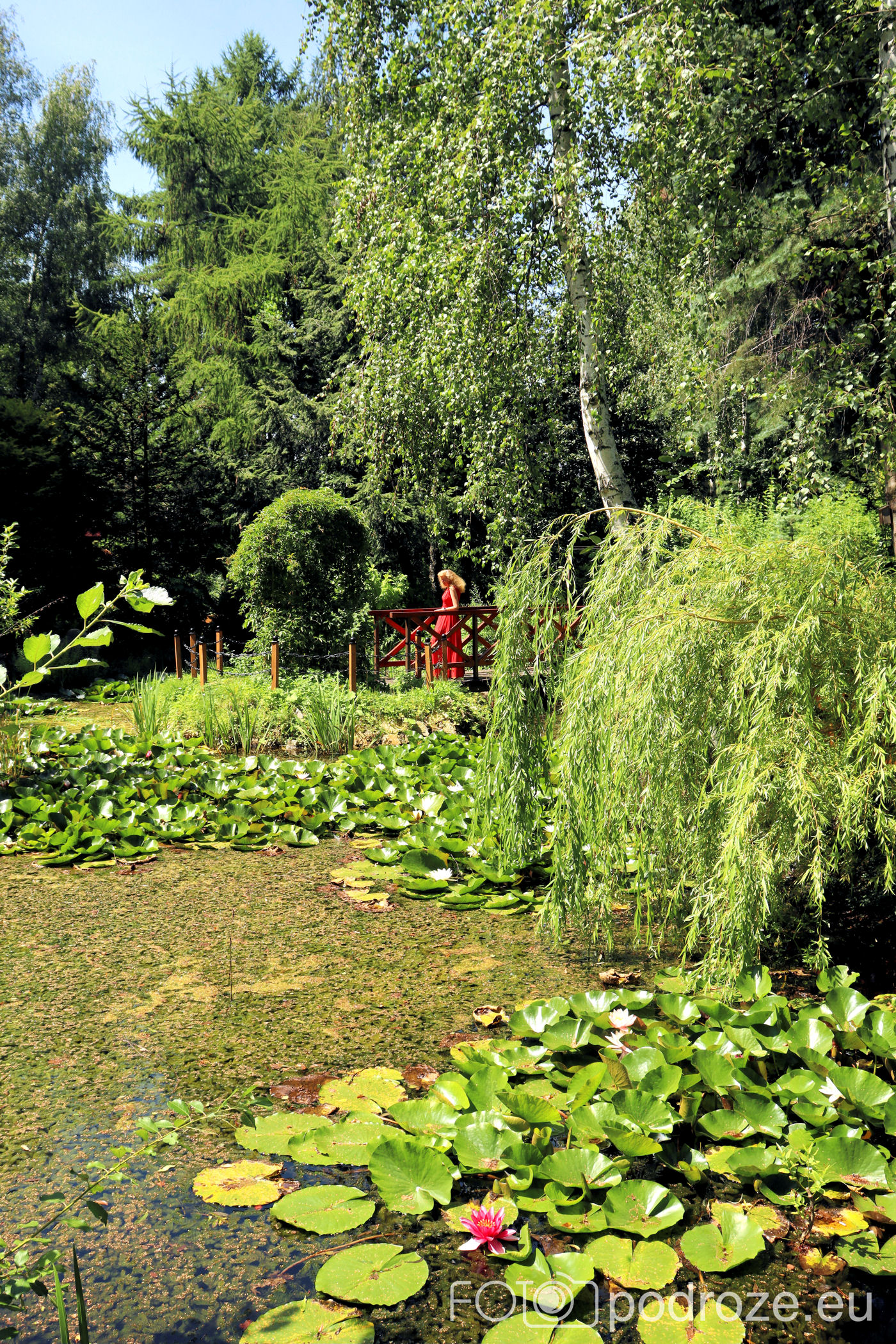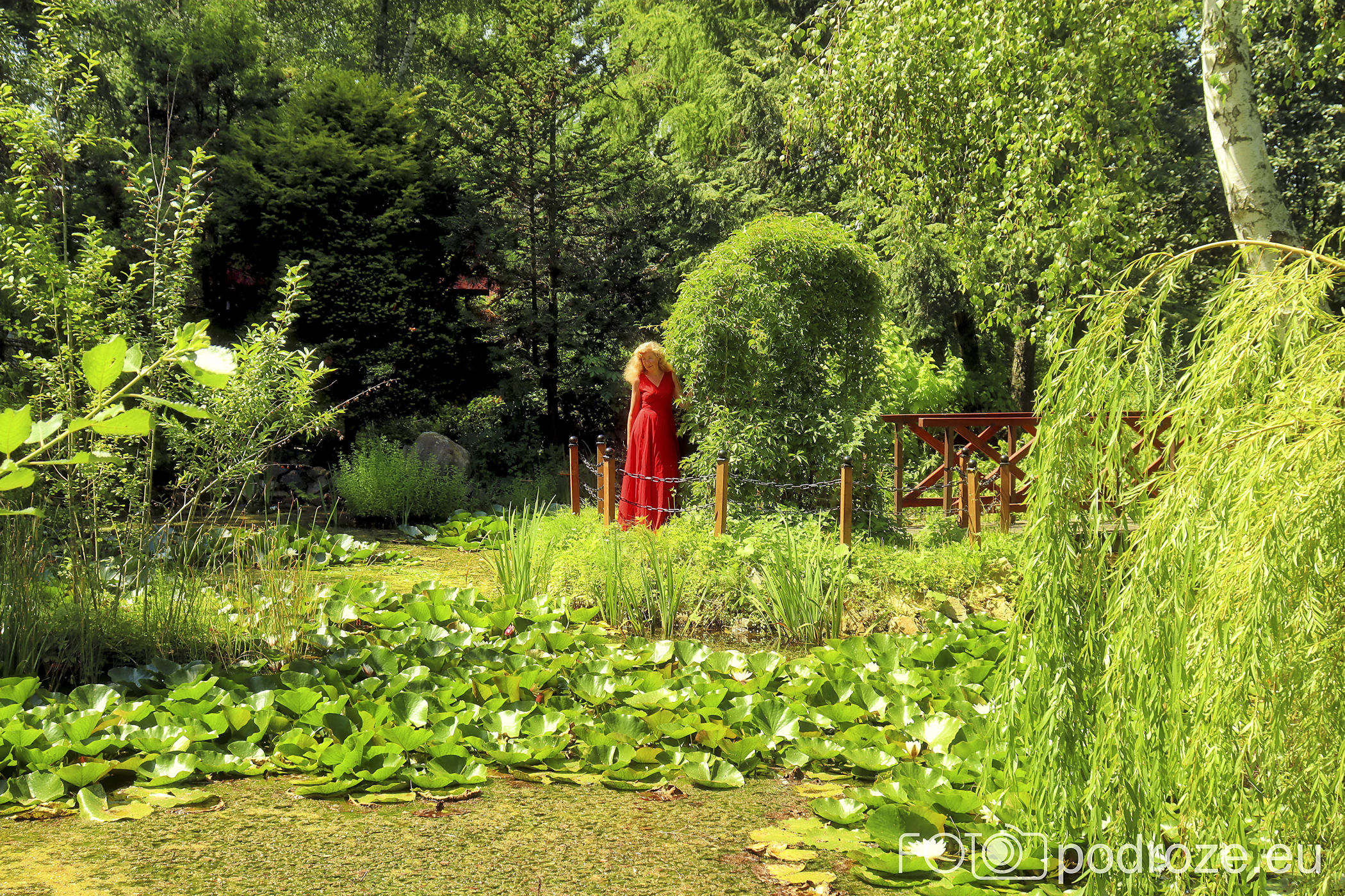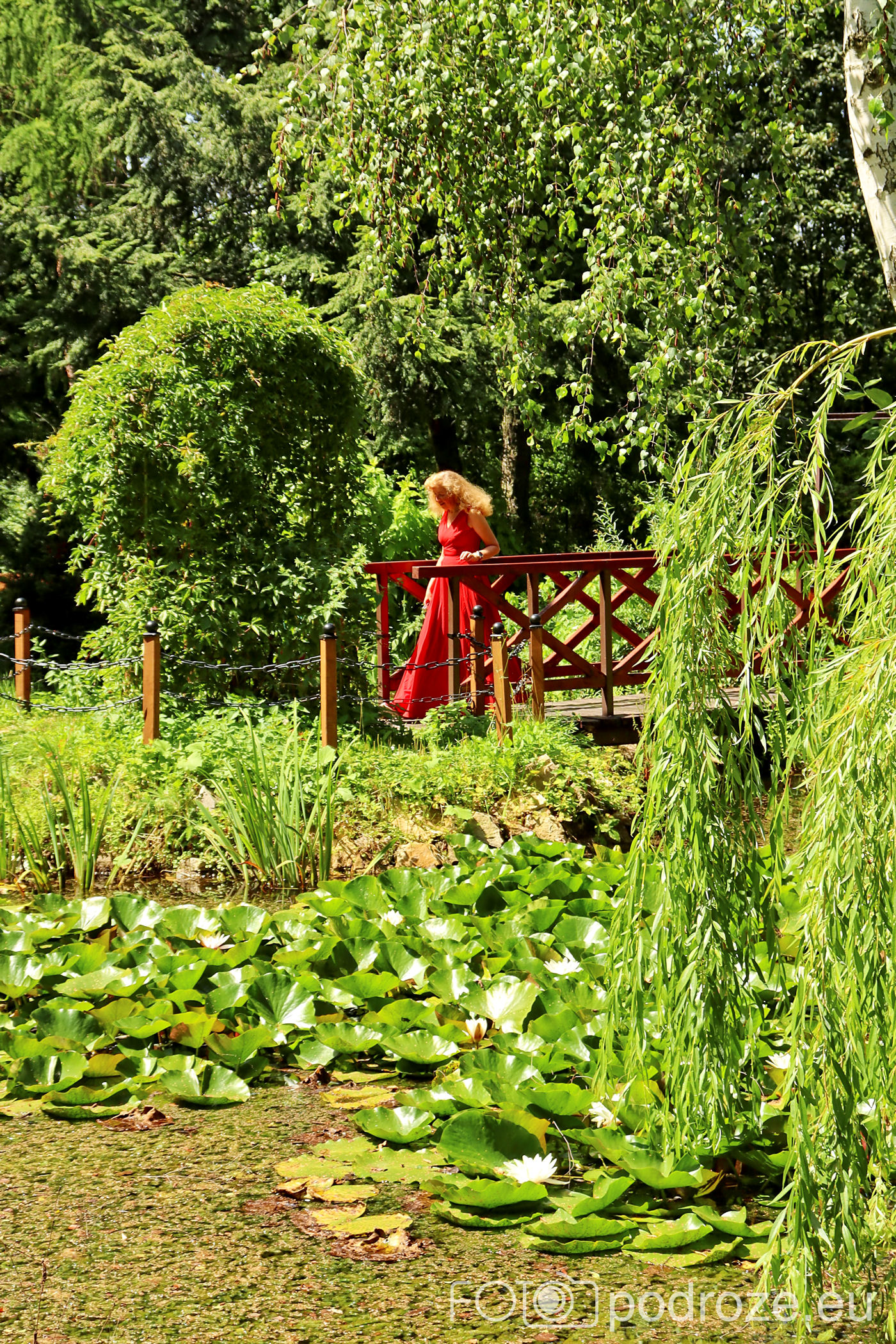 Stawy i roślinność wodna to nieodłączna część większości ogrodów . Tu jedna zostały przygotowane w sposób wyjątkowo malowniczy . Idealne tło dla sesji zdjęciowych , pojawiła się więc sesja z serii #wczerwieniprzezświat.