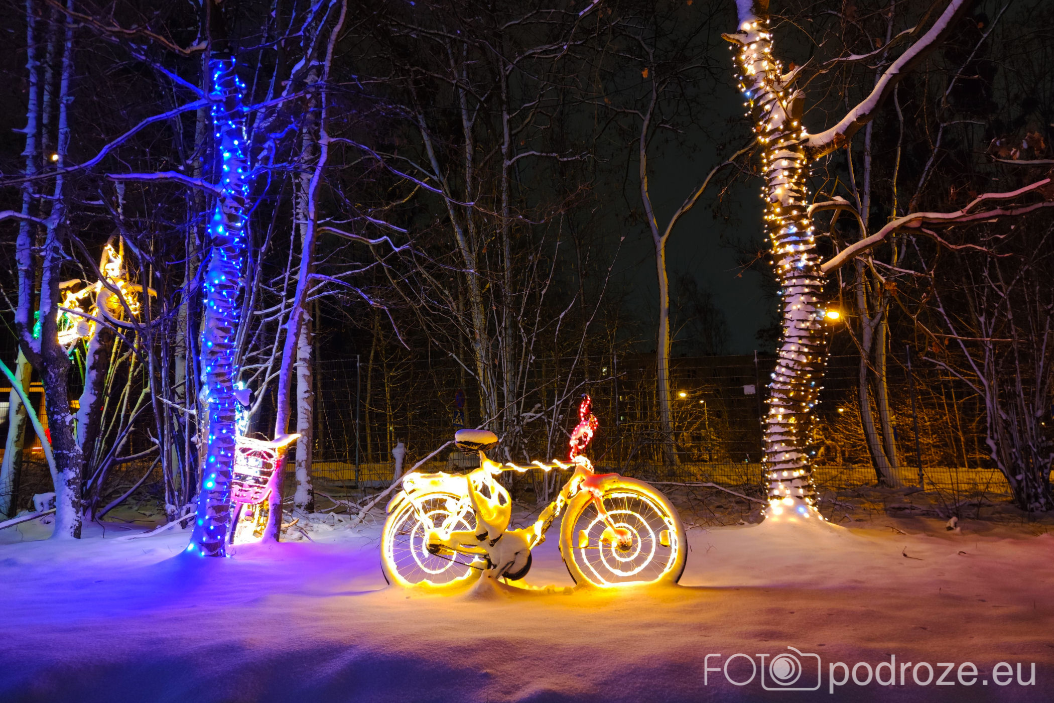 Tuż obok wejścia północnego mamy urokliwy las . Podświetlone drzewa, na nich świetlne zwierzaki, a pod nimi rowery. Rowery znajdziemy nie tylko tutaj, patrzcie dalej. Jest ich całkiem sporo, leżą, opierają się o drzewa, a nawet wiszą na nich. Ktoś kto montował / projektował ogrody jest chyba takim zapalonym rowerzystą jak my.