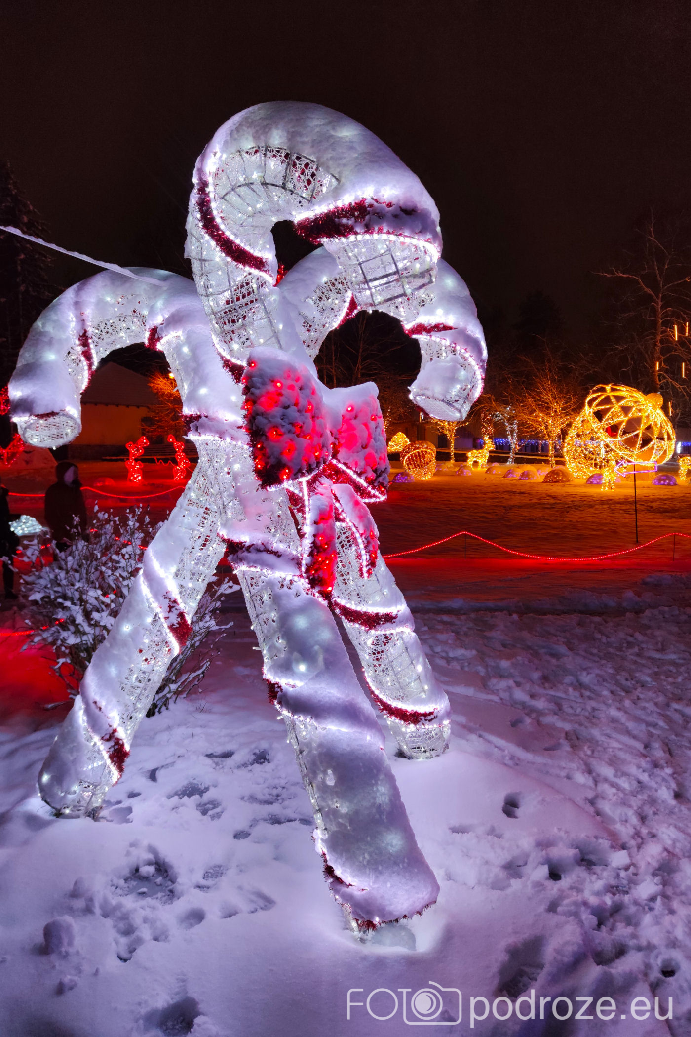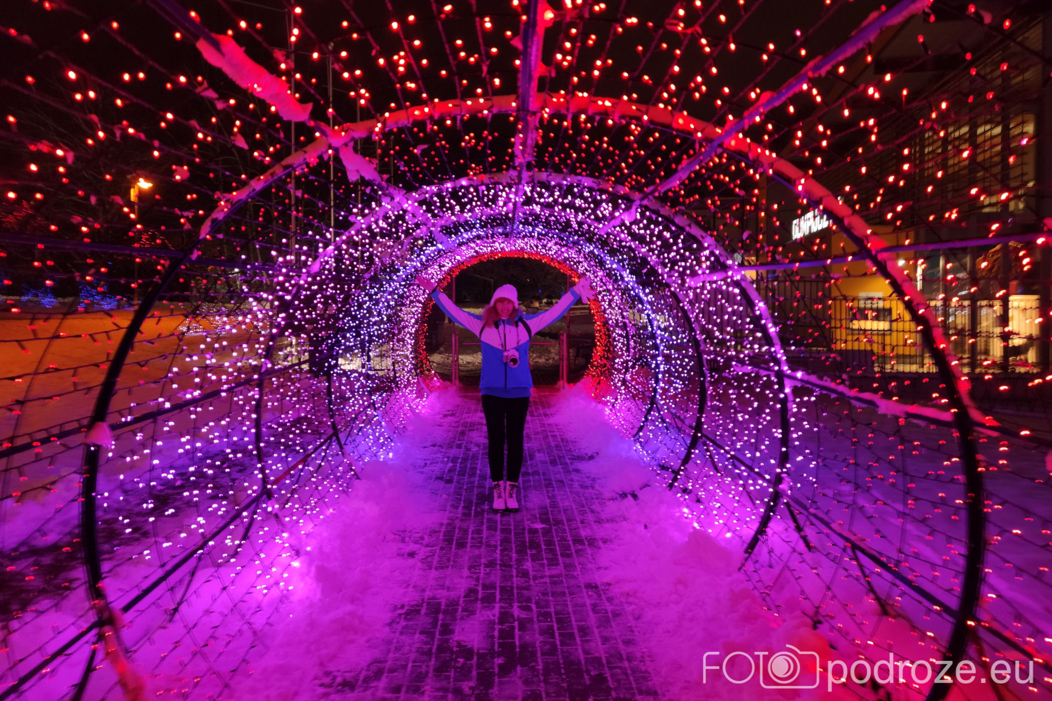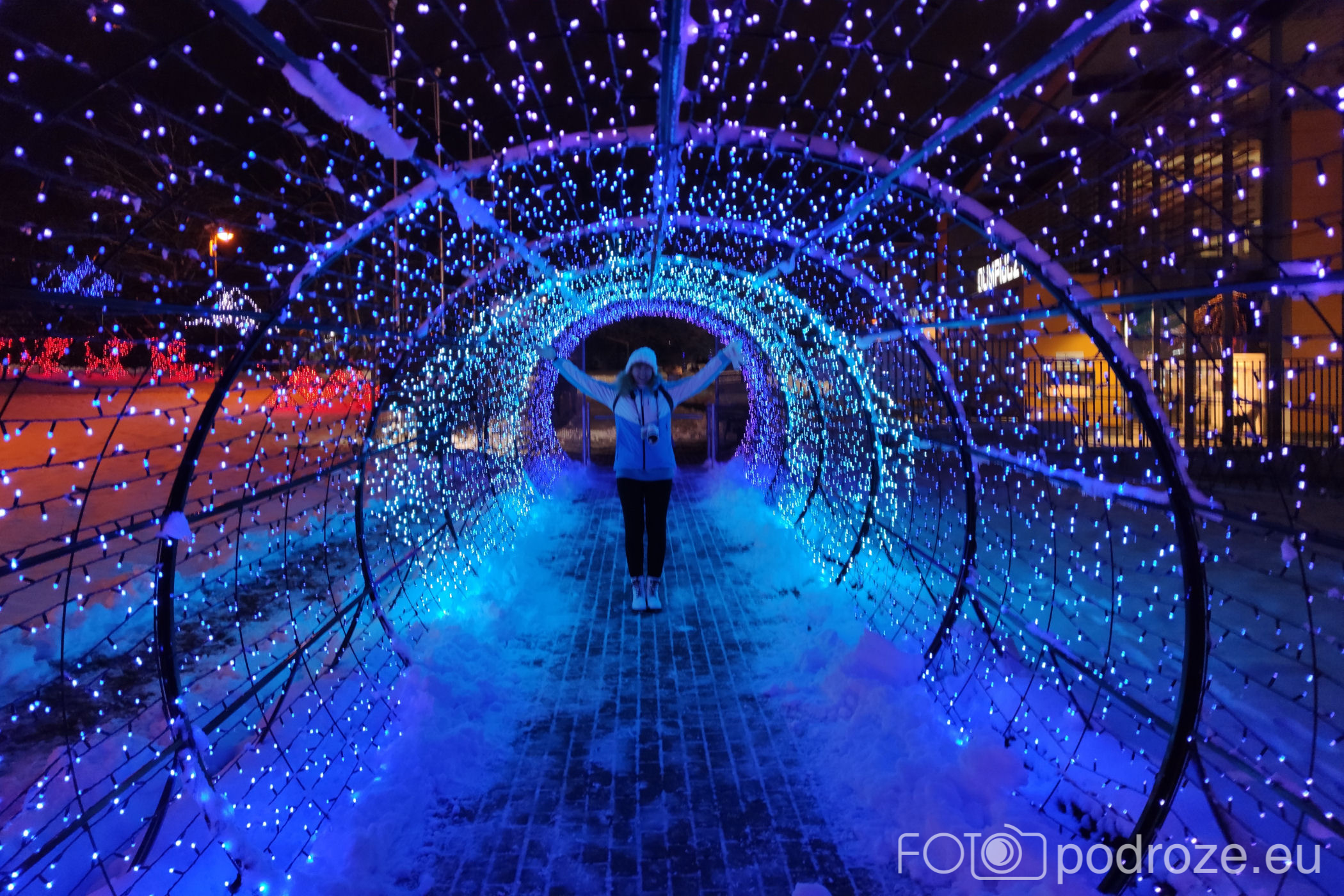 Zanim dojdziemy do pasa startowego, wzdłuż płota prowadzą nas oświetlone drzewa i ciekawa instalacja ze świetlnych kółek.