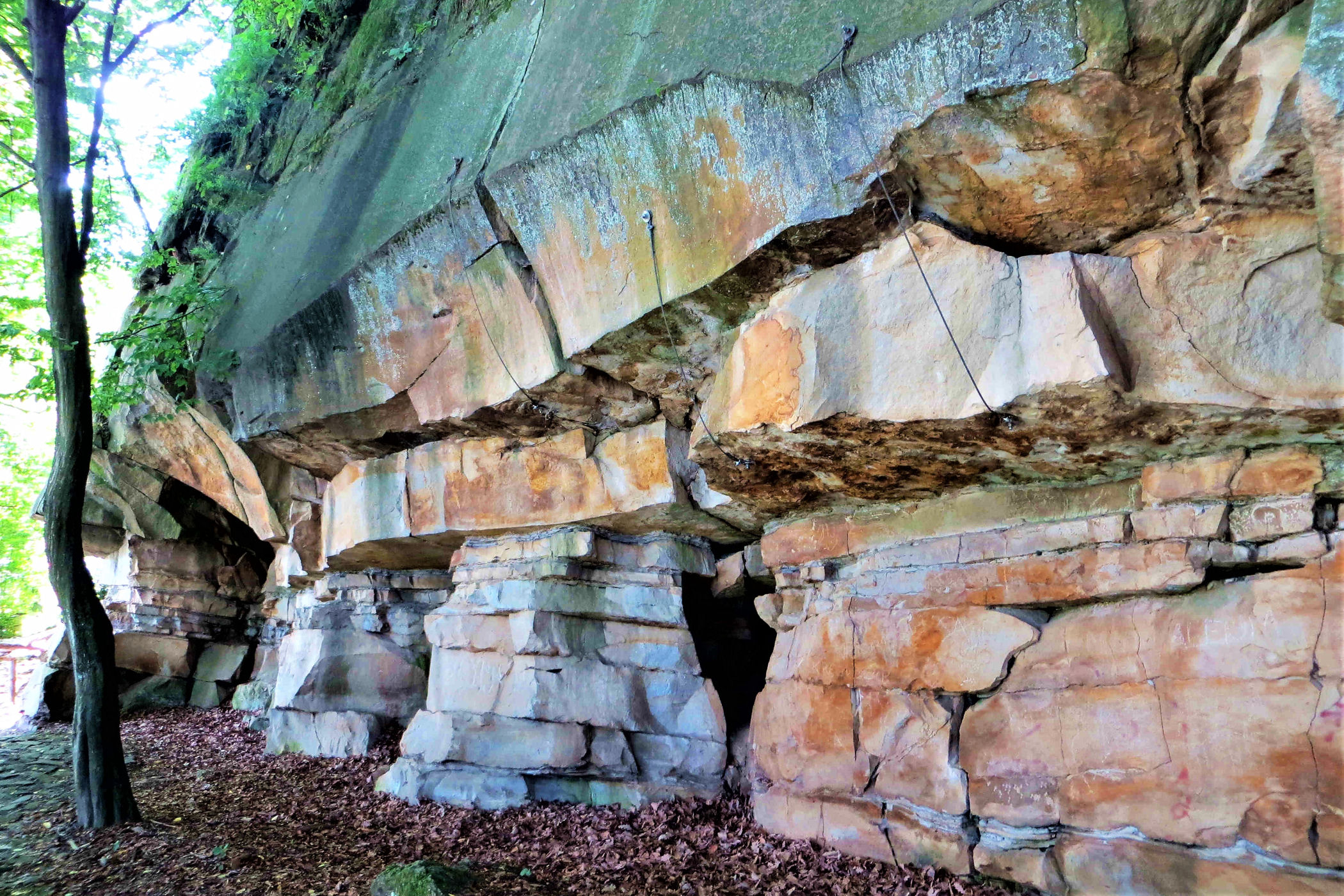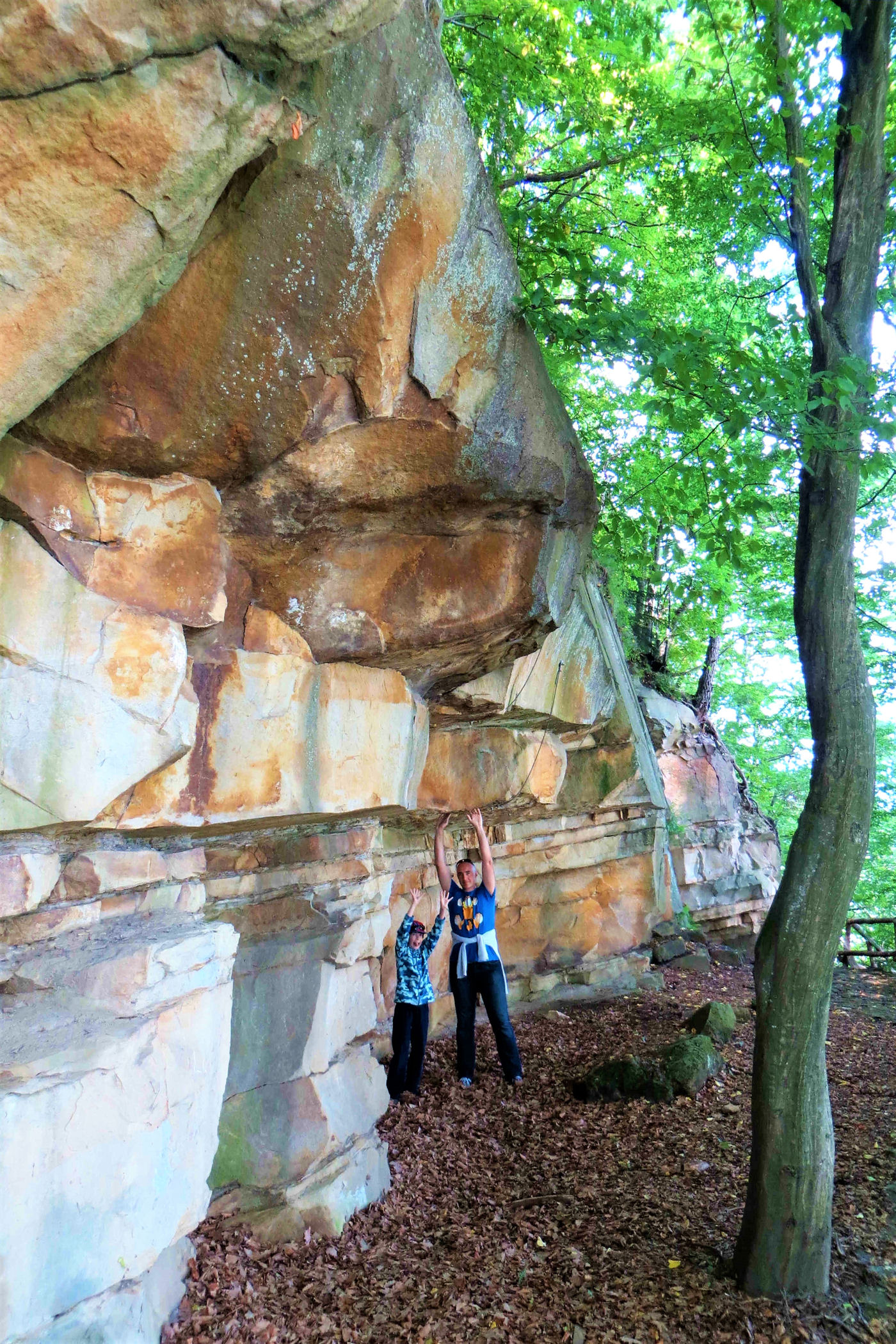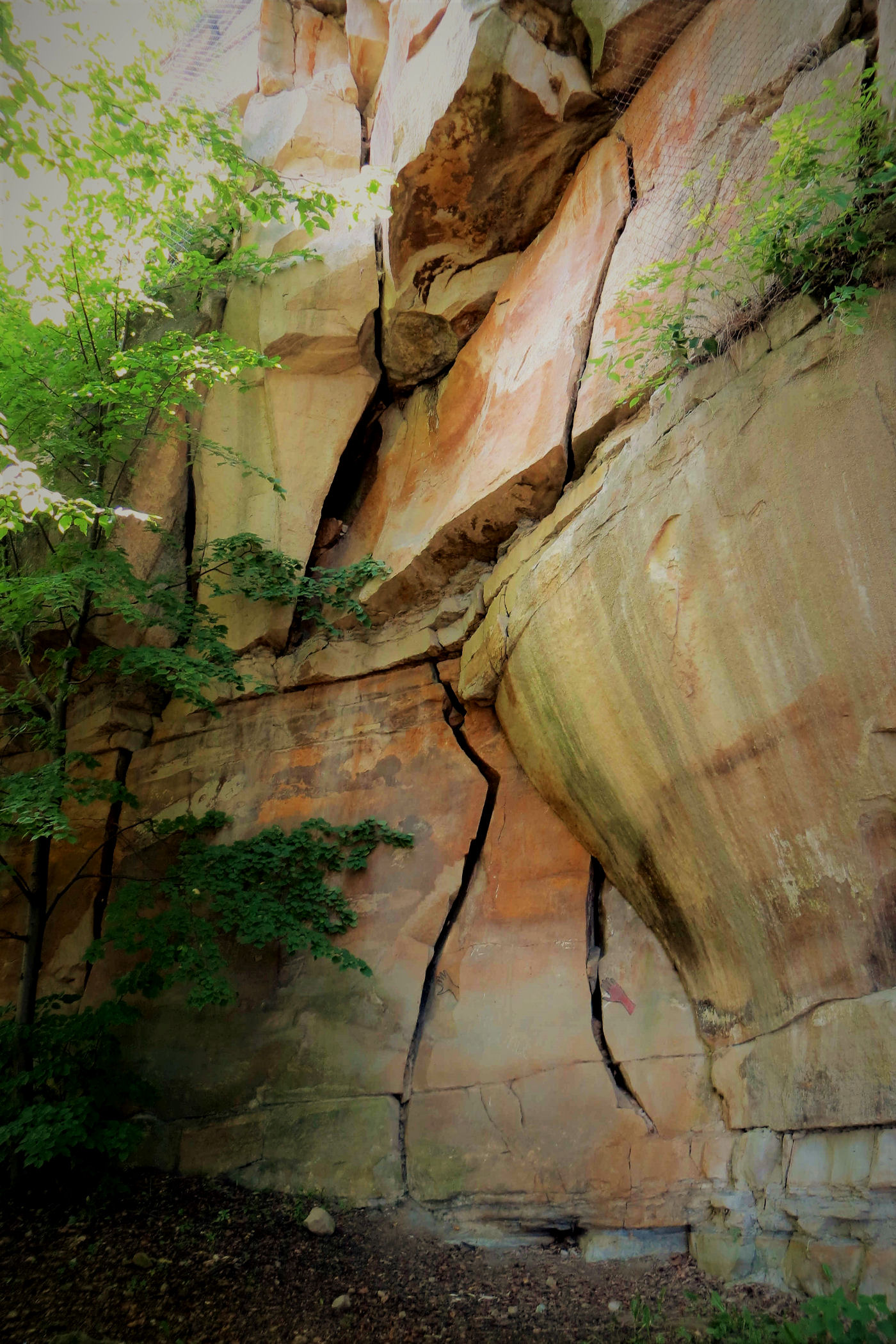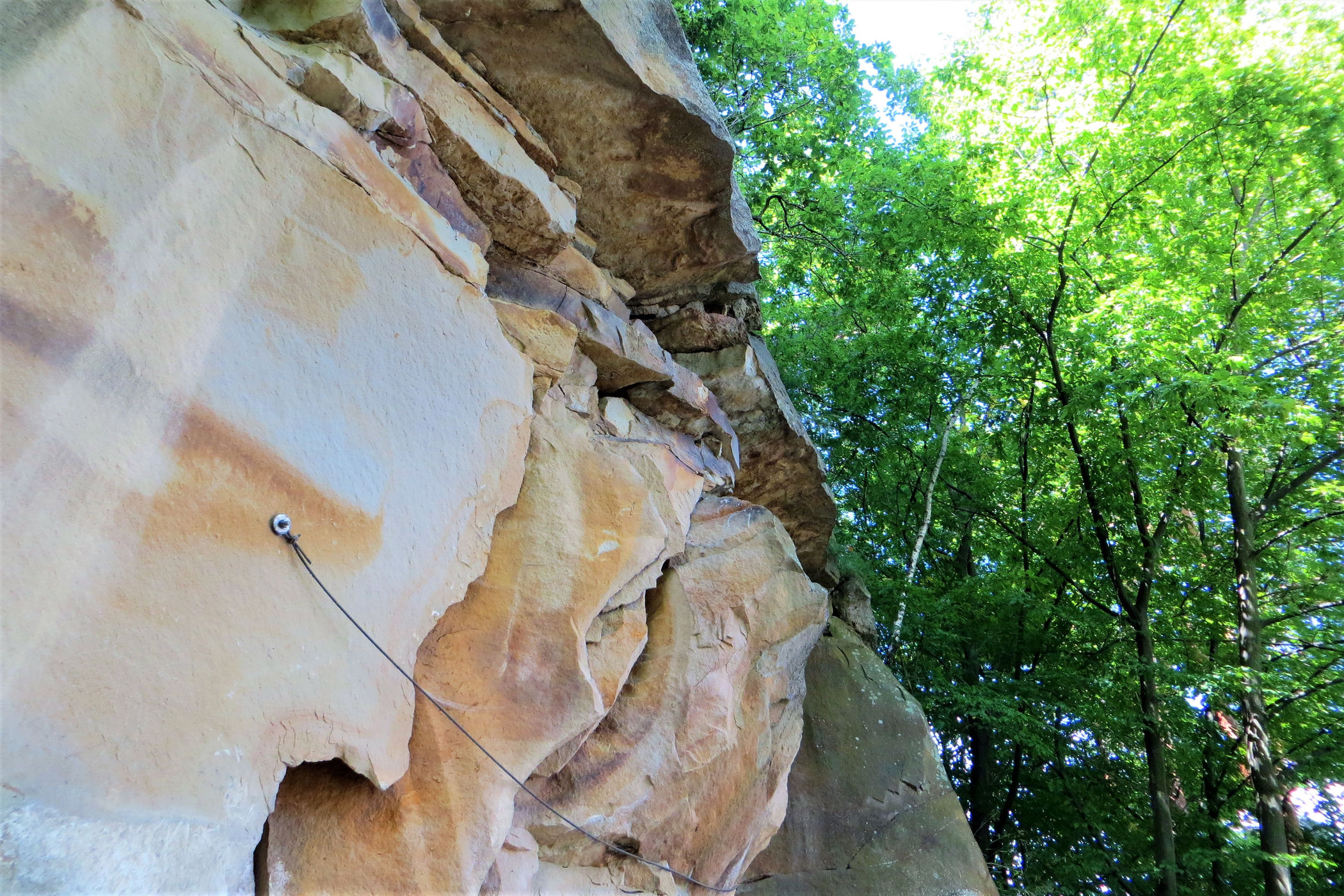 Jak już udało się dostać na zamek, to warto jeszcze zejść schodkami na dół, poniżej zamku od jego południowej strony. Tędy możemy podejść pod imponujące wielkością i ciekawe kolorystycznie skały na których zamek został zbudowany.