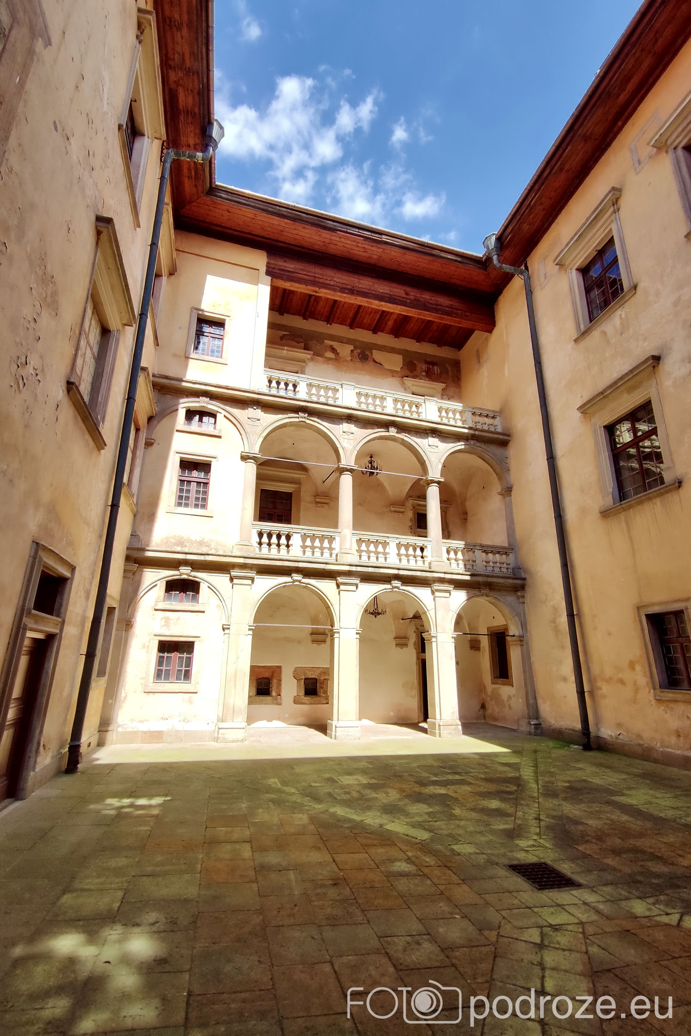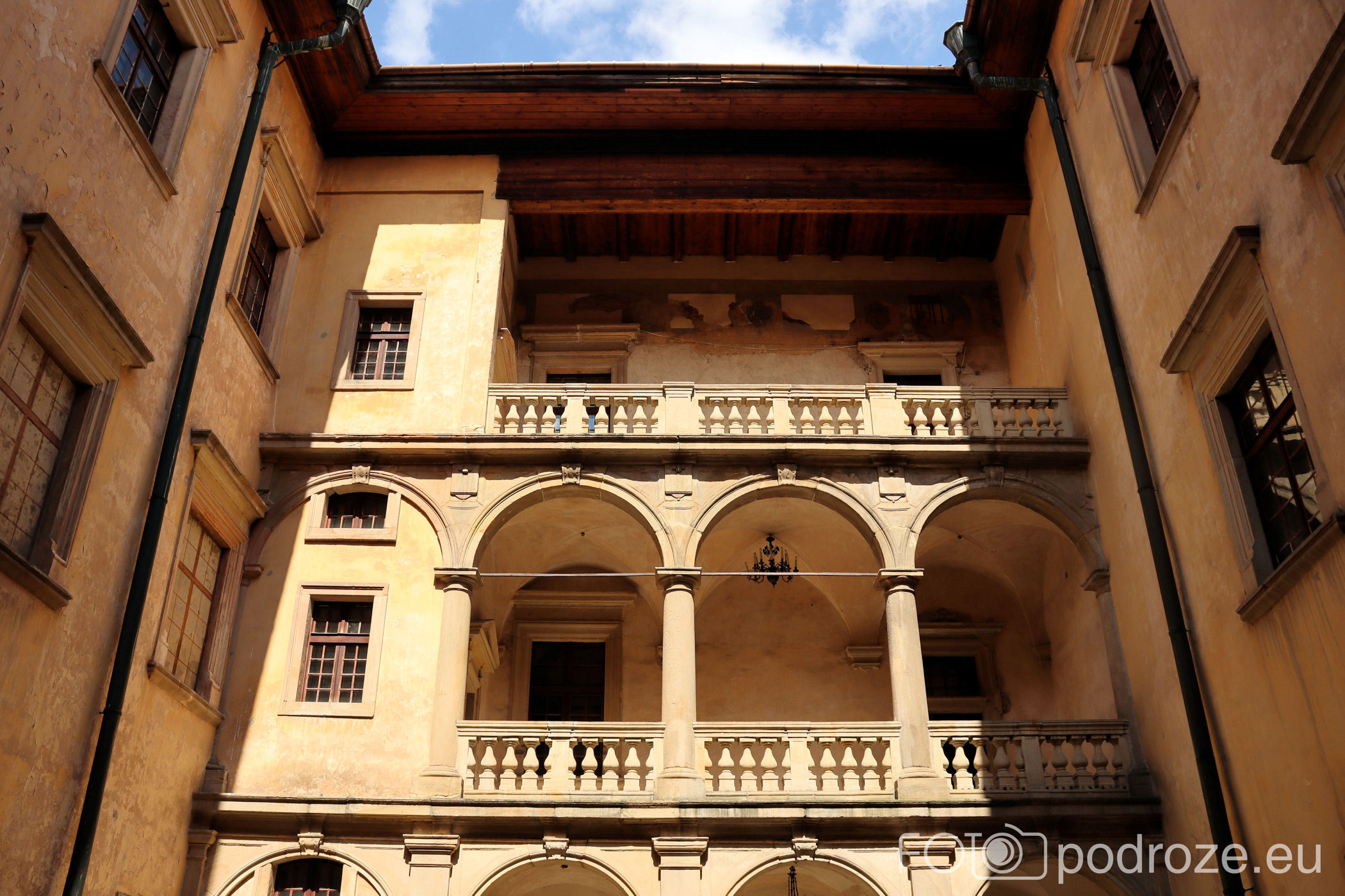 Wchodzimy po schodach na wysoki parter i pierwsze kroki kierujemy na dziedziniec z arkadową loggią. Nie jest on jednak tak imponujący jak w innych obiektach z tego okresu.