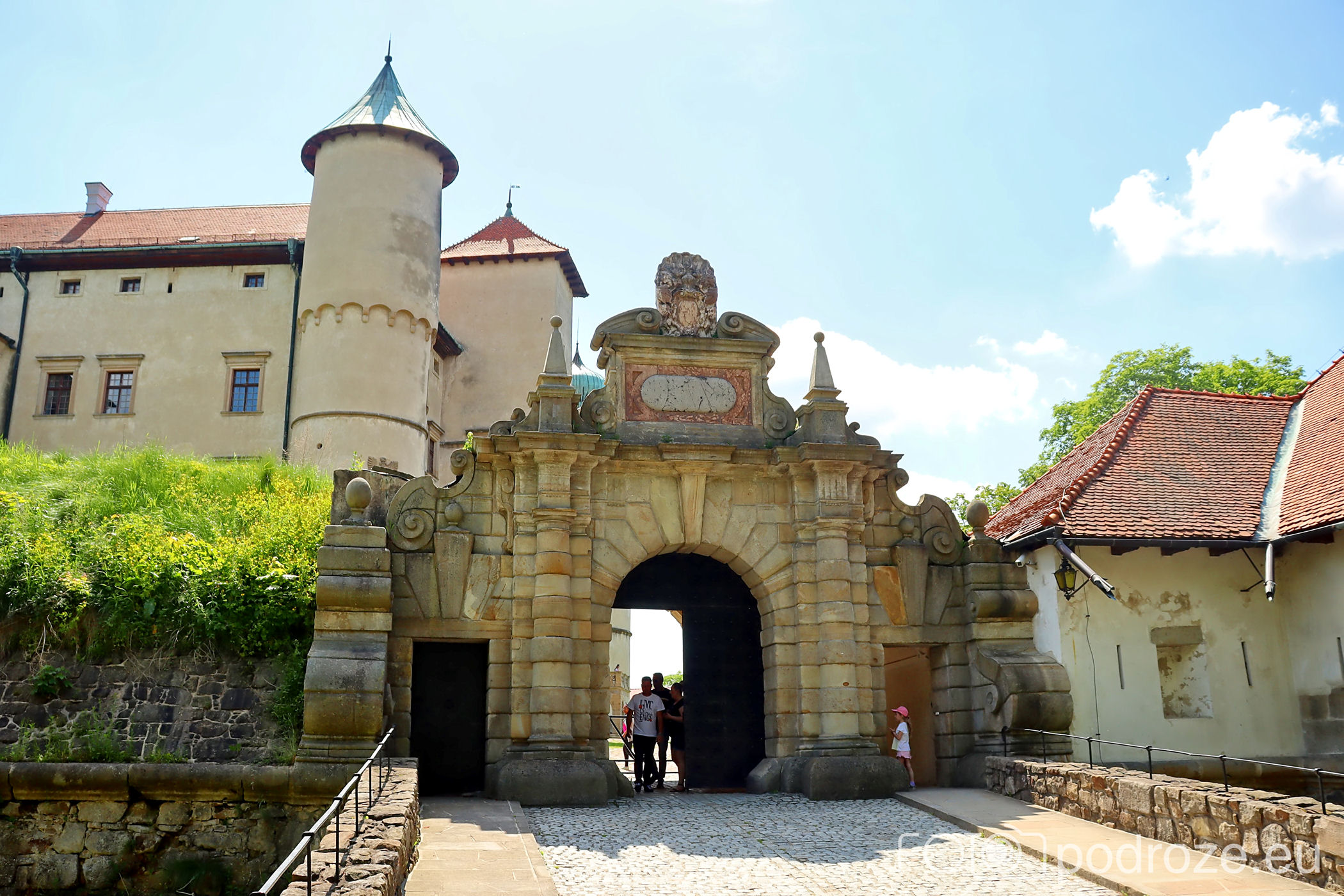 Na teren zamku prowadzi na piękna, kamienna, barokowa brama wejściowa. Brama jest trójdzielna, a jej środkowa część jest półkolista i wysoka aby mogły tędy wjeżdżać wozy. W zwieńczeniu bramy znajduje się herb Lubomirskich. Tu też w podcieniach znajduje się kasa, gdzie musimy uiścić opłatę za wstęp na teren dziedzińca zewnętrznego oraz inne opisane wyżej opcje zwiedzania .