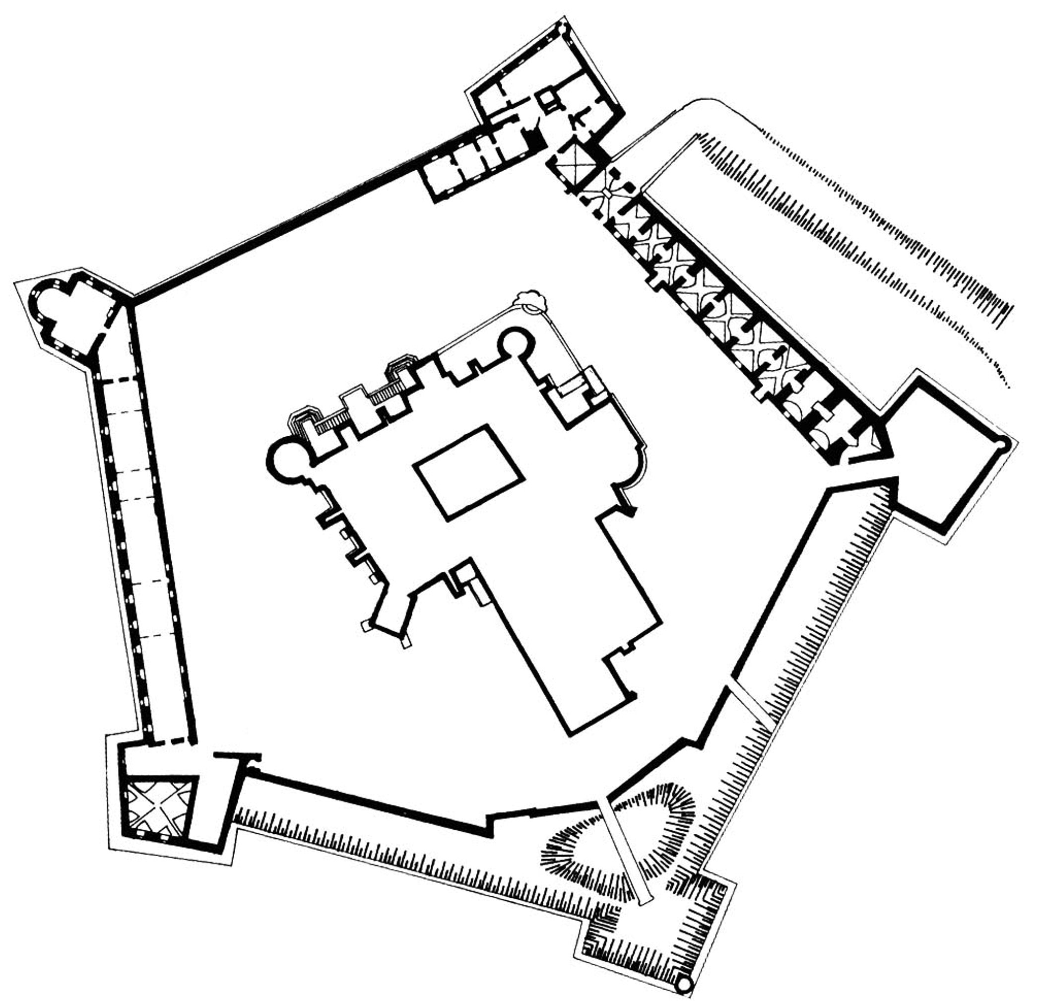 Wewnętrzny dziedziniec robi niesamowite wrażenie . Możemy obejść zamek z każdej strony i przyjrzeć się wszystkim wieżom w narożnikach ogromnej budowli. A kształt całości założenia tworzy aż pięć baszt i dobudówki. Trzy baszty są okrągłe, jedna kwadratowa, ostatnia z nich ma podstawę czworoboczną, a górną część ośmioboczną.