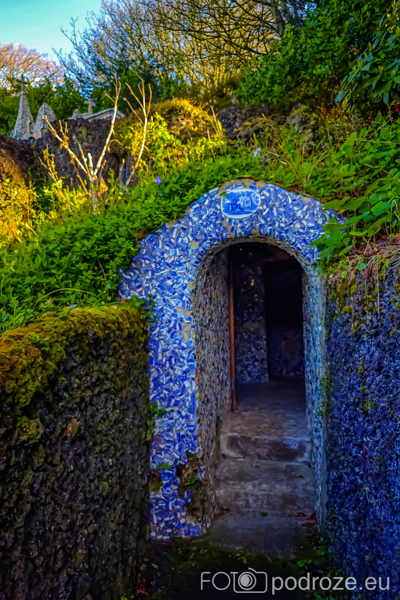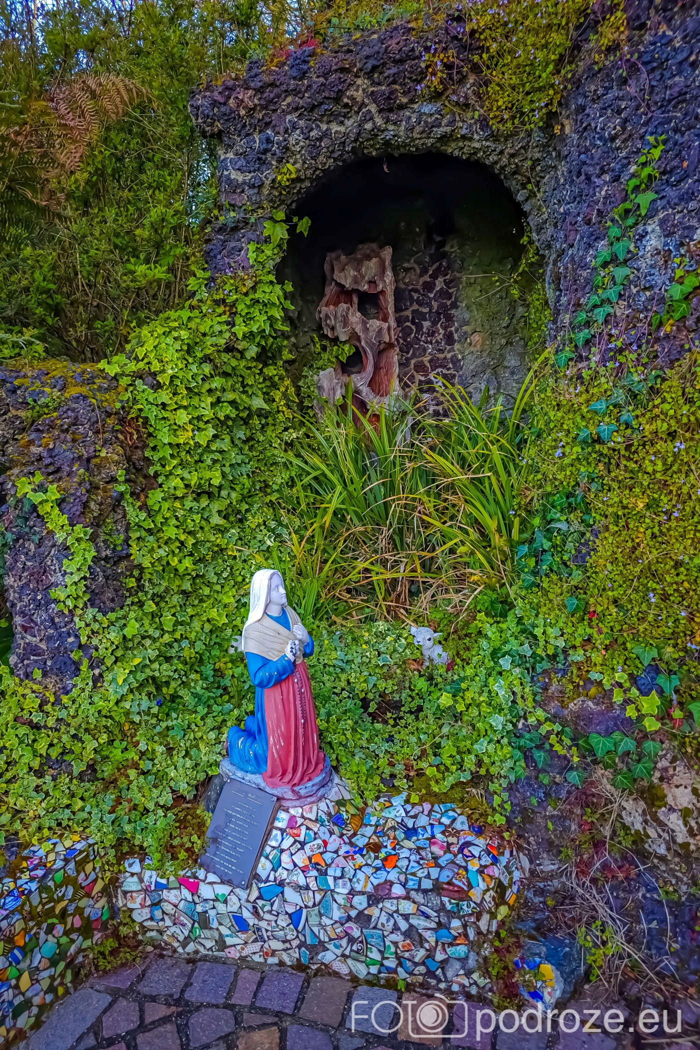 Widok z zewnątrz jest równie zachwycający co wnętrze: kapliczka otoczona jest maleńkim ogrodem i drogą krzyżową, zbudowaną przez lokalne stowarzyszenia w roku 2000, przypominającą Lourdes .