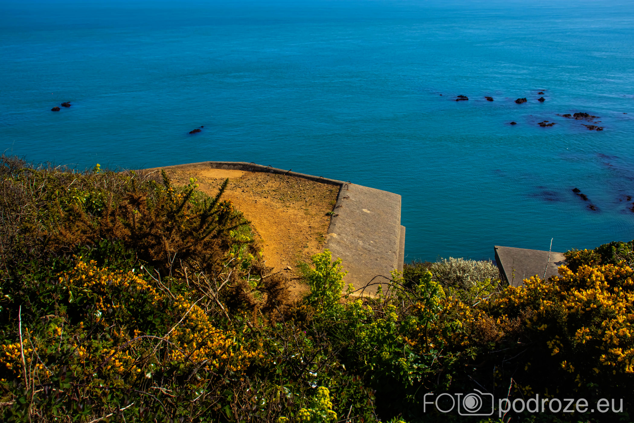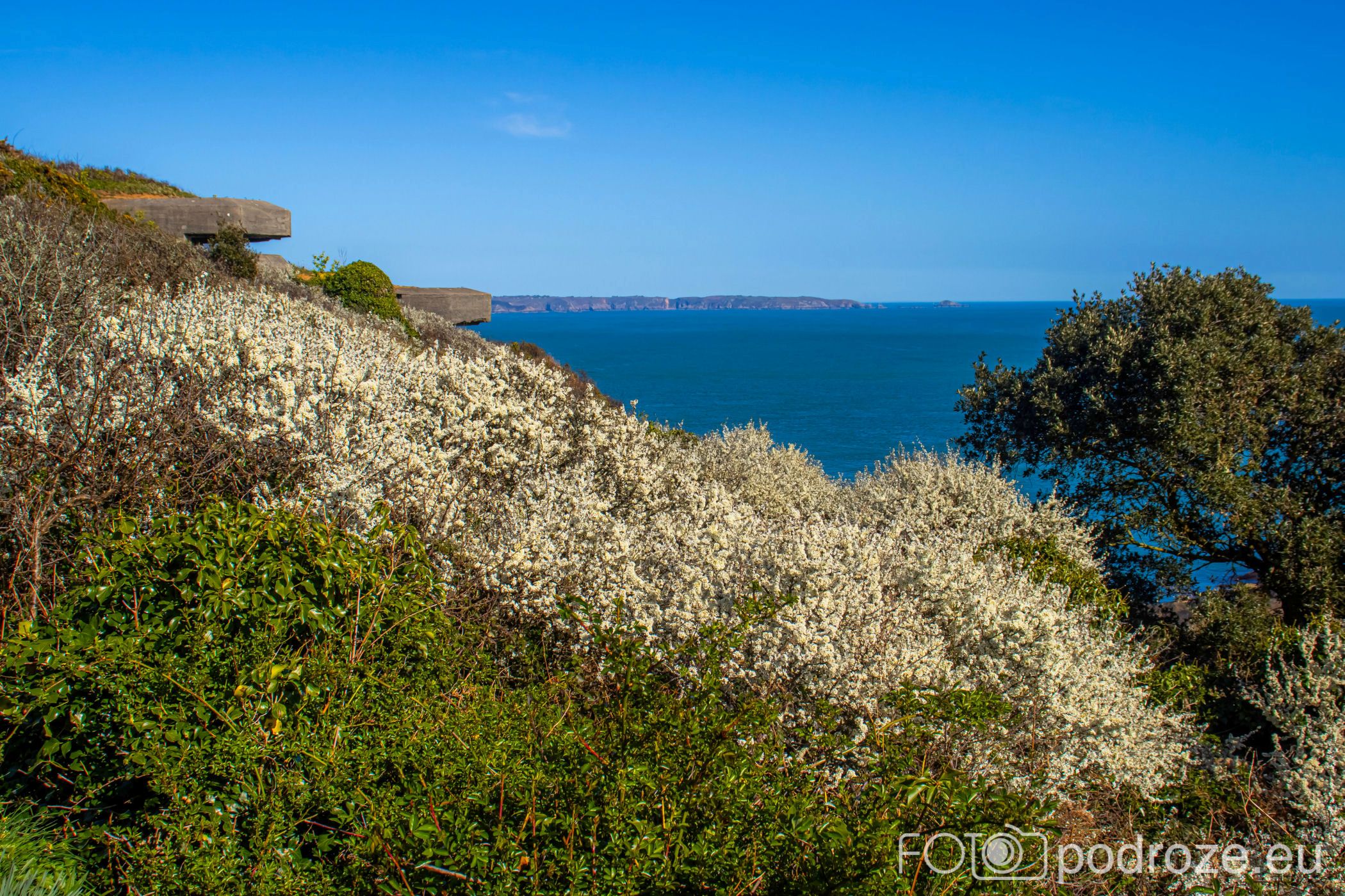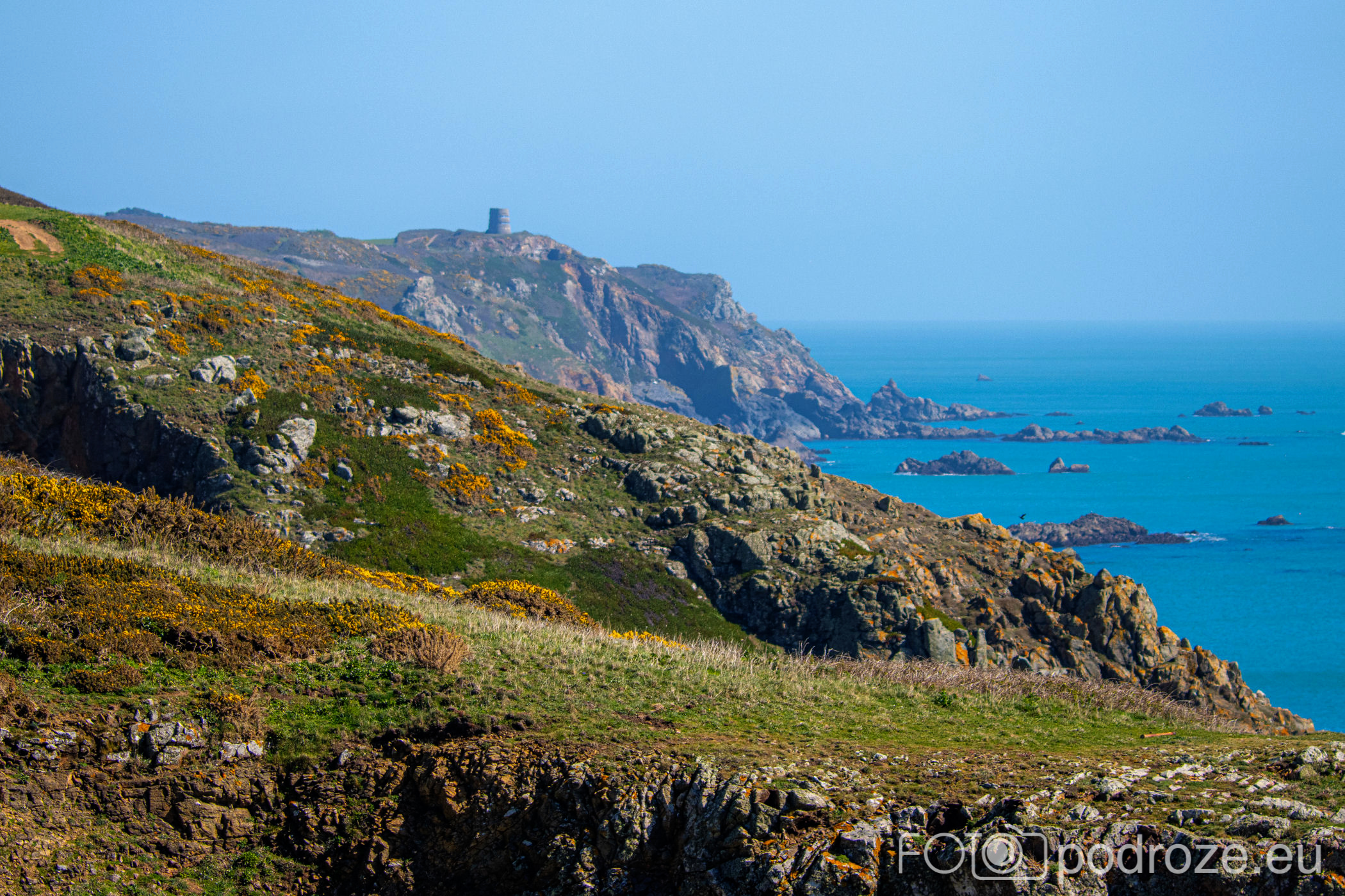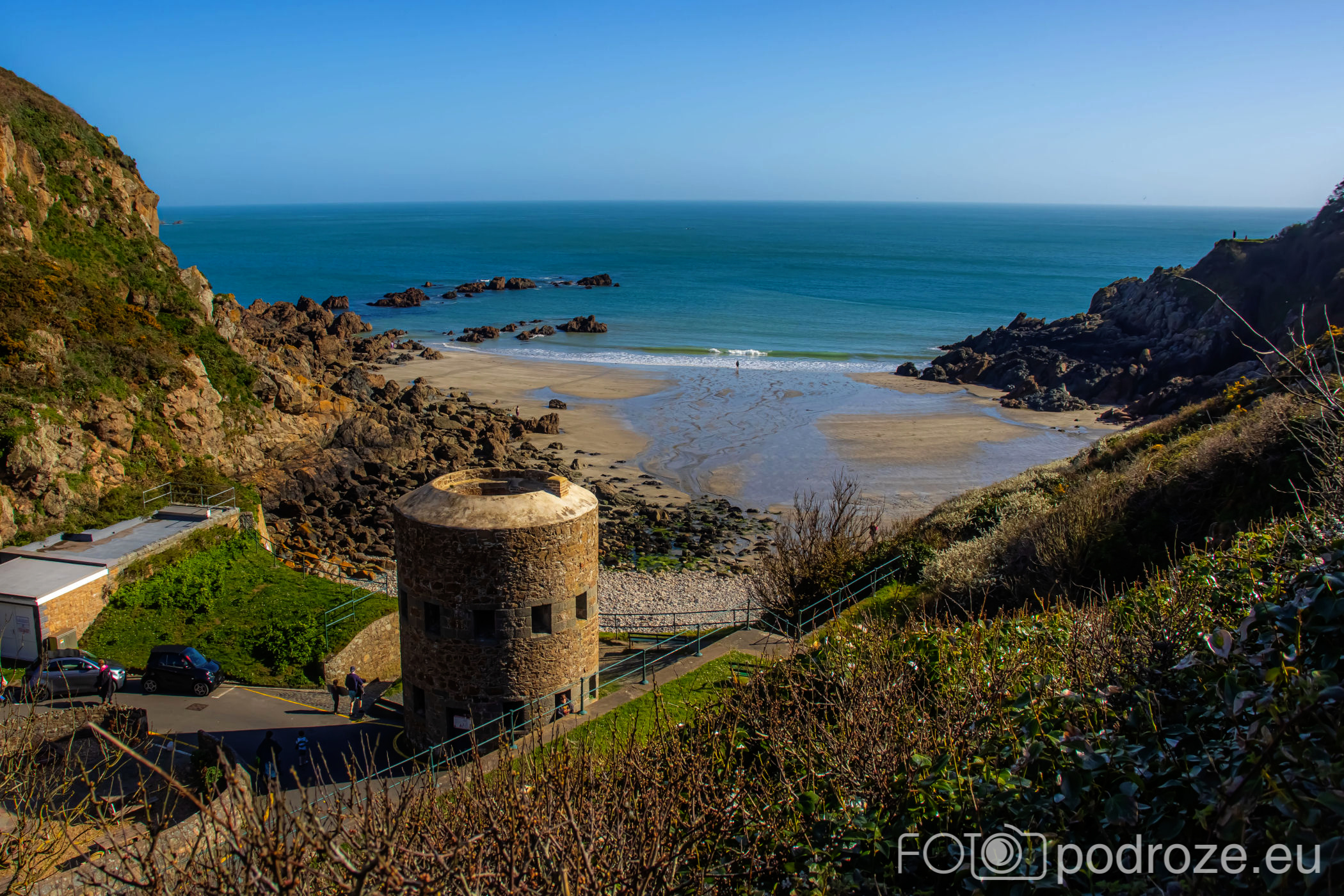 Poprzedni przewodnik po zachodnim wybrzeżu zakończyłam na wieży obserwacyjnej oznaczonej numerem MP4. Kolejna z nich to Prévôte Observation Tower (MP 5) . To podobnie jak poprzednie, niemiecka wieża obserwacyjno‑korektorska z 1942 roku, dwukondygnacyjna, z zewnętrzną elewacją z granitu udającą wieżę martello, zaprojektowana do pomiaru azymutu i zasięgu okrętów i ściśle wkomponowana w południowe klify Guernsey. Do tej konkretnej wieży nie zajeżdżamy, ale możemy ją obejrzeć z daleka. Zdjęcie poniżej ukazuje całe oblicze południowego wybrzeża w tej części wyspy.