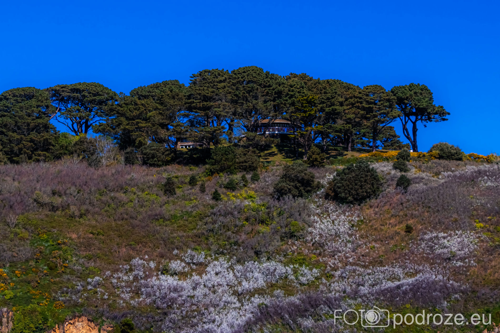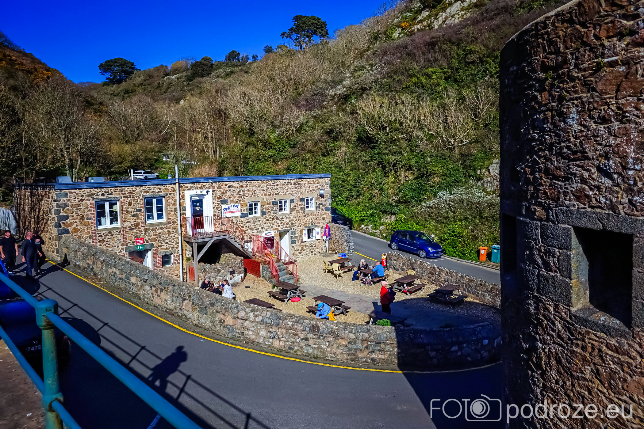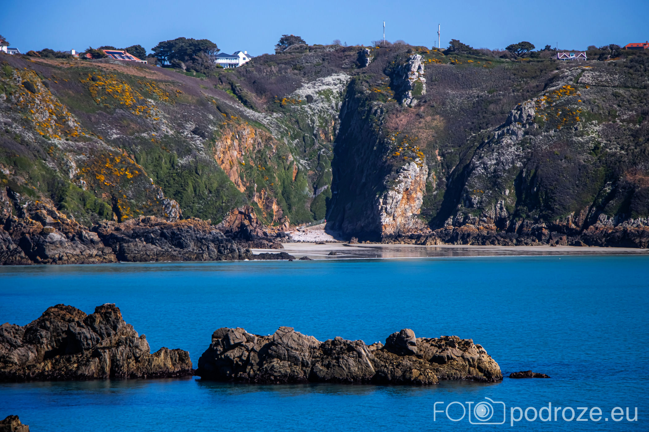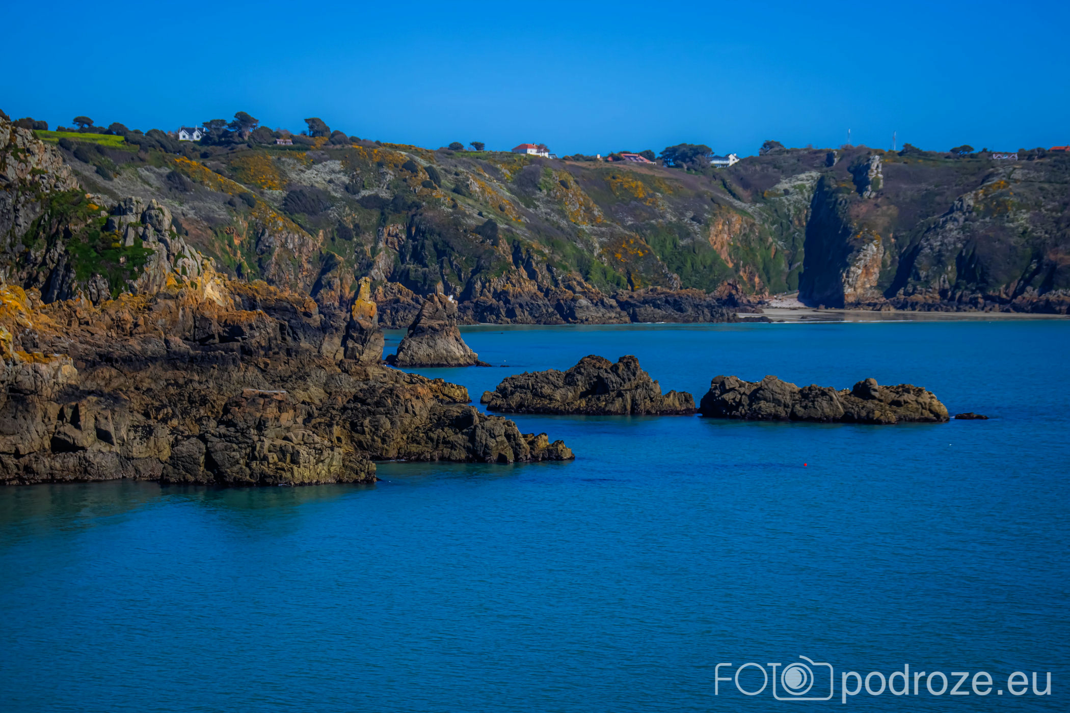 Poprzedni przewodnik po zachodnim wybrzeżu zakończyłam na wieży obserwacyjnej oznaczonej numerem MP4. Kolejna z nich to Prévôte Observation Tower (MP 5) . To podobnie jak poprzednie, niemiecka wieża obserwacyjno‑korektorska z 1942 roku, dwukondygnacyjna, z zewnętrzną elewacją z granitu udającą wieżę martello, zaprojektowana do pomiaru azymutu i zasięgu okrętów i ściśle wkomponowana w południowe klify Guernsey. Do tej konkretnej wieży nie zajeżdżamy, ale możemy ją obejrzeć z daleka. Zdjęcie poniżej ukazuje całe oblicze południowego wybrzeża w tej części wyspy.