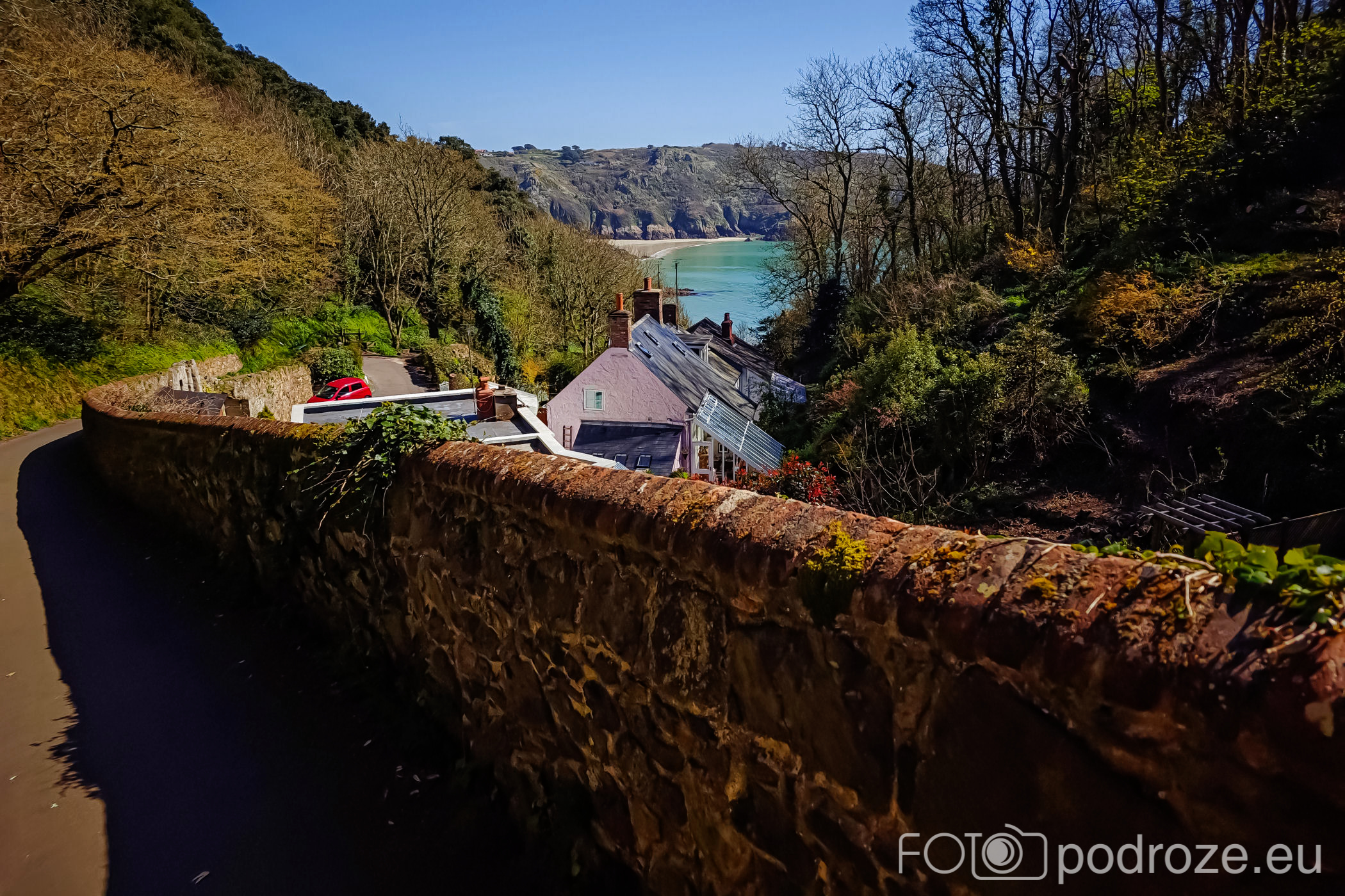 Autem najlepiej dojechać do parkingu oznaczonego na mapie > Moulin Huet Parking . Niestety są tu miejsca tylko dla 10 pojazdów, w sezonie zaparkowanie może wiec nie być możliwe. Nam się udało i już sama okolica parkingu nas zachwyciła. Piękny, zielony las, potoczek płynący wzdłuż drogi . Spacer do zatoki to widoki na małą osadę w której znajduje się kilka domów.