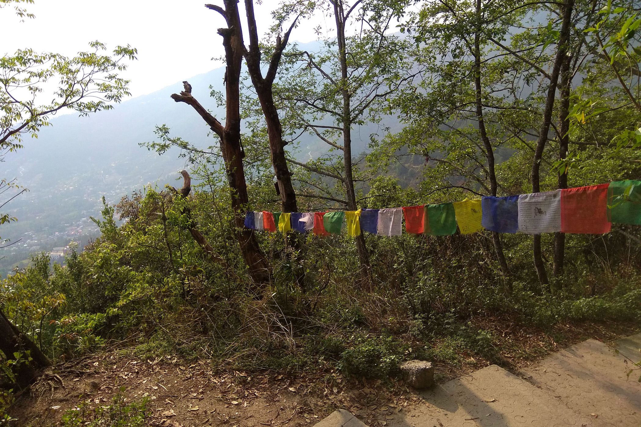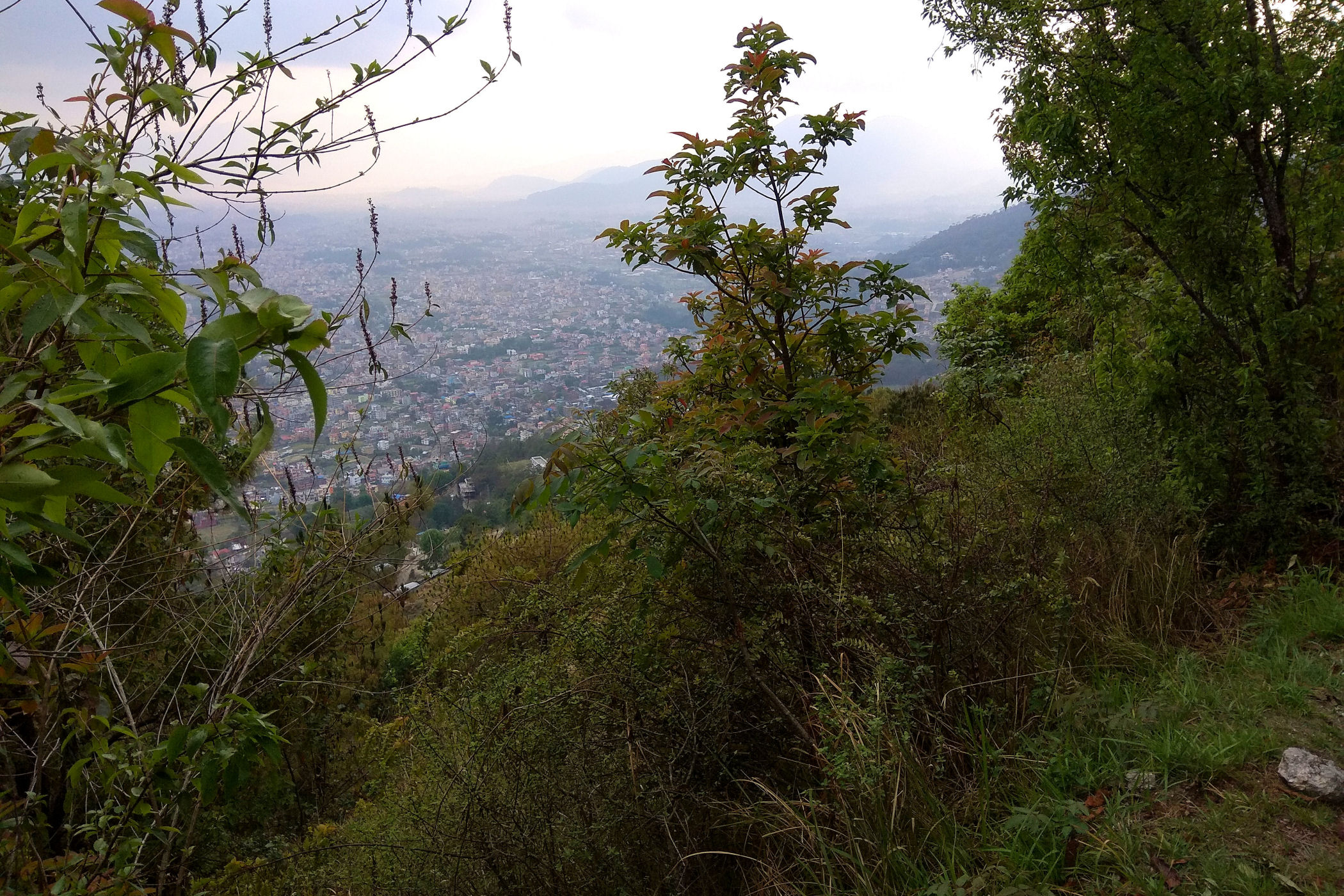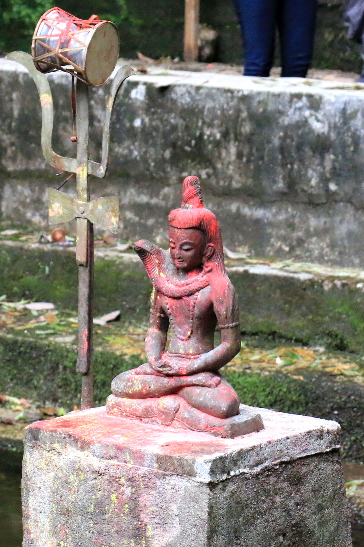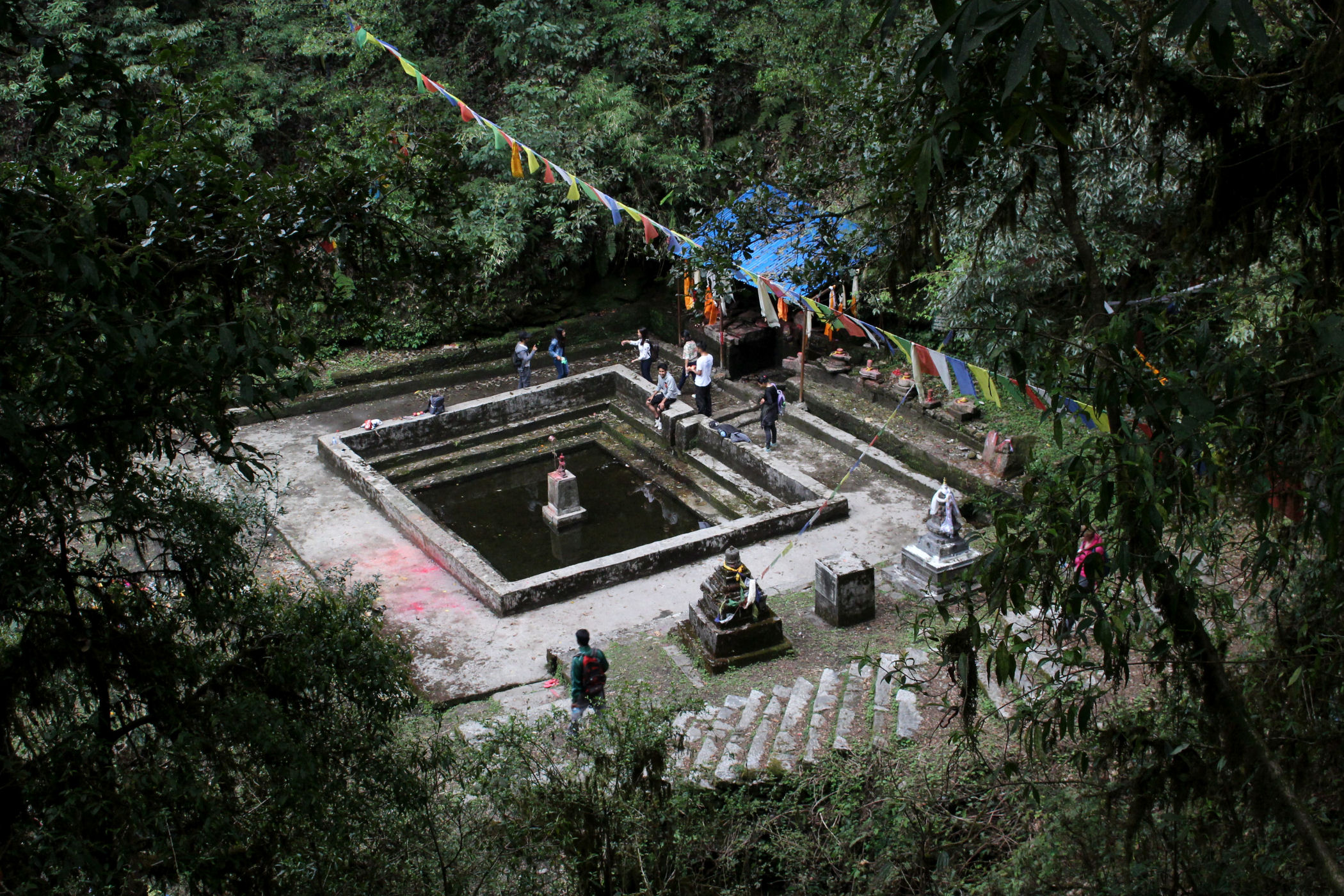 Na szczycie robimy pół-godzinną przerwę na regenerację sił i udajemy się w dół innym szlakiem ( od wschodniej strony ), aby odwiedzić po drodze kilka ważnych miejsc. Mijamy kilka ciekawych zabudowań klasztornych i mieszkalnych, a także Baghdwar. To miejsce, w którym Bagmati opuszcza góry i zaczyna się wędrować w kierunku Katmandu. Jest tam mały, zielony, stojący tam staw z posągiem Śiwy siedzącym pośrodku, węże naga, posągi Buddy, a nawet kilka pustelniczych jaskiń. Jak prawie wszędzie w Nepalu, w tym miejscu kultu znajduje się mieszanina hinduskich i buddyjskich elementów.