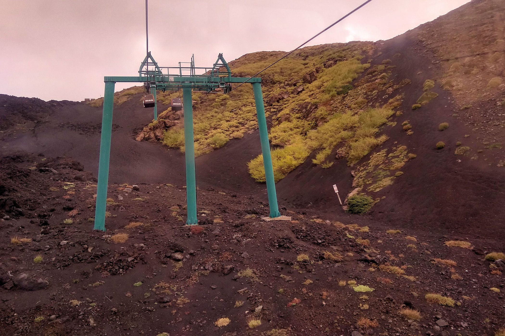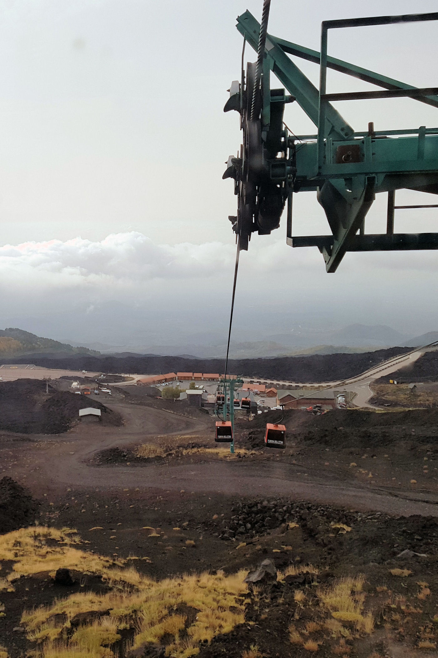Rano szybkie śniadanie, zabieramy pożyczone dzień wcześniej auto i ruszamy na południe. Za miejscowością Giarre odbijamy z autostrady i już chwilę później kręta droga miejscami pokryta pyłem wulkanicznym prowadzi nas przez deszczową krainę do parkingu pod Rifugio Sapienza (1910 m n.p.m.) i pod kolejką linową – Funivia dell’Etna – Stazione partenza. Tu zostawiamy auto na płatnym (niestety – 10 euro za cały dzień) parkingu, ubieramy się w ciepłe i nieprzemakalne ubrania i ruszamy do kasy dolnej stacji kolejki.