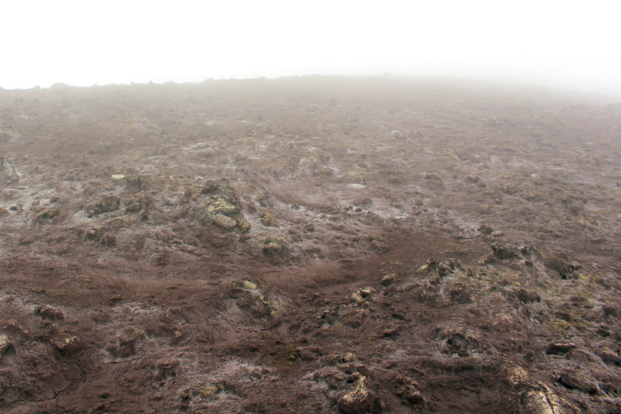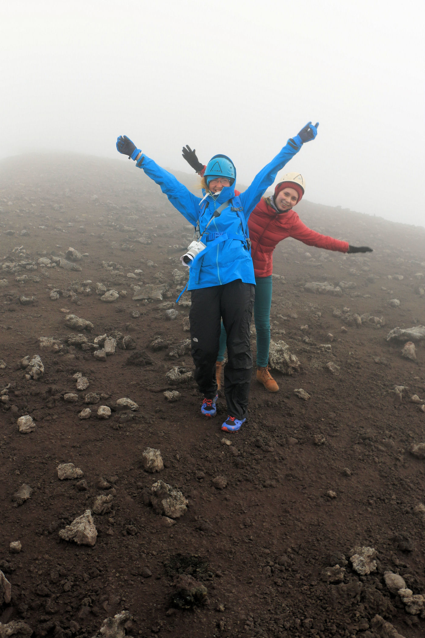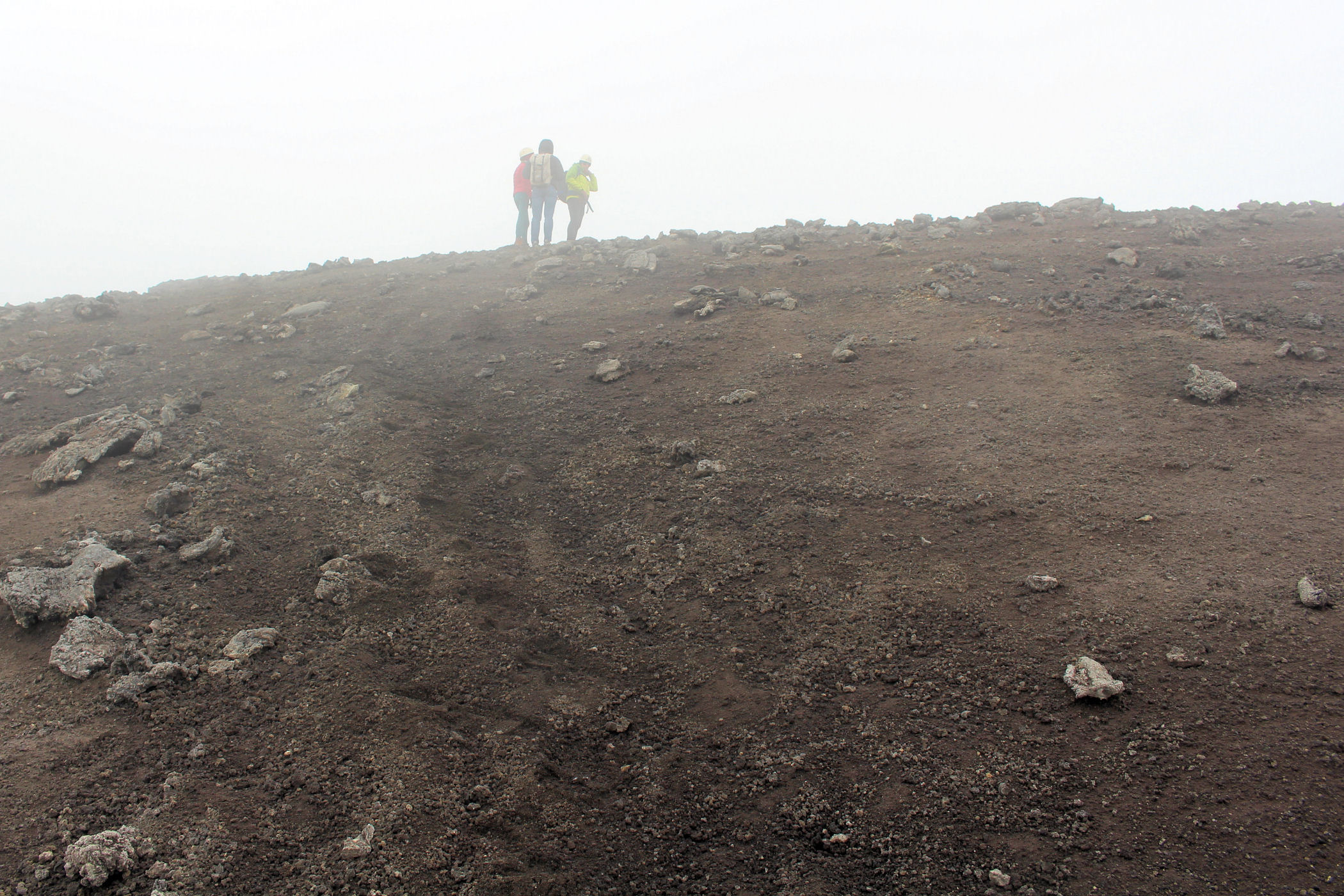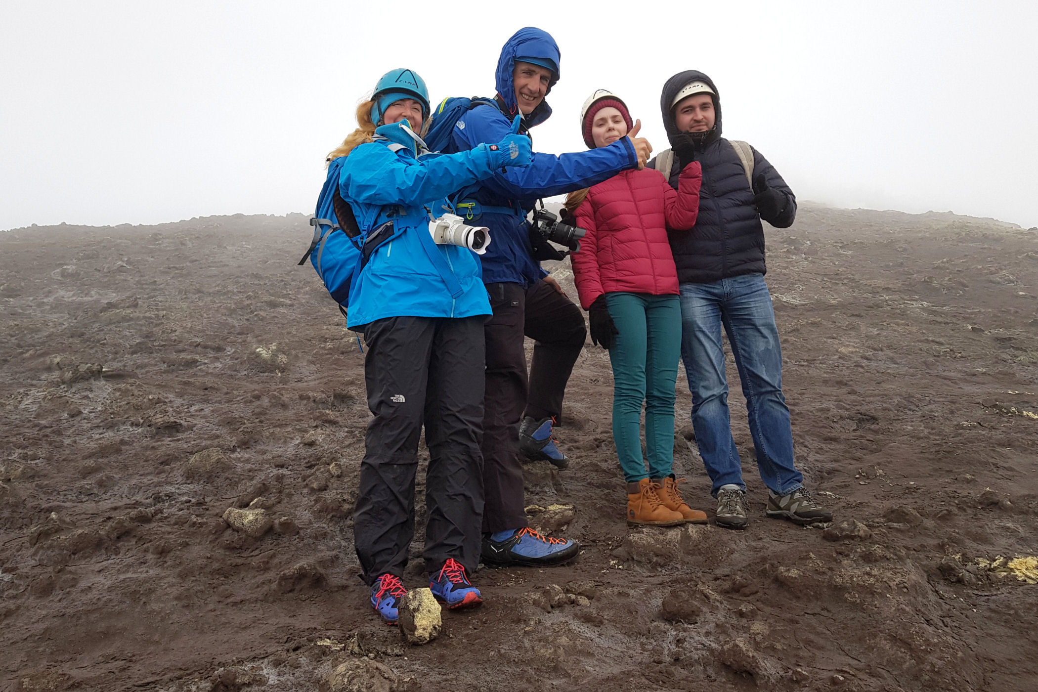O godzinie 13.00 jesteśmy w najwyższym punkcie. GPS pokazuje wysokość 3335m n.p.m. – to w zasadzie tylko 5m od wierzchołka. Przewodnik nie pozwala iść dalej – faktycznie miejsce wygląda dość przerażająco – chmury otaczają nas ze wszystkich stron, nie widać krateru, za to w stopy robi się coraz cieplej. Szybka sesja zdjęciowa i schodzimy w dół .
