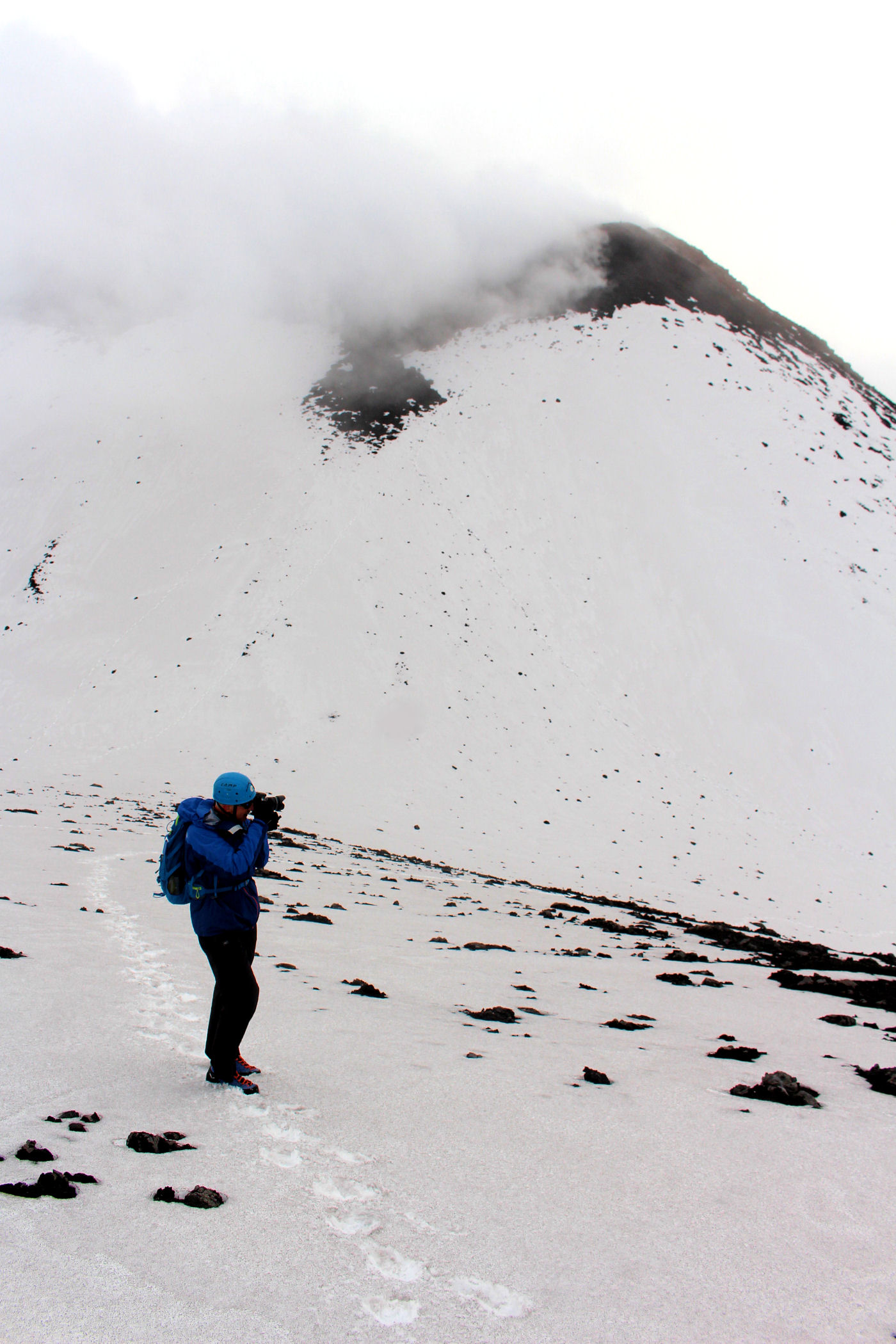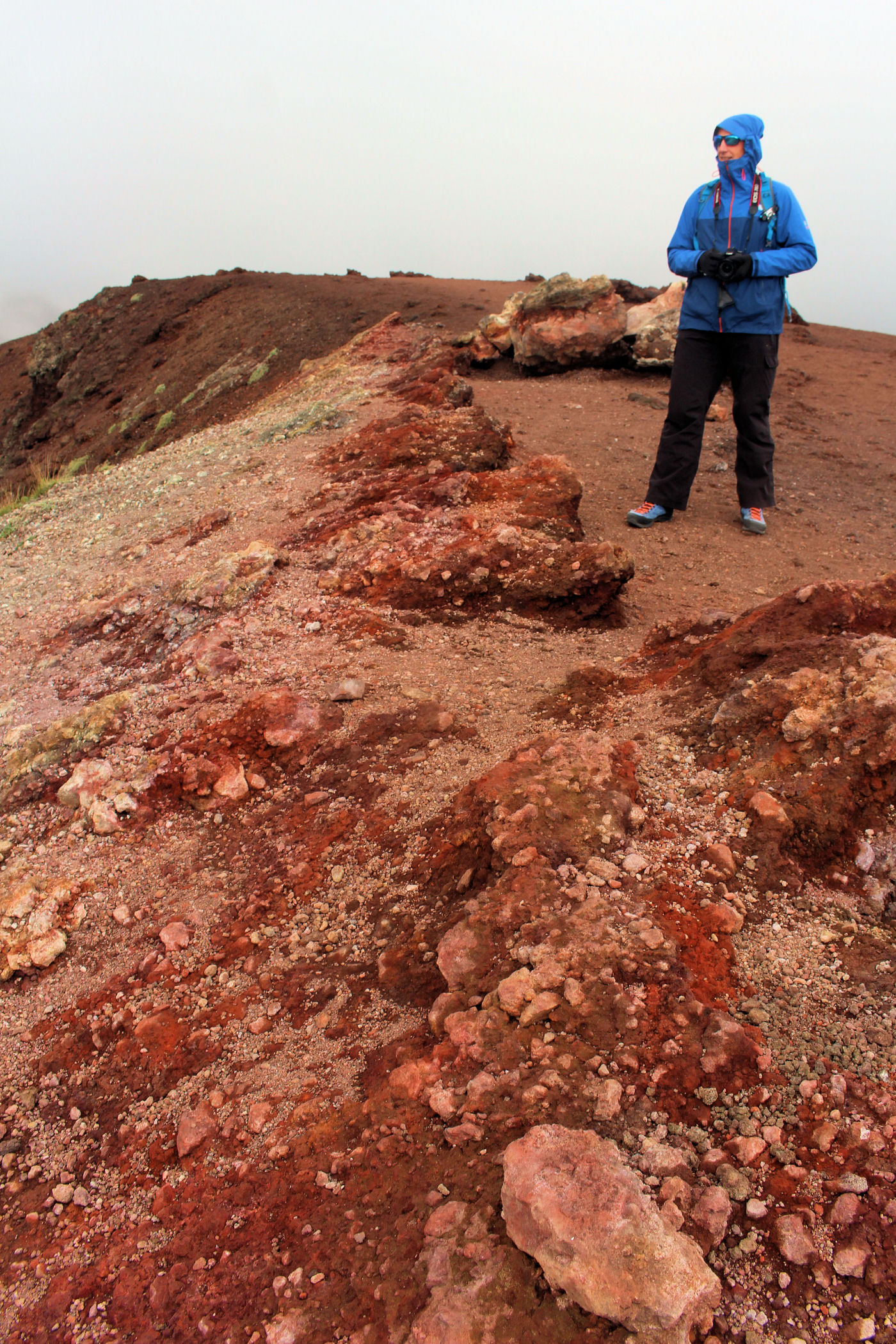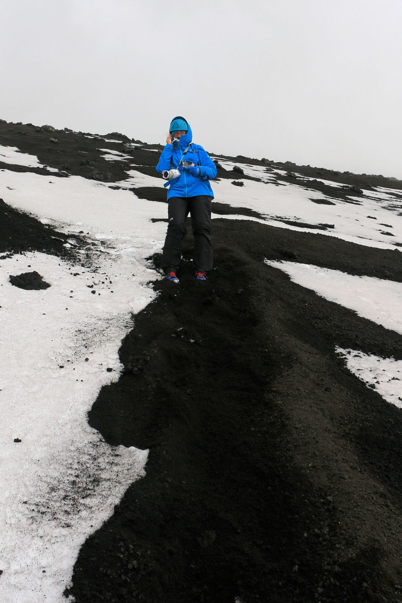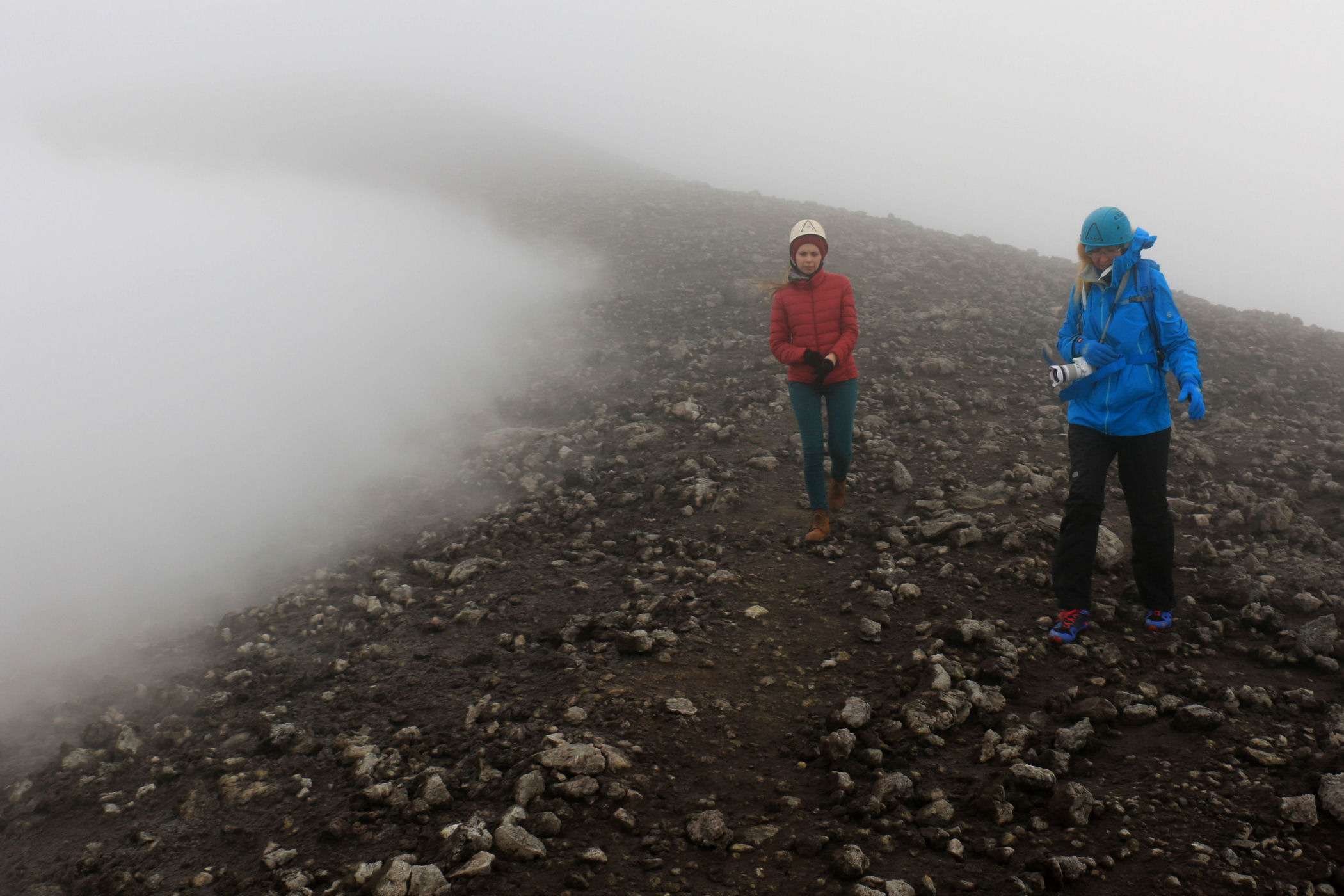 O godzinie 13.00 jesteśmy w najwyższym punkcie. GPS pokazuje wysokość 3335m n.p.m. – to w zasadzie tylko 5m od wierzchołka. Przewodnik nie pozwala iść dalej – faktycznie miejsce wygląda dość przerażająco – chmury otaczają nas ze wszystkich stron, nie widać krateru, za to w stopy robi się coraz cieplej. Szybka sesja zdjęciowa i schodzimy w dół .