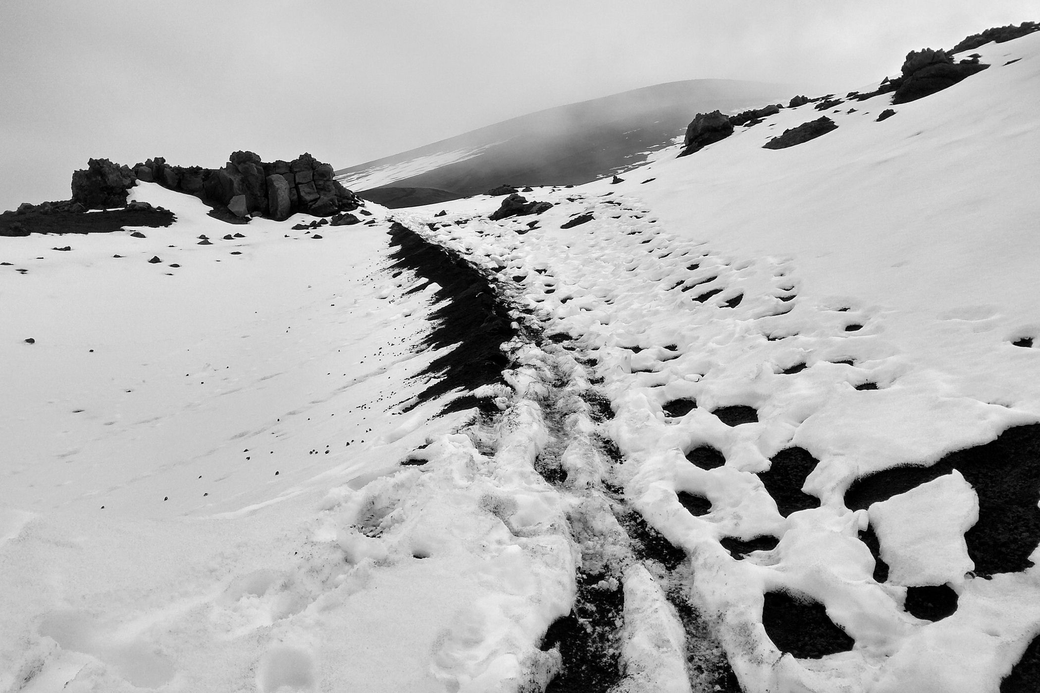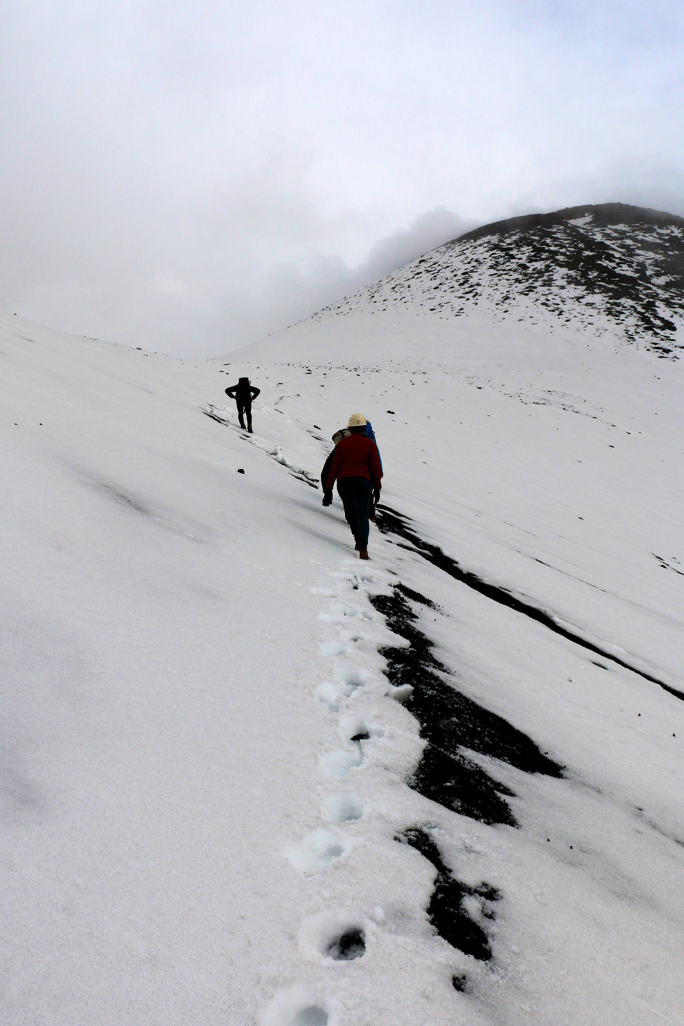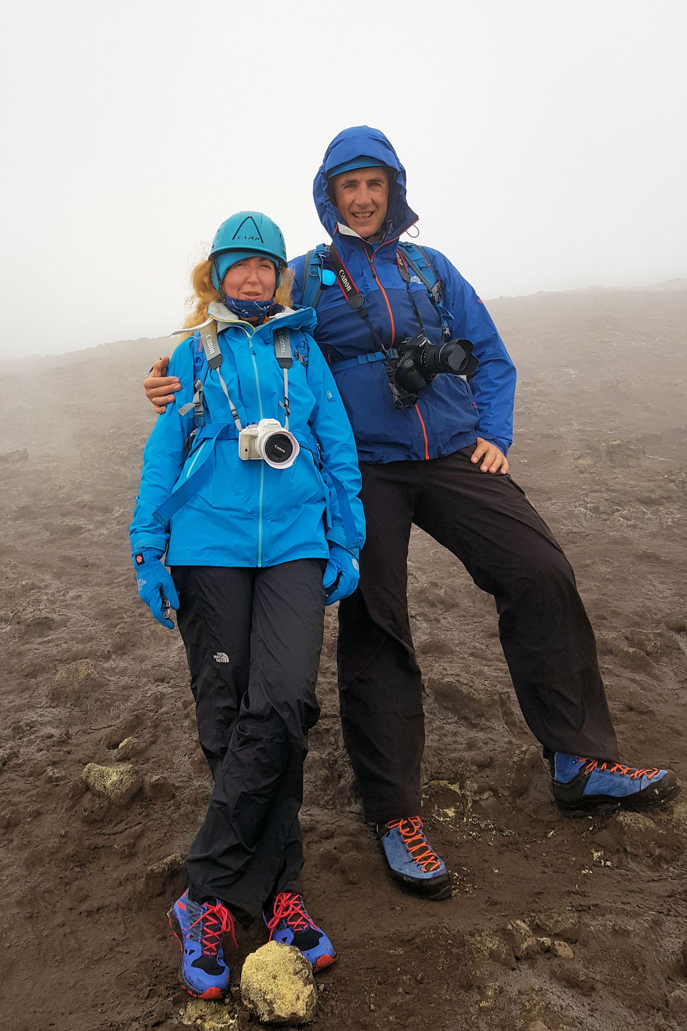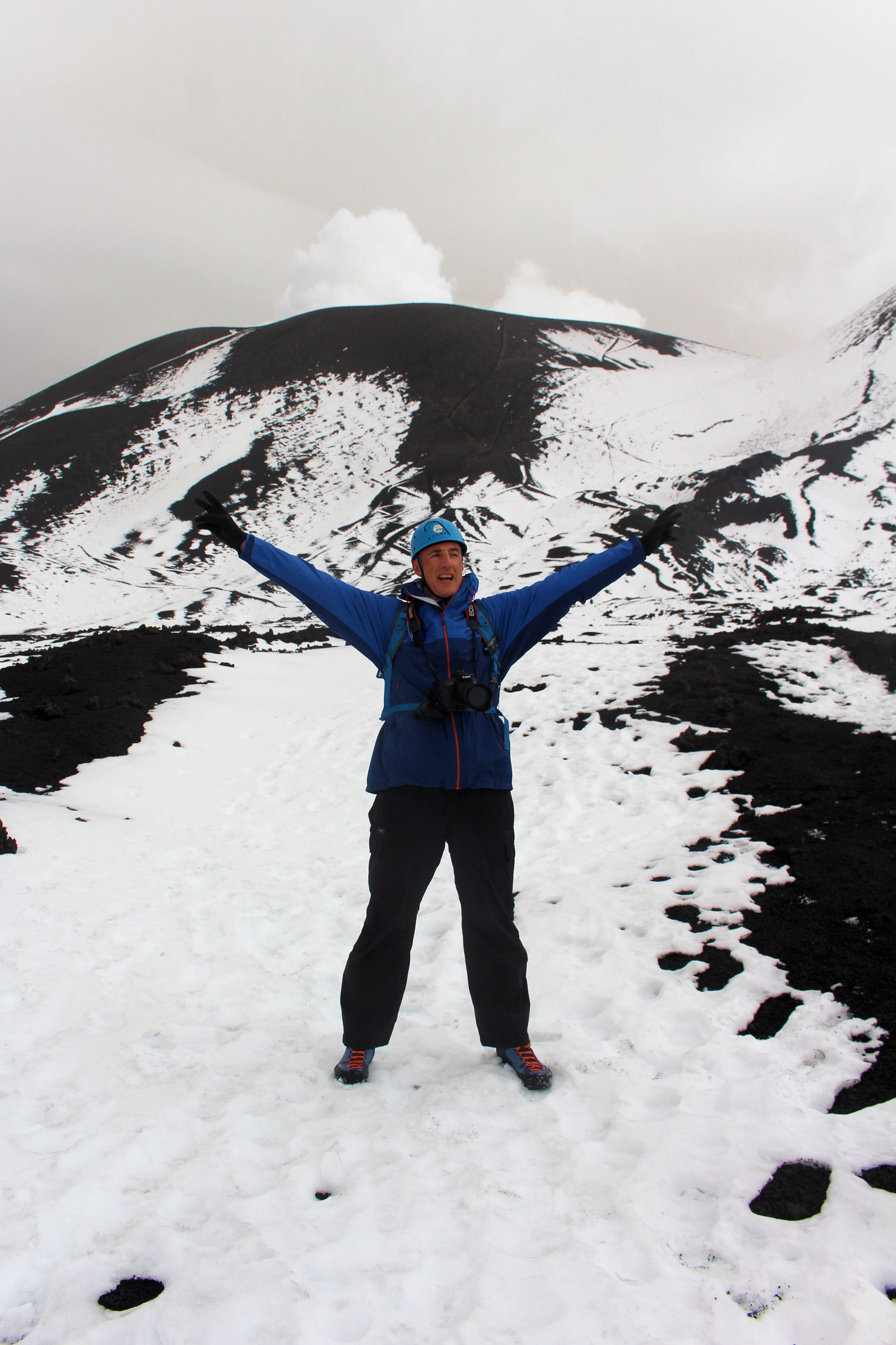 O godzinie 13.00 jesteśmy w najwyższym punkcie. GPS pokazuje wysokość 3335m n.p.m. – to w zasadzie tylko 5m od wierzchołka. Przewodnik nie pozwala iść dalej – faktycznie miejsce wygląda dość przerażająco – chmury otaczają nas ze wszystkich stron, nie widać krateru, za to w stopy robi się coraz cieplej. Szybka sesja zdjęciowa i schodzimy w dół .