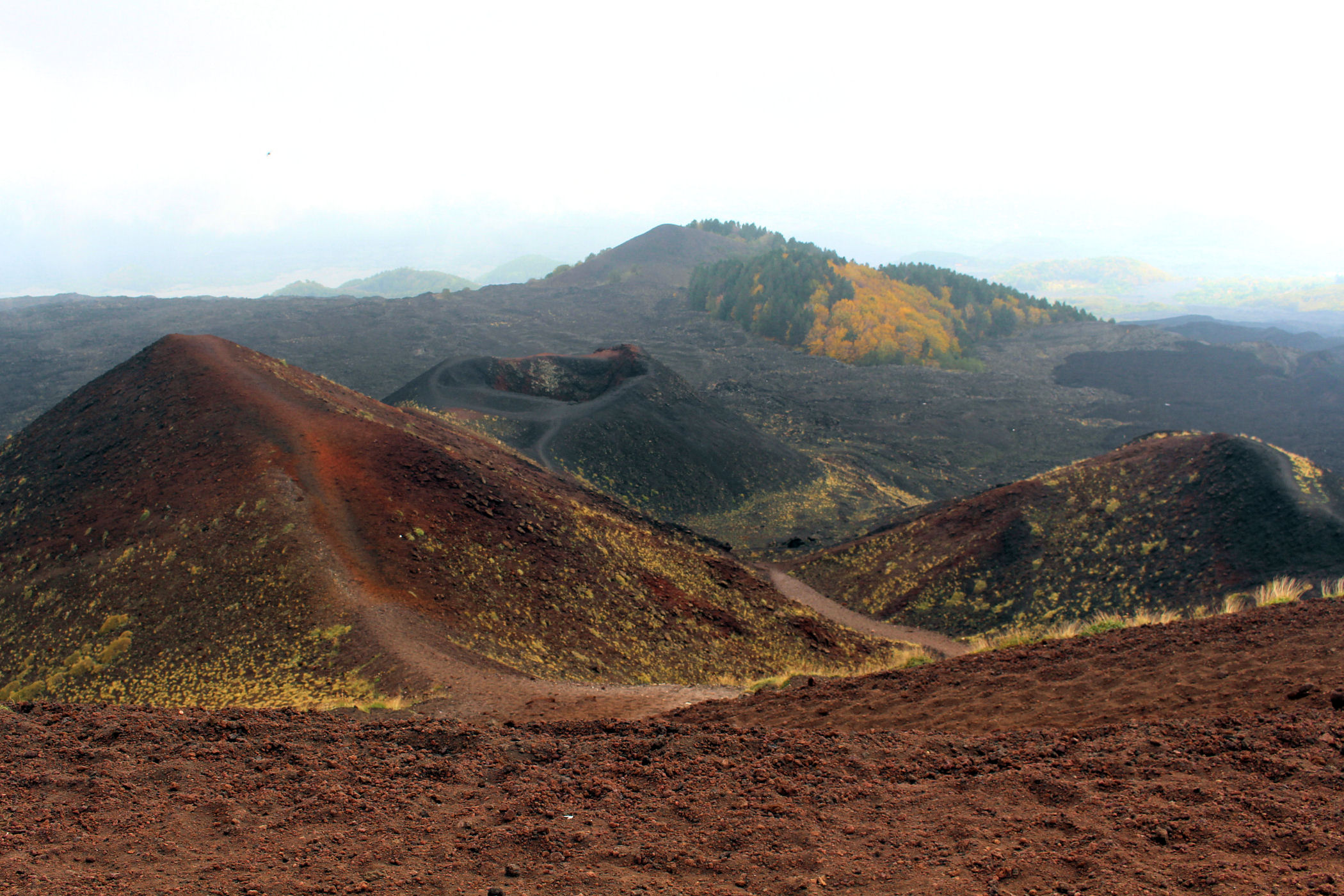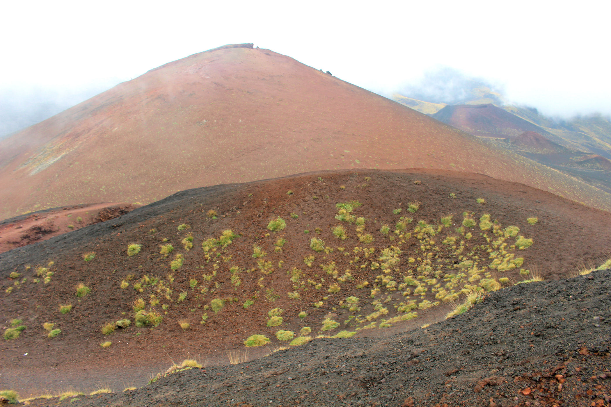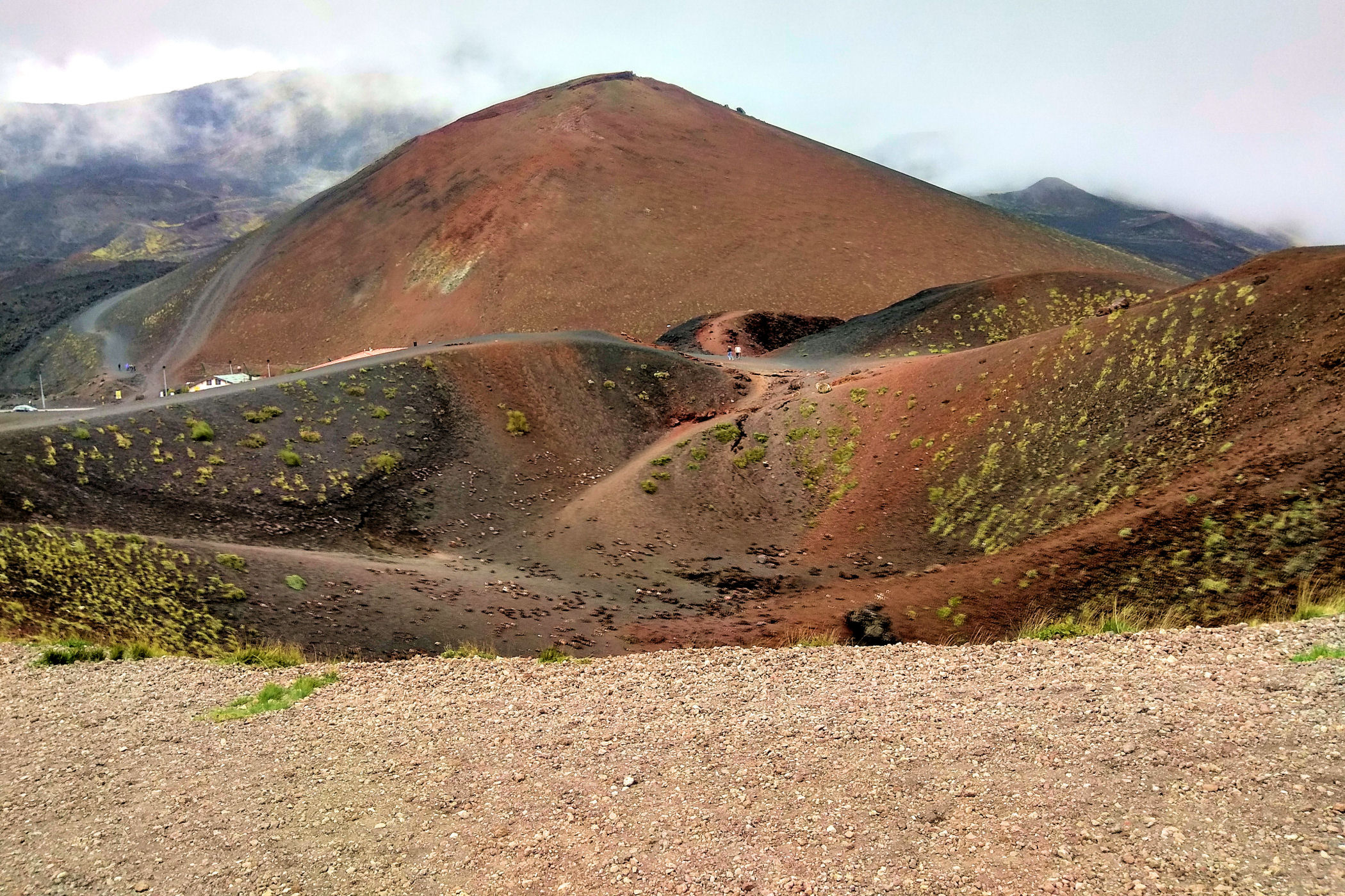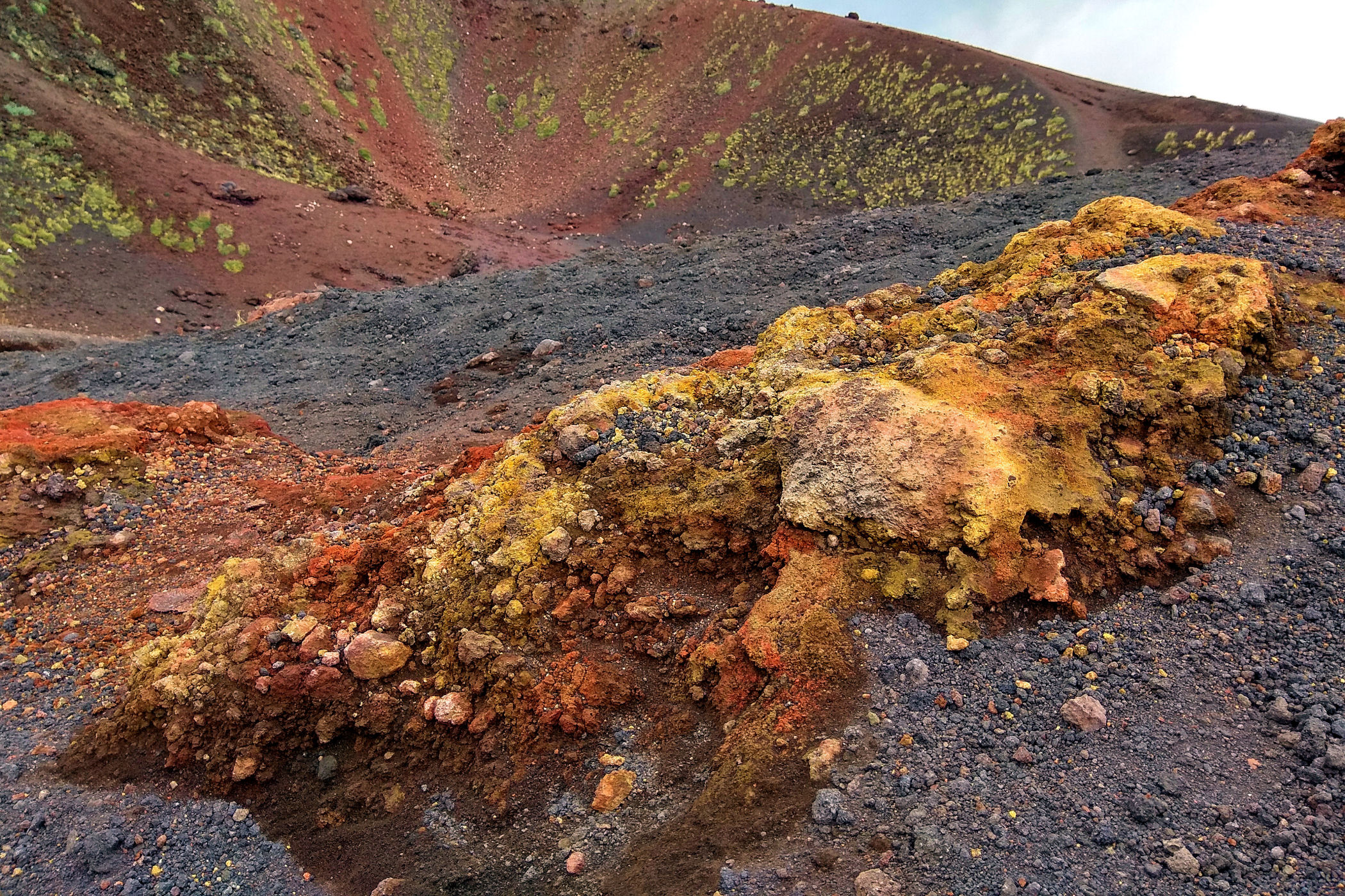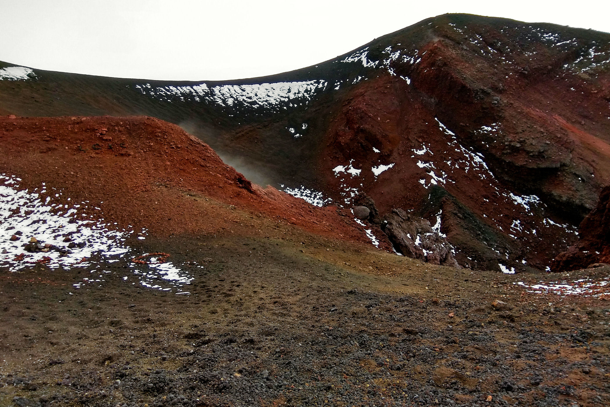 Godzina jeszcze młoda, świętujemy sobie więc nasz sukces przy kawie w kafejce Esagonal ( pod dolną stacją) i ruszamy wzdłuż drogi w kierunku innego krateru. Miałam go oznaczonego na mapie jako ten najbardziej ciekawy i kolorowy – jest mały, ale nie rozczarowuje . Ma faktycznie niesamowite kolory, a w połączeniu z silnym porywistym i lodowatym wiatrem ( który co ciekawe nie był odczuwalny na Etnie – tam było jakoś zacisznie) sprawia, że czujemy się jak na Islandii.