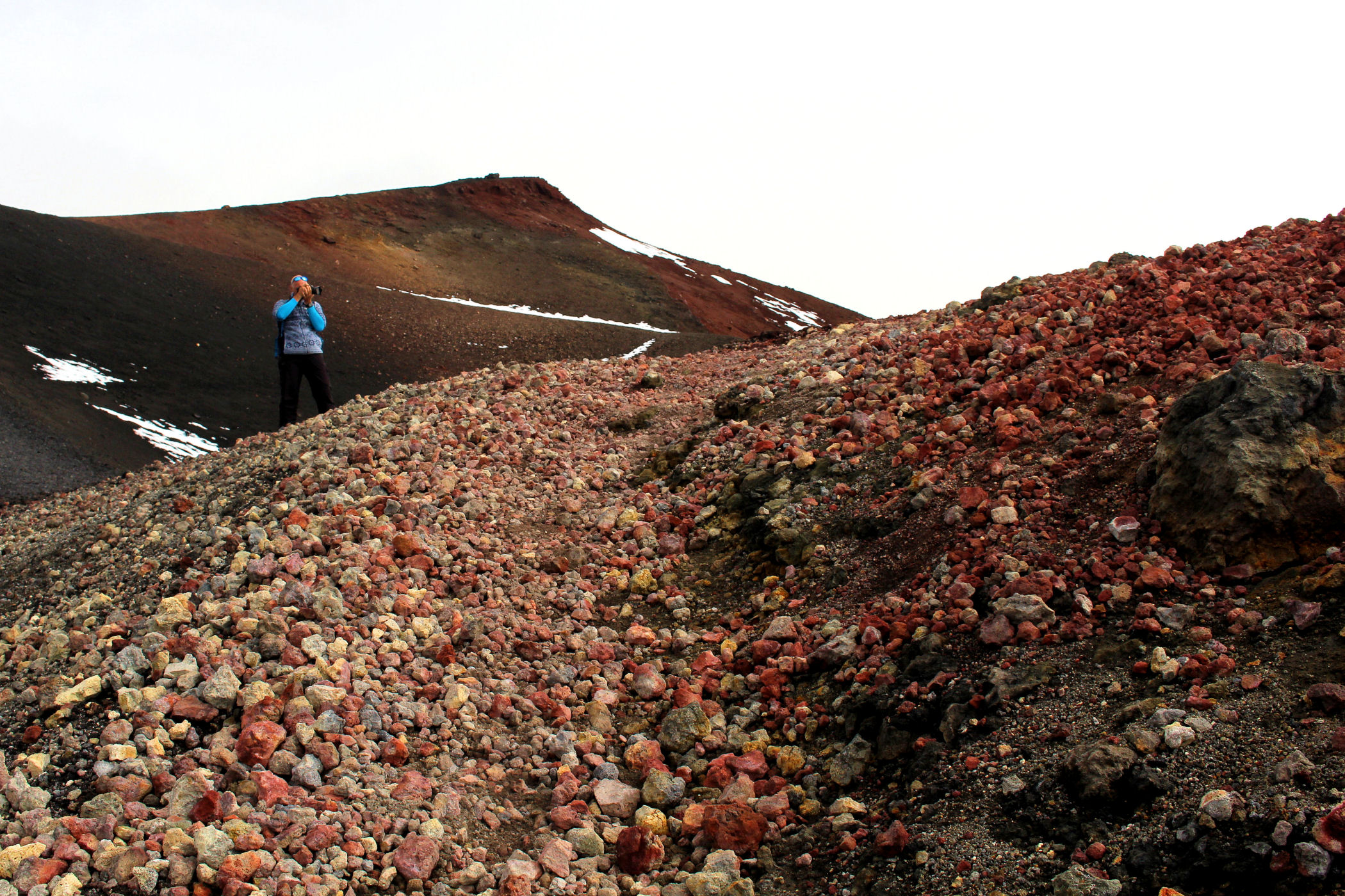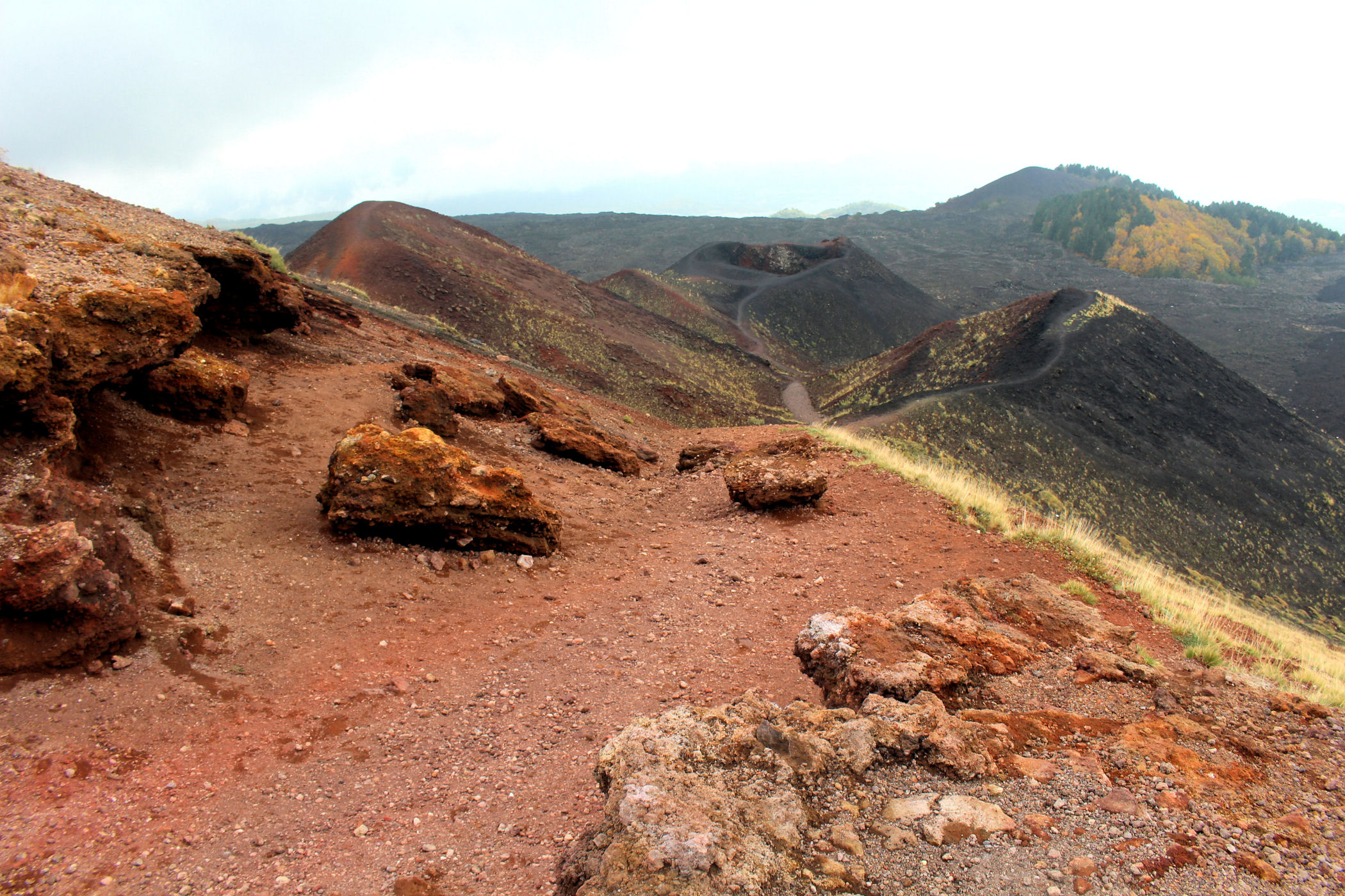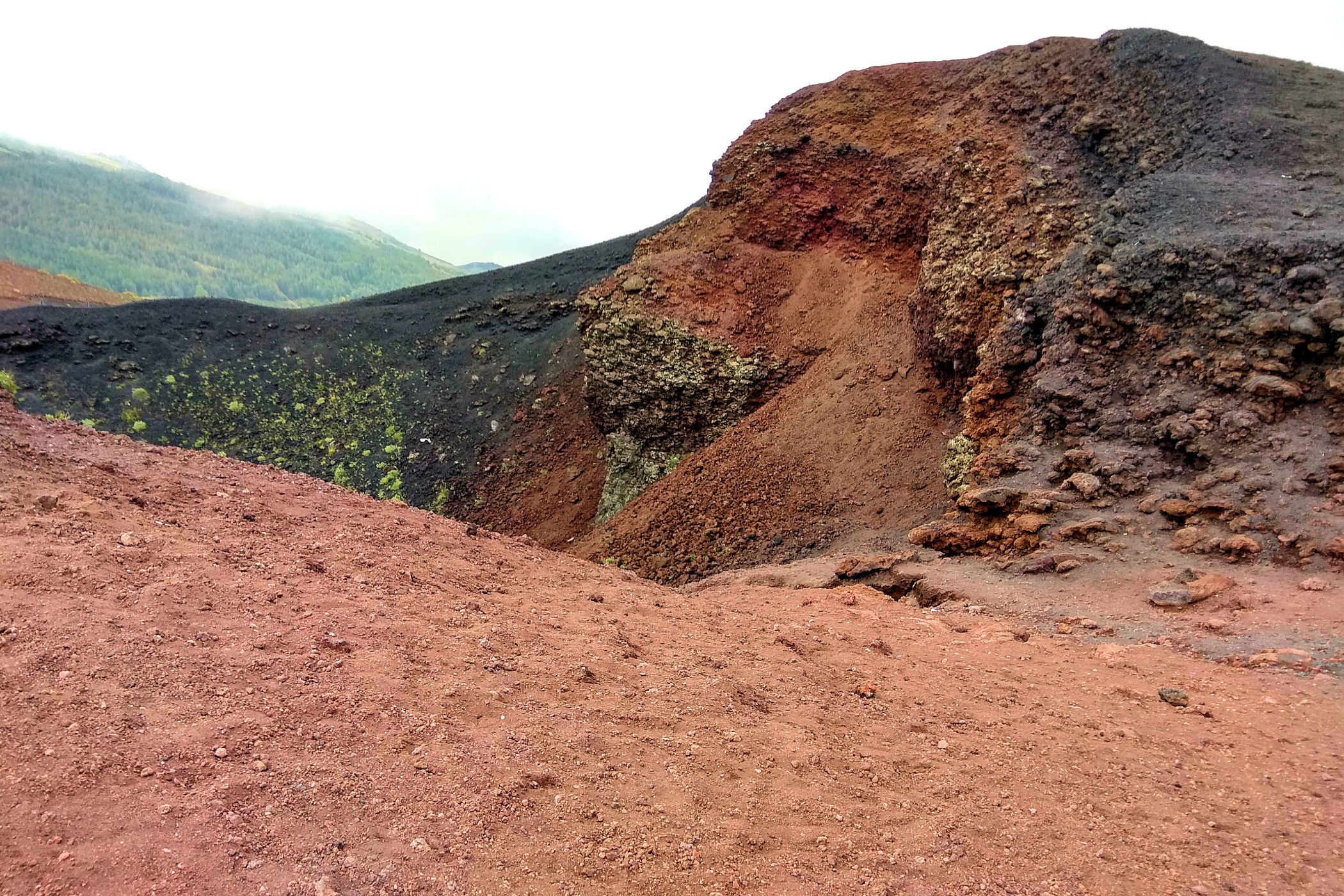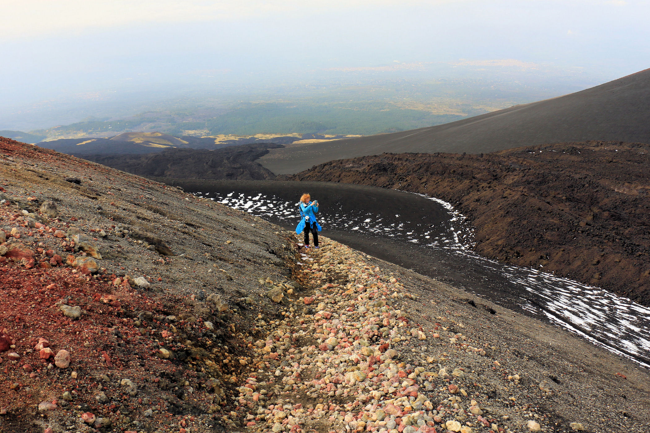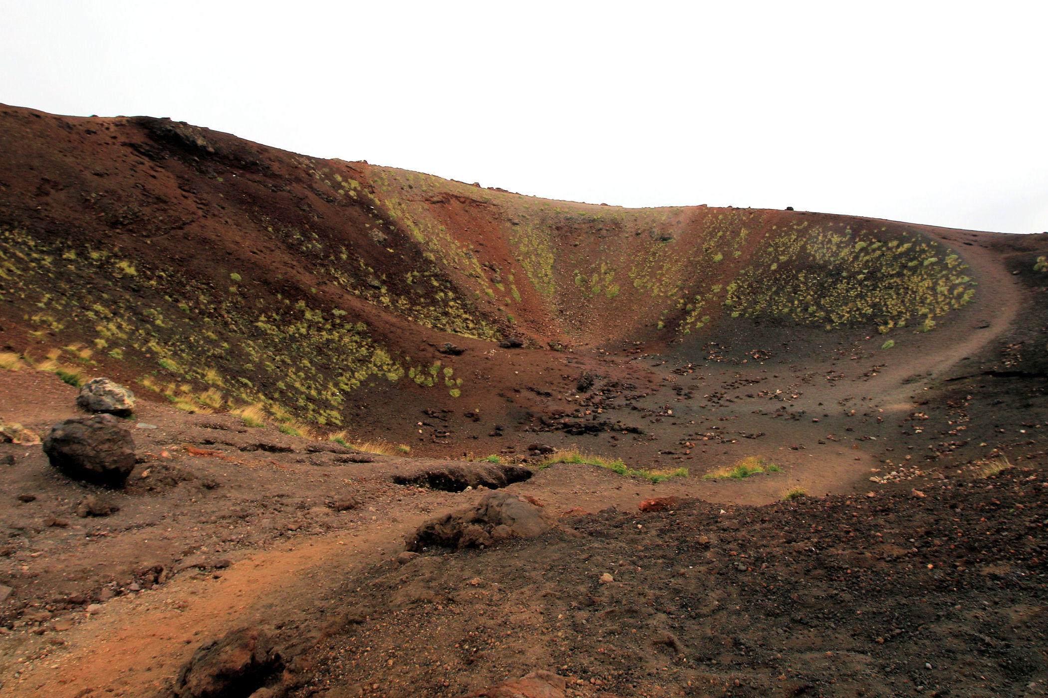 Godzina jeszcze młoda, świętujemy sobie więc nasz sukces przy kawie w kafejce Esagonal ( pod dolną stacją) i ruszamy wzdłuż drogi w kierunku innego krateru. Miałam go oznaczonego na mapie jako ten najbardziej ciekawy i kolorowy – jest mały, ale nie rozczarowuje . Ma faktycznie niesamowite kolory, a w połączeniu z silnym porywistym i lodowatym wiatrem ( który co ciekawe nie był odczuwalny na Etnie – tam było jakoś zacisznie) sprawia, że czujemy się jak na Islandii.
