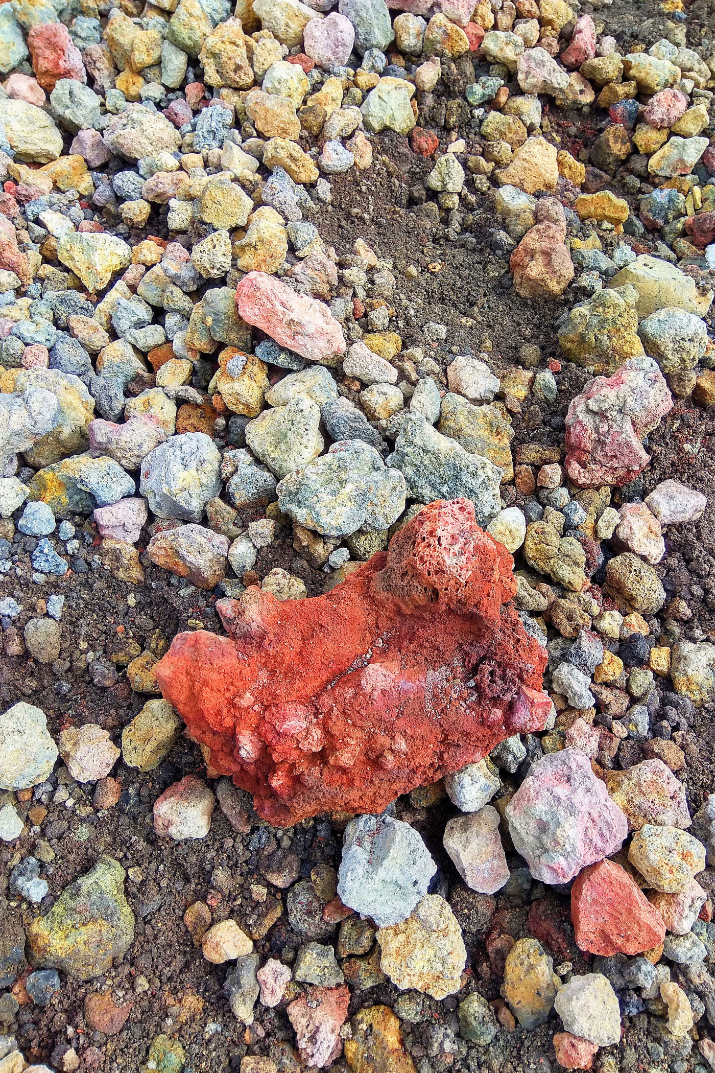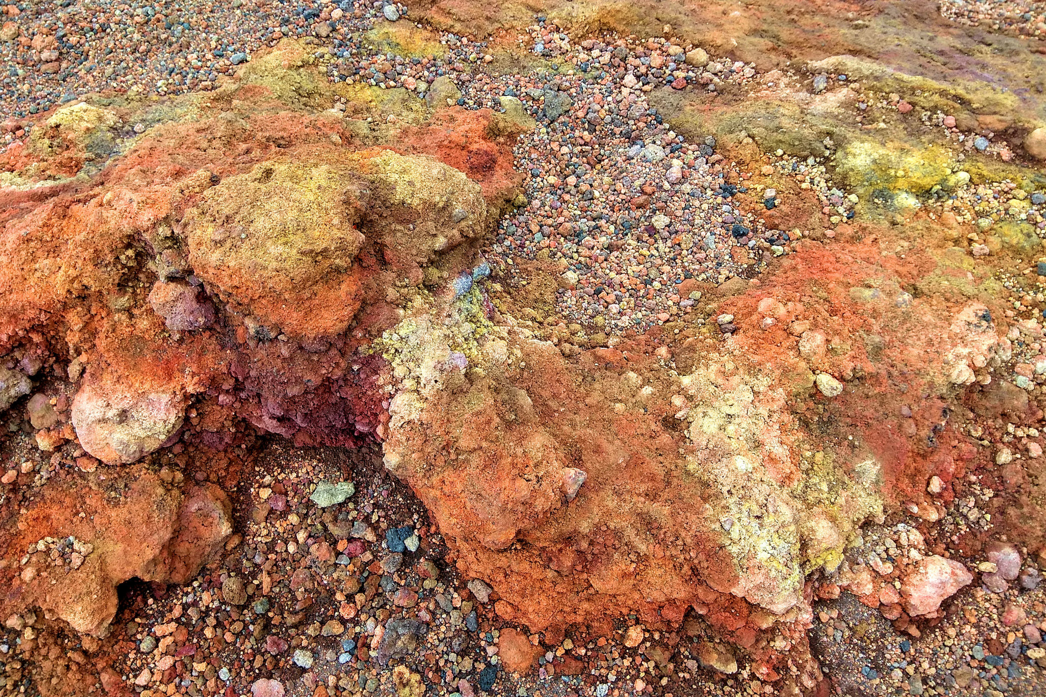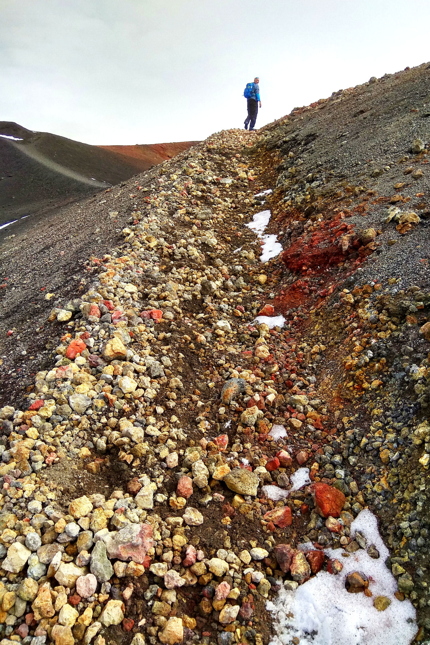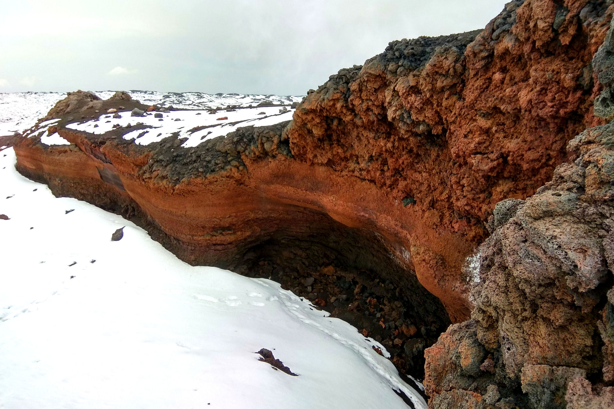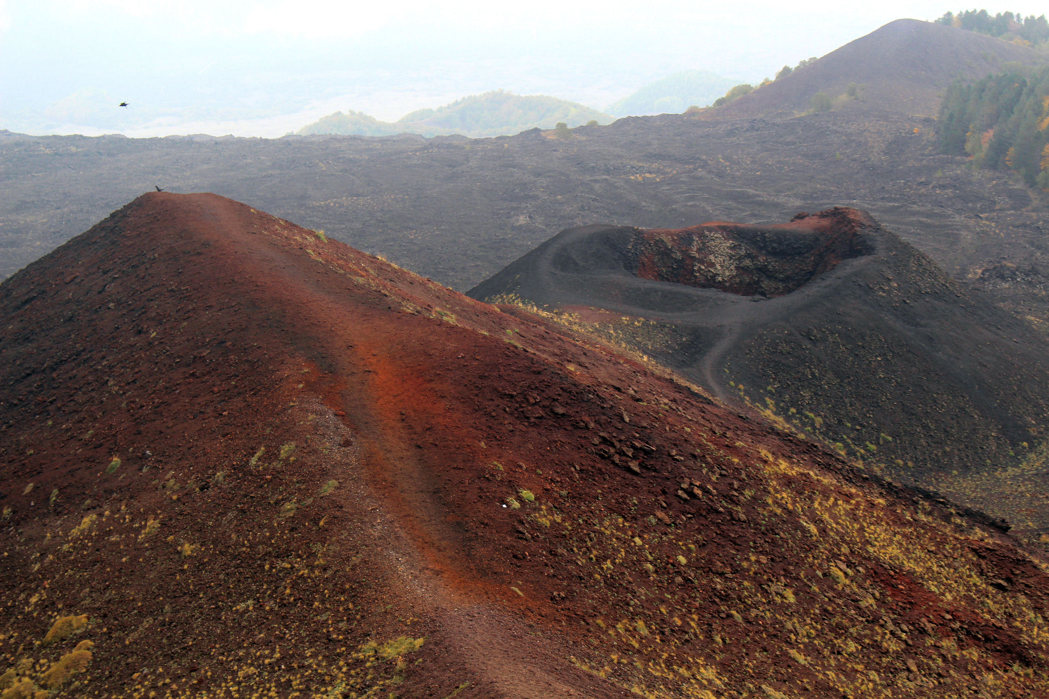 Godzina jeszcze młoda, świętujemy sobie więc nasz sukces przy kawie w kafejce Esagonal ( pod dolną stacją) i ruszamy wzdłuż drogi w kierunku innego krateru. Miałam go oznaczonego na mapie jako ten najbardziej ciekawy i kolorowy – jest mały, ale nie rozczarowuje . Ma faktycznie niesamowite kolory, a w połączeniu z silnym porywistym i lodowatym wiatrem ( który co ciekawe nie był odczuwalny na Etnie – tam było jakoś zacisznie) sprawia, że czujemy się jak na Islandii.