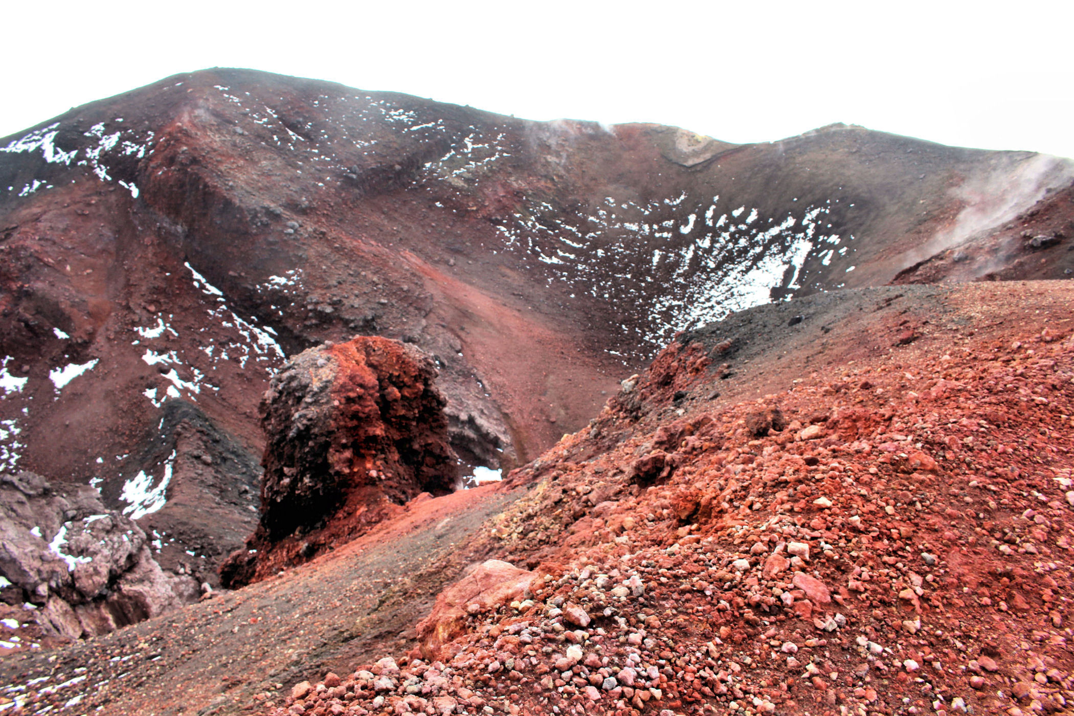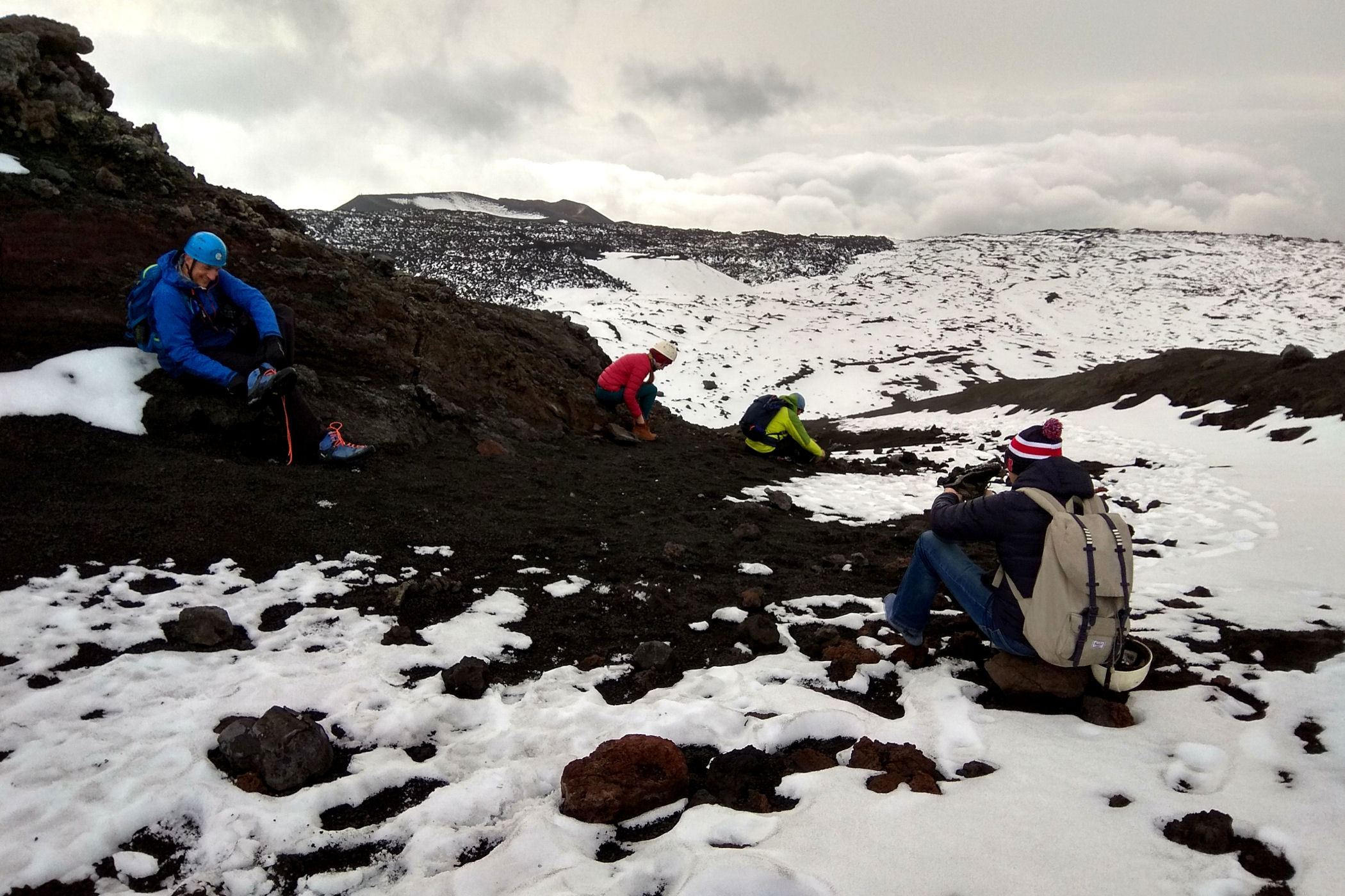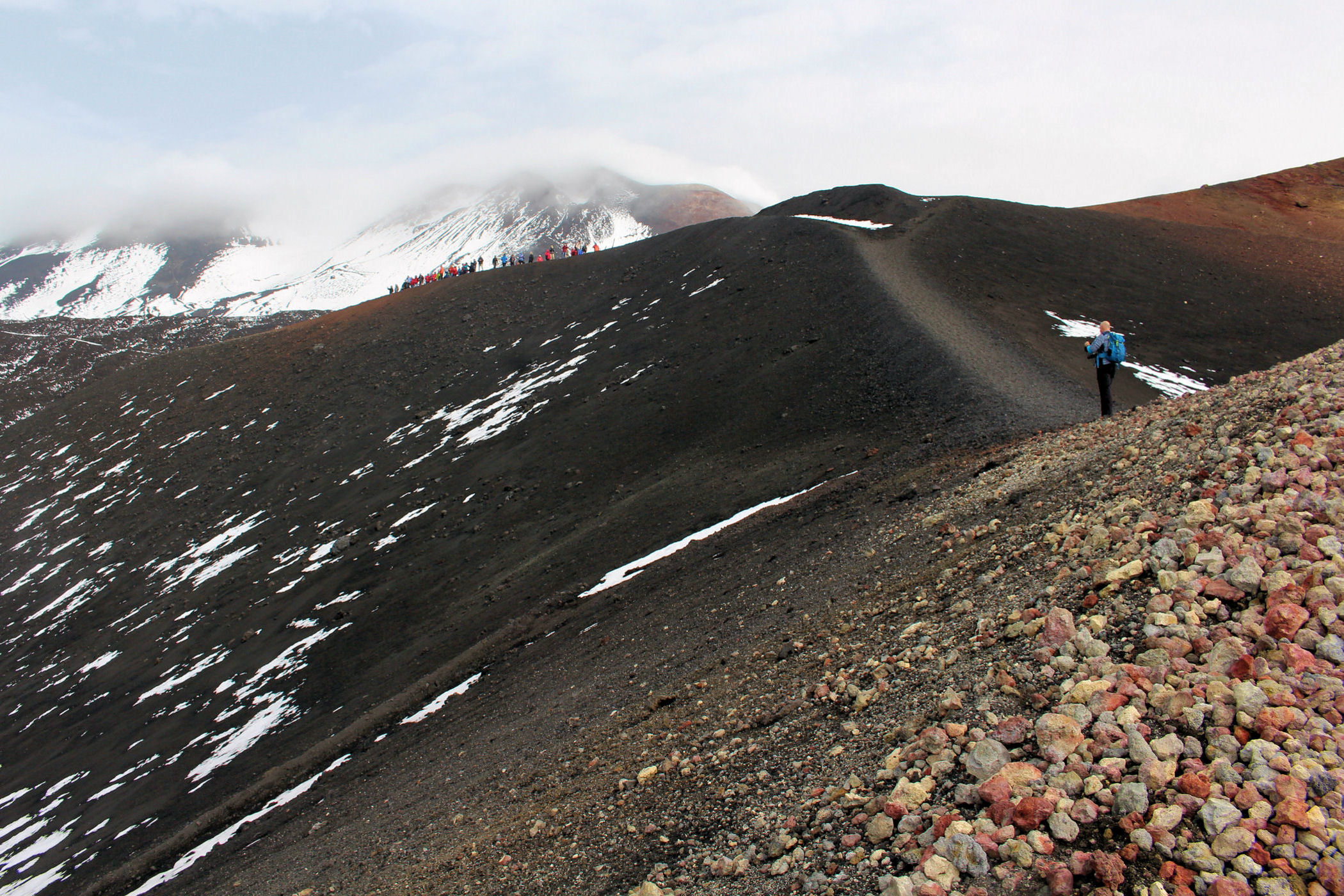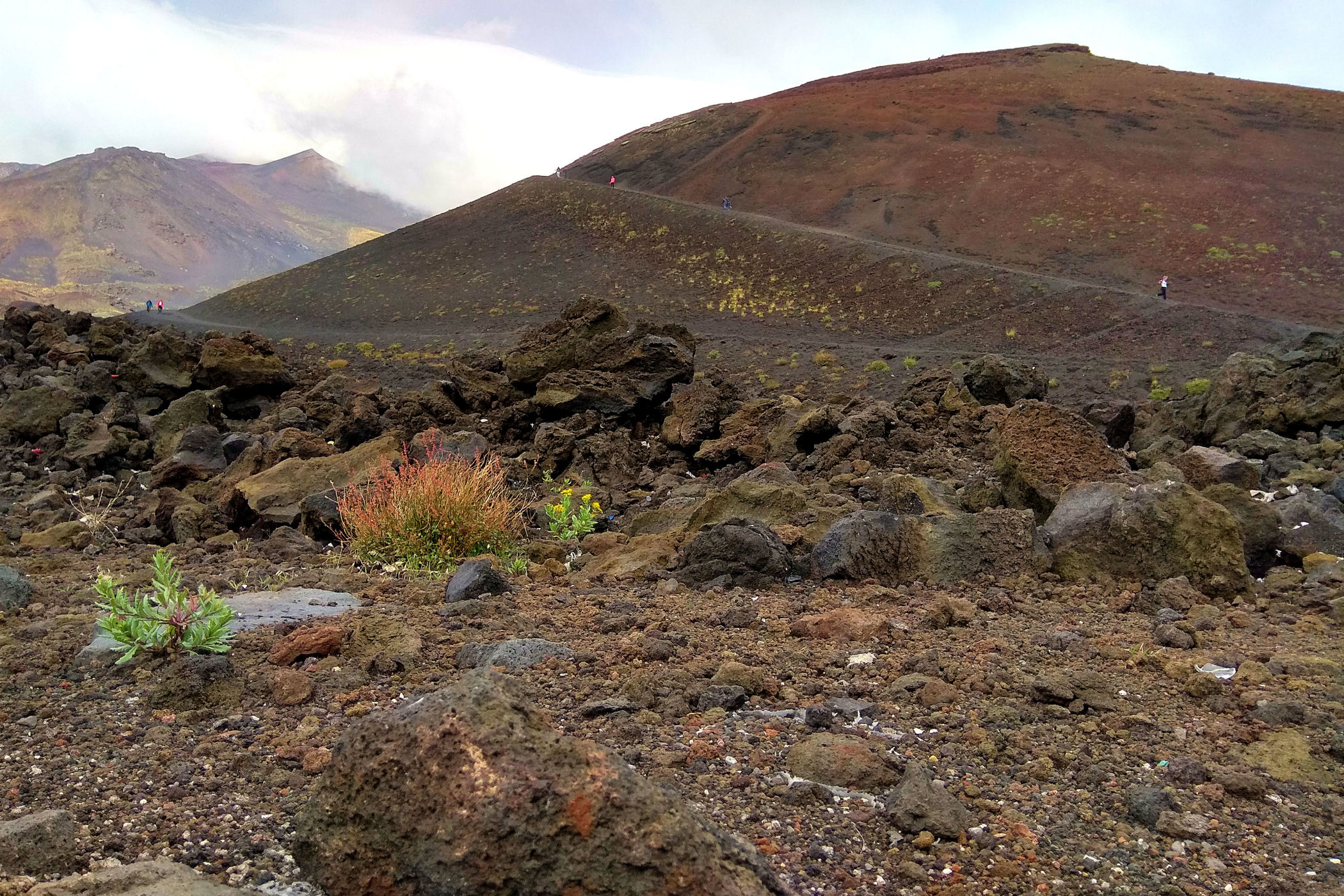 Po godzinie spokojnego podejścia jesteśmy w miejscu gdzie dojeżdżają wszystkie wycieczki. To krater Bargaballo – fantastyczne kolorowe wgłębienie w ziemi. Zorganizowane wycieczki na Etnę tu mają swój cel, obchodzą krater dookoła, a potem wracają z powrotem. Przy kraterze spotykamy się z parą zaprzyjaźnionych Rosjan, wspólnie decydujemy się dalszą wędrówkę, pytanie tylko jak – wokół mnóstwo ludzi i przewodników, dalsza ścieżka jest zastawiona łańcuchem z ostrzeżeniem o zakazie wejścia, szukam innego wejścia, ale nic nie ma. Idziemy więc do budki obok parkingów dla jeepów. Tu siedzi jeden przewodnik i choć twierdzi, że już za późno na wejście szczytowe – daje się przekonać (argument, że zajdziemy szybko działa) . Negocjujemy cenę , nie daję się przekonać do mniej niż 200 euro za grupę (czyli 50 od głowy – standardowa cena takiej usługi na Etnie) . W kwestii szybkości zajścia – prawdę mówiąc swojej kondycji jesteśmy pewni, nie znamy jednak kompletnie możliwości naszych towarzyszy – liczymy jednak, że różnica wieku zrobi swoje.