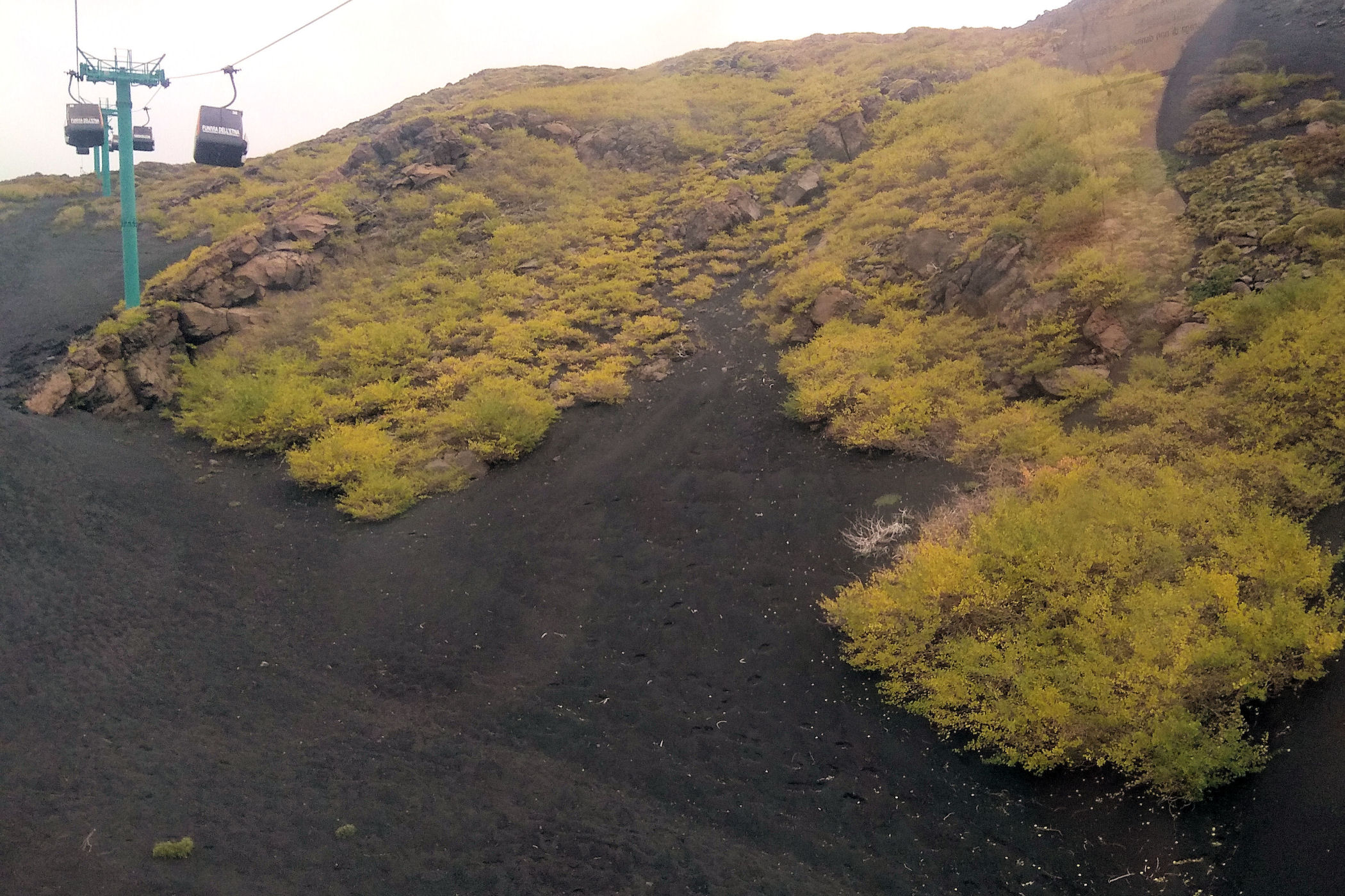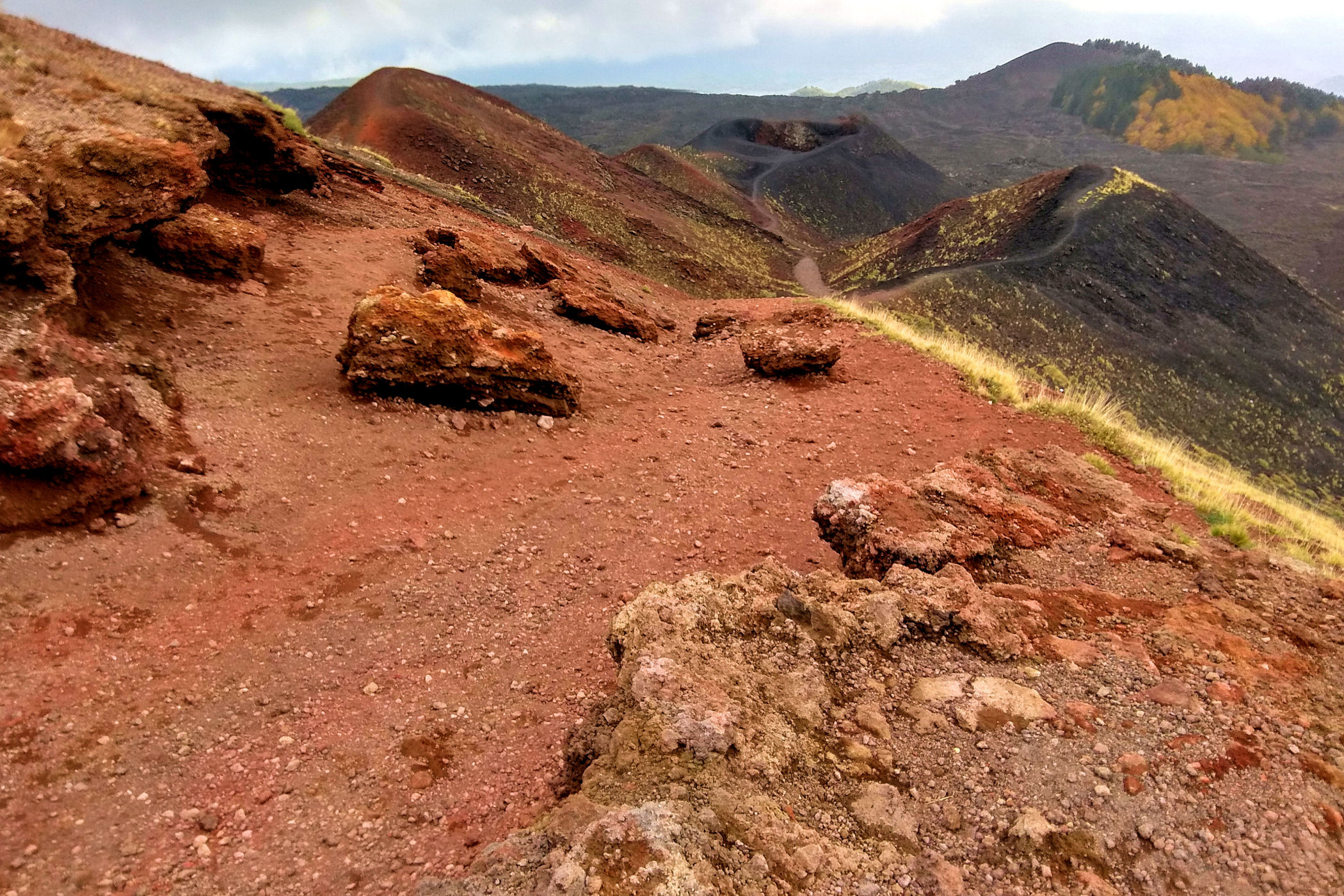 Tu większość osób wybiera opcję wjazdu jeepami (bilet kupuje się wraz z biletem na kolejkę – to kosztuje w sumie z opieką przewodnika na tej wysokości – 86 euro) . My ruszamy spod górnej stacji kolejki czyli z wysokości 2500m na piechotkę . Czytałam relację, że przejście nie jest przyjemne, bo przejeżdżające jeepy wzniecają pył wulkaniczny i nie da się oddychać, ale to nie prawda, tylko pierwszy odcinek pokonujemy ich drogą, dalej można odbić w lewo i obejść Monte Frumento Supino niejako z lewej strony ledwo widoczną ścieżką dochodząc do Crateri Barbagallo od tyłu.