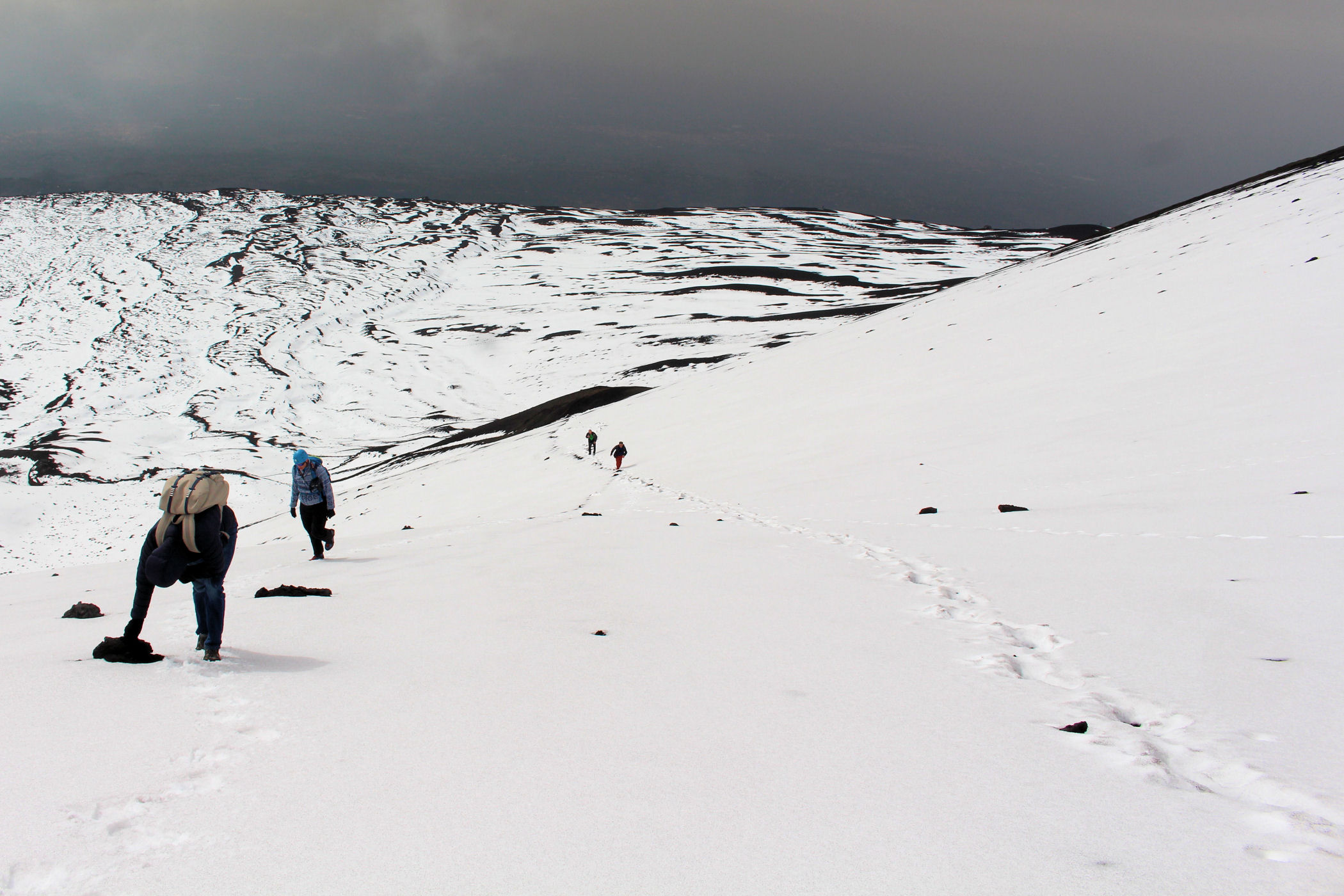 Dostajemy kaski i ruszamy od razu. Za moment przekraczamy magiczną barierę 3000m n.p.m. Przewodnik zgodnie z ustaleniem narzuca ostre tempo. Oddycha się już ciężko na tej wysokości, a szybkość robi swoje. Widzimy inną grupę, która już schodzi z góry. Sprawa późnej godziny i obaw przewodnika się wyjaśnia – okazuje się, że wulkan w godzinach popołudniowych robi się aktywny i zaczyn wypluwać z siebie zawartość wnętrza. To może się wydawać zabawne, ale w zeszłym roku taka bomba wulkaniczna zabiła znajomego właśnie na Etnie. Staramy się więc iść jak najszybciej na ile siły i oddech pozwalają. Nasz sycylijski przewodnik patrzy na moje buty z dezaprobatą i nie daje sobie wmówić, że w takich samych szłam na ponad 5000 w Himalajach …