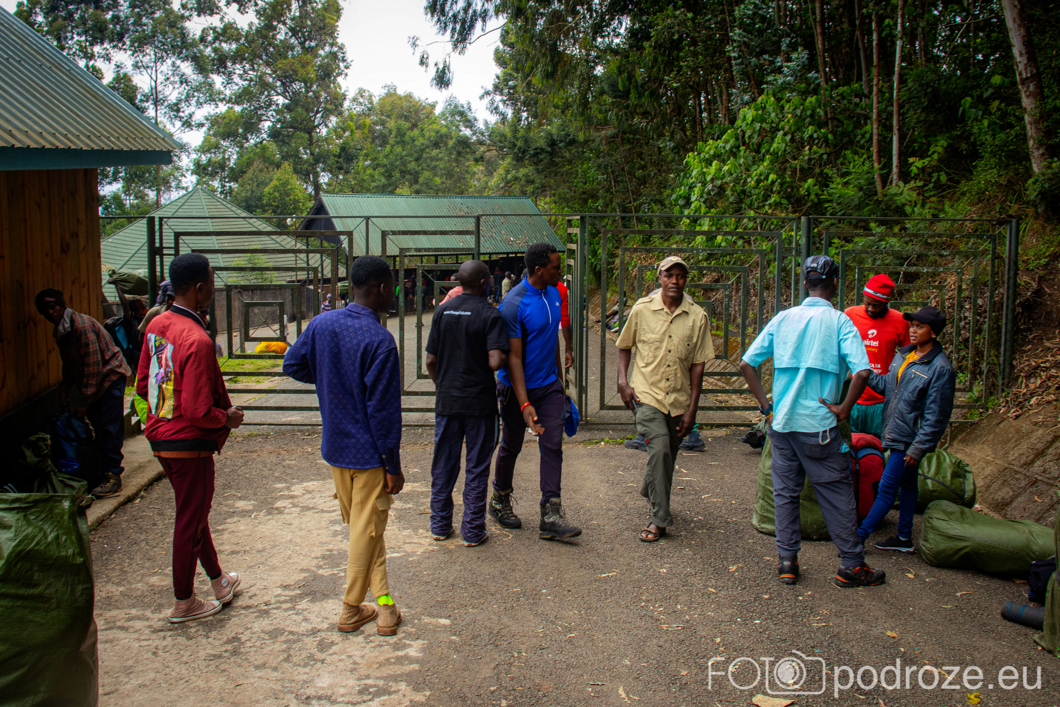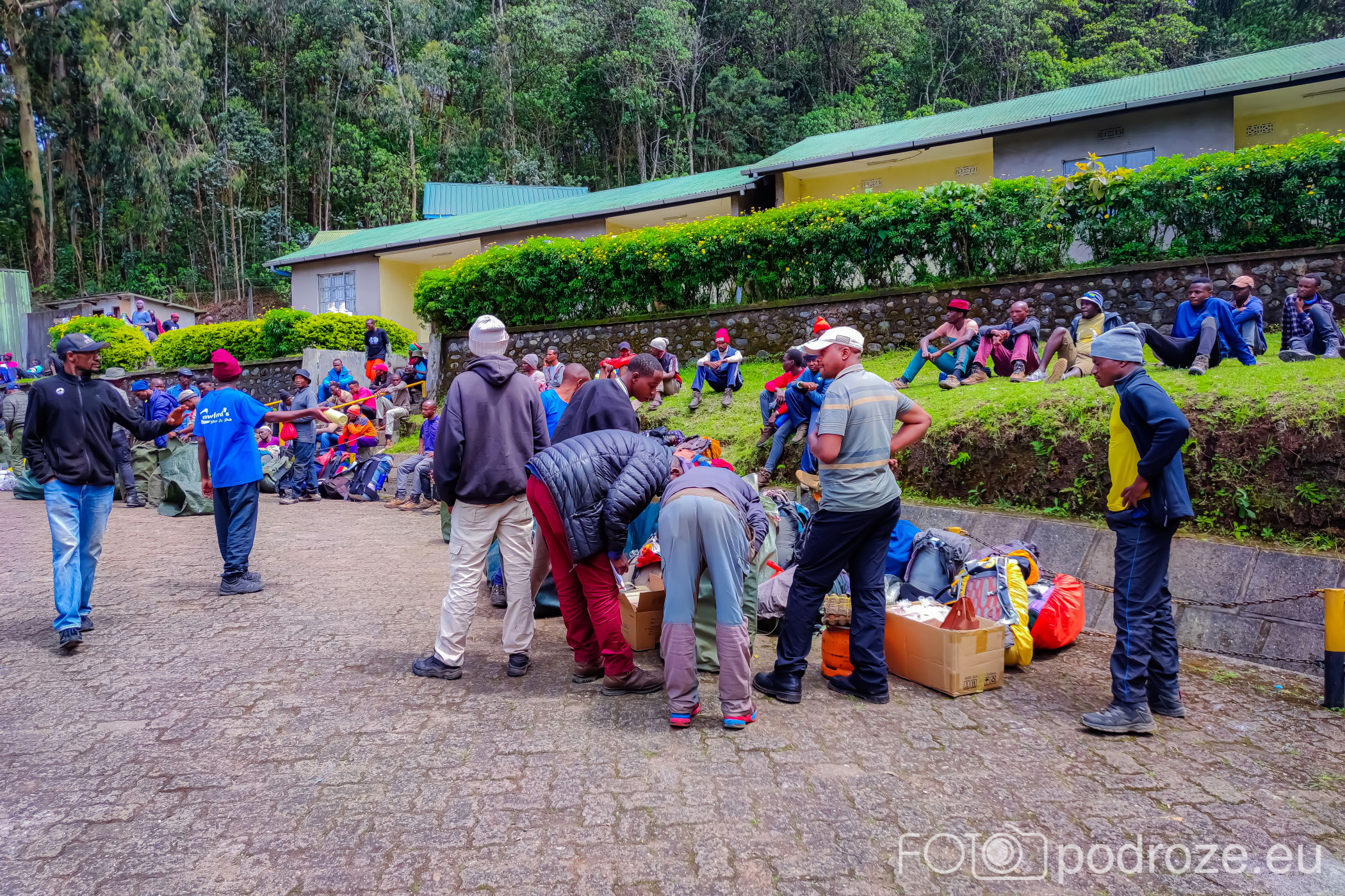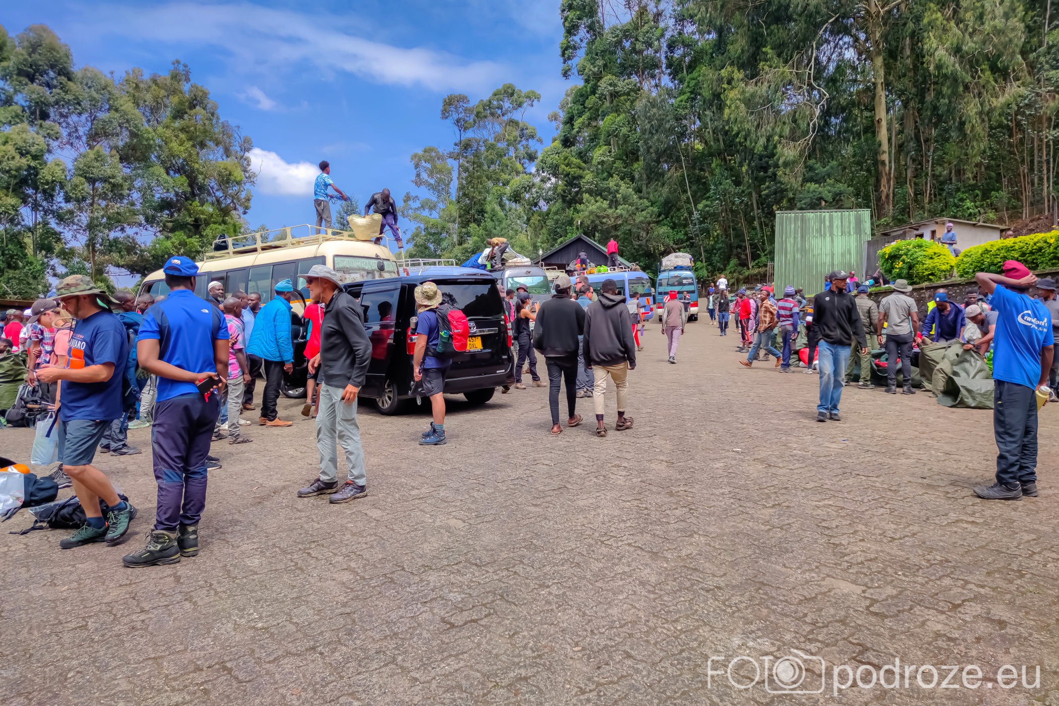 Do Machame Gate, czyli bramy Parku Narodowego Kilimandżaro jedziemy już teraz około 45 minut. Za charakterystyczną drewnianą bramą duży parking, na nim kilkanaście załadowanych busów i setki oczekujących na swoje grupy porterów i przewodników.