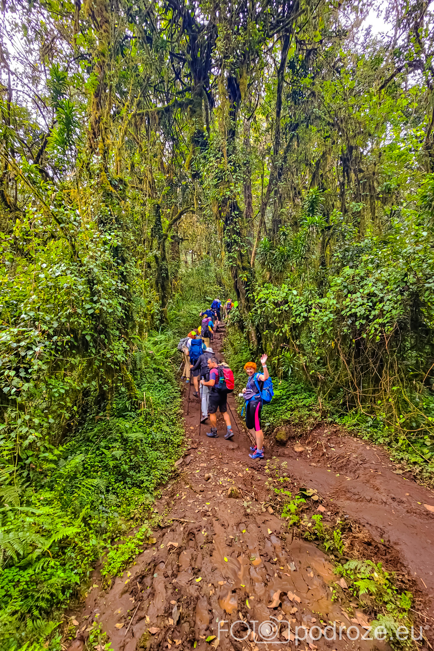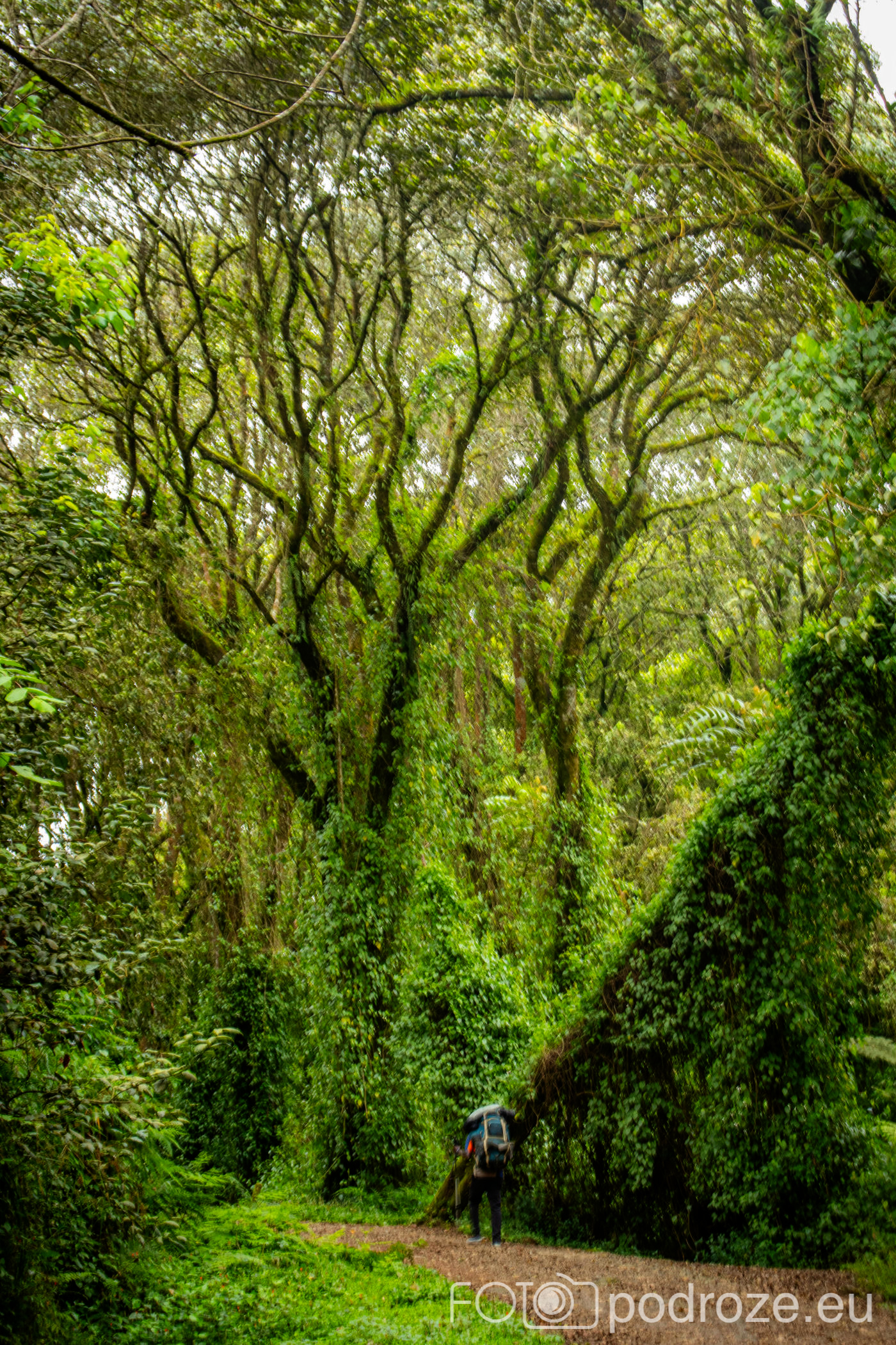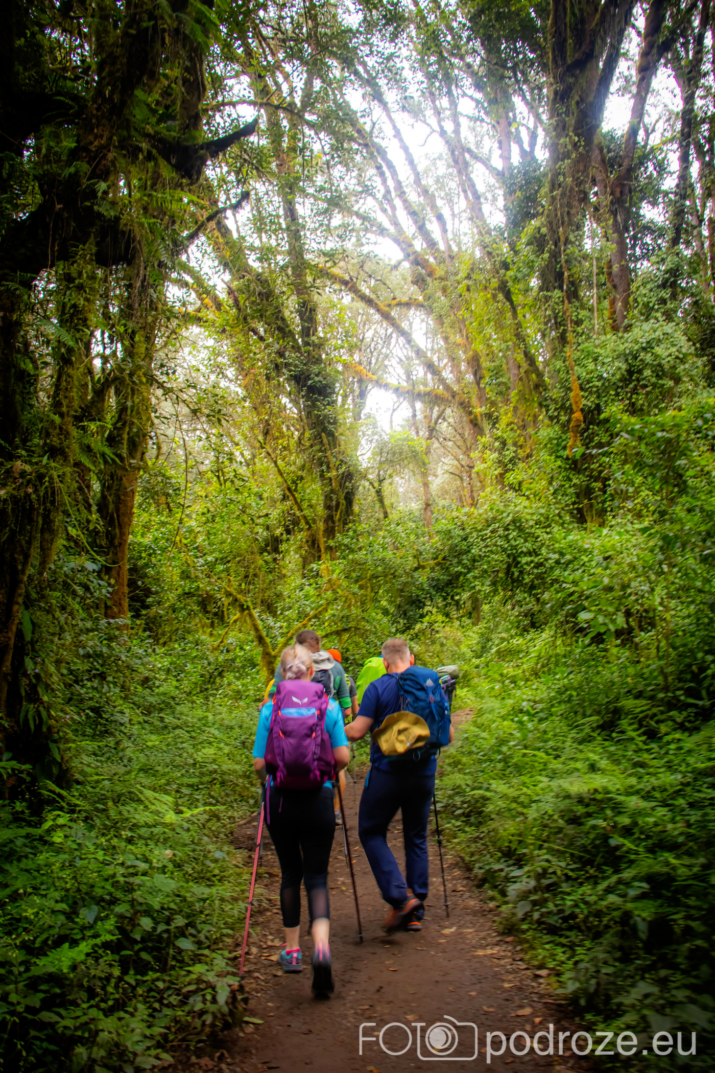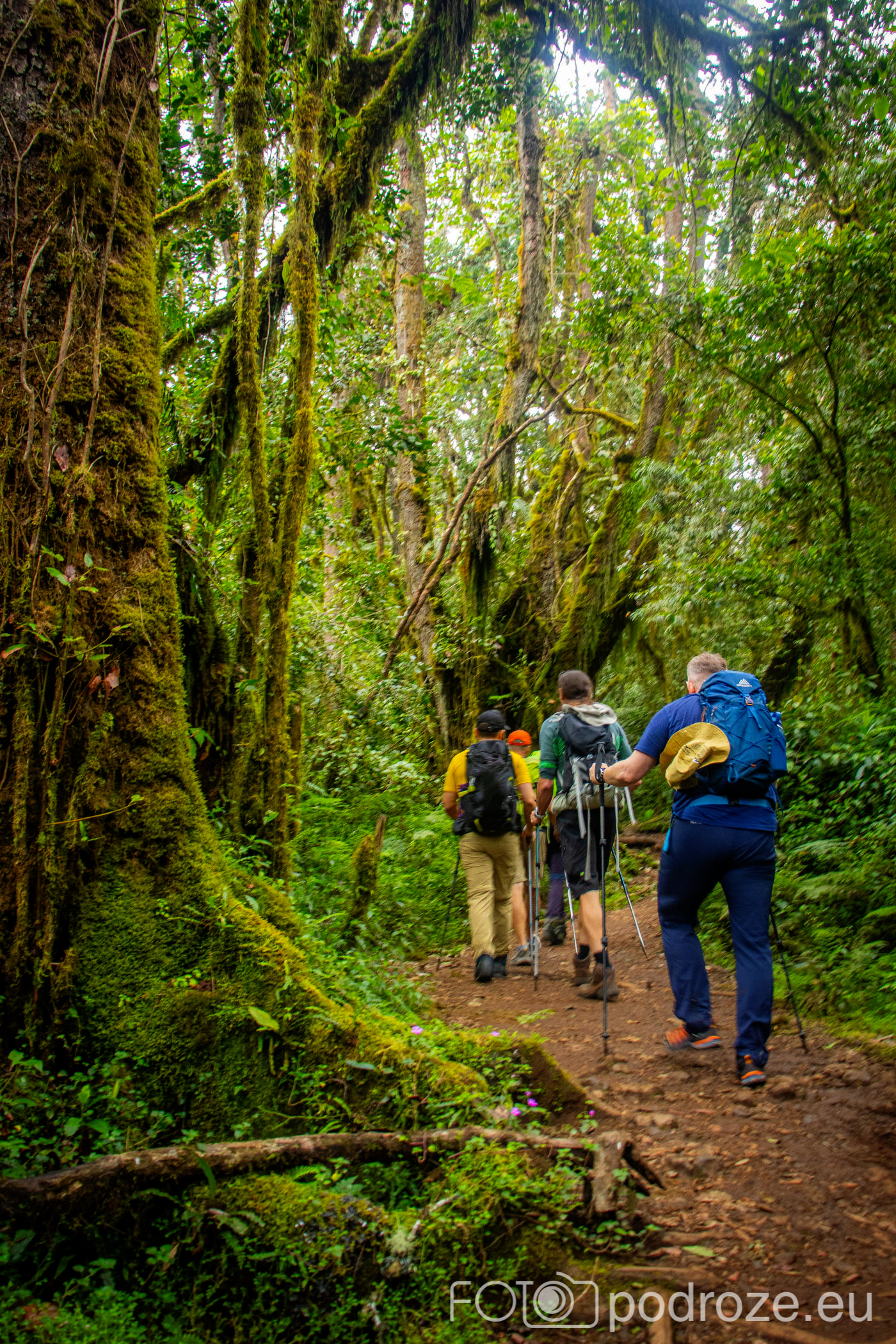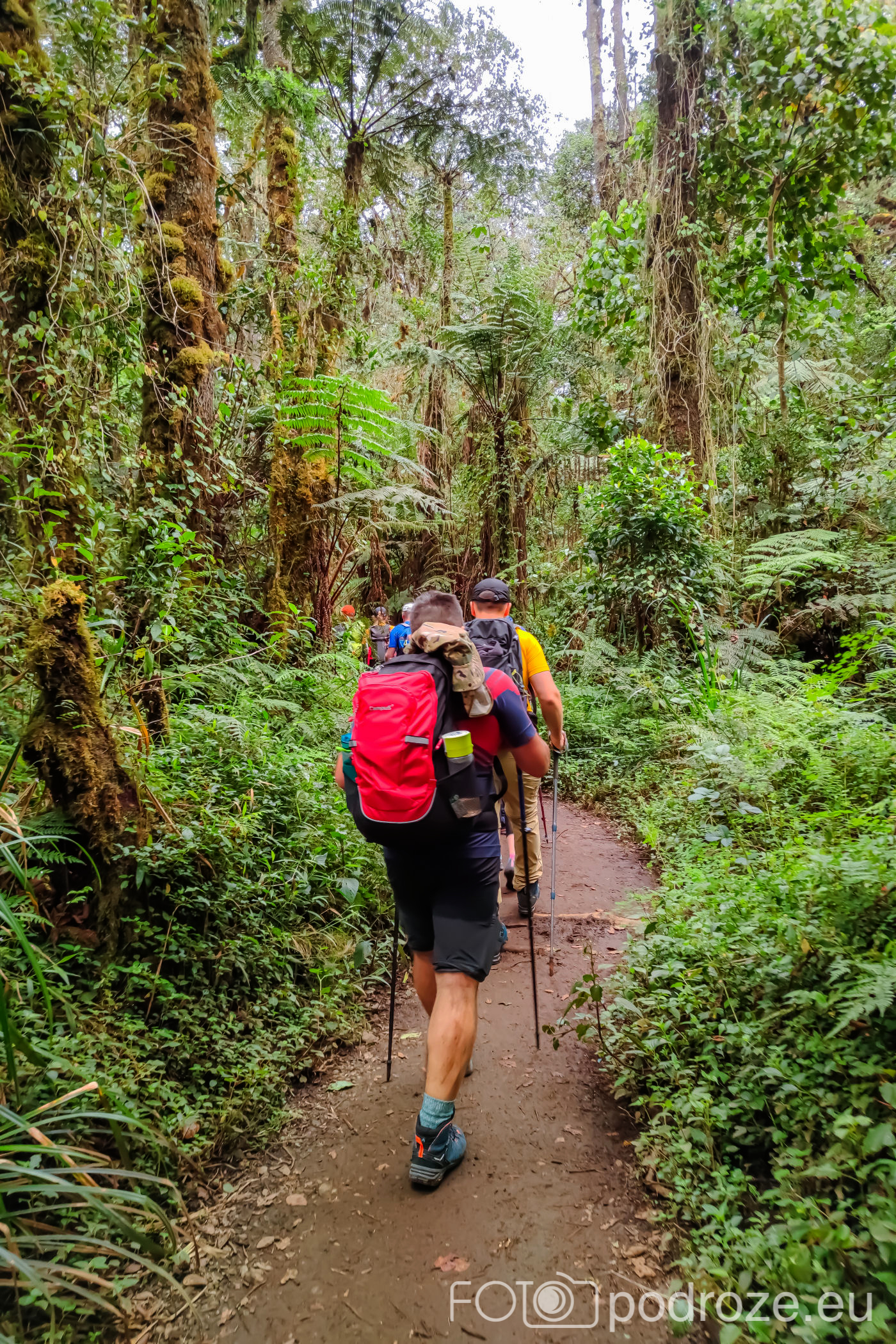 Wolno, kroczek za kroczkiem, cały czas popijając. Jeszcze choroba wysokościowa nas nie dotyczy, ale aby jej nie mieć lub przejść łagodnie, trzeba się mocno nawadniać od samego początku. Robimy kilka przerw, aby opróżnić pęcherze, nawodnić się, ewentualnie przebrać. Chowam do plecaka aparat, bo o tej porze dnia w tej części masywu Kilimandżaro nie ma już w ogóle słońca, a i pora powoli jest coraz późniejsza. Szlak jest raz łagodny, raz droga pnie się mocniej w górę. W końcu wcale nie mało mamy dzisiaj do przejścia, bo około 1200 metrów różnicy wysokości.