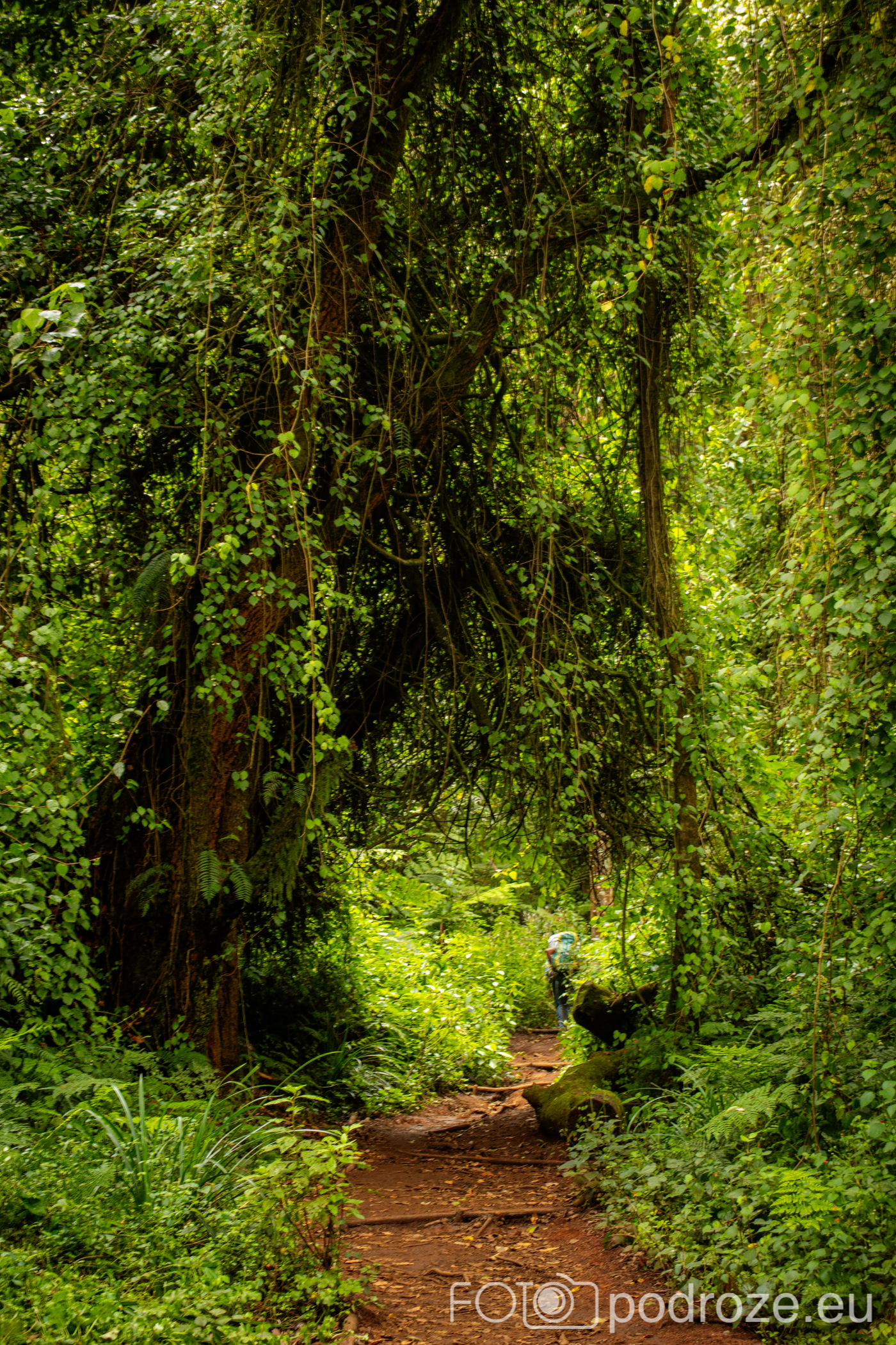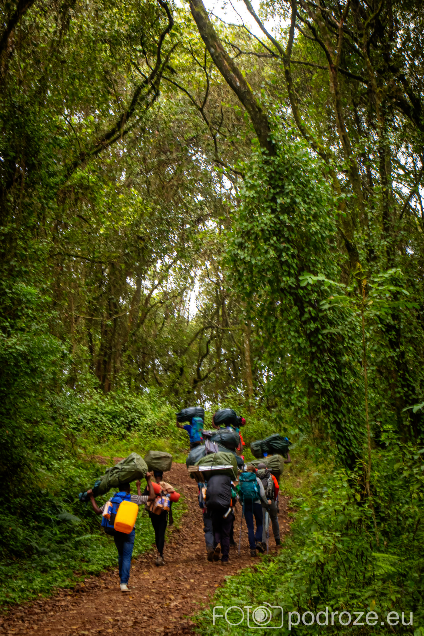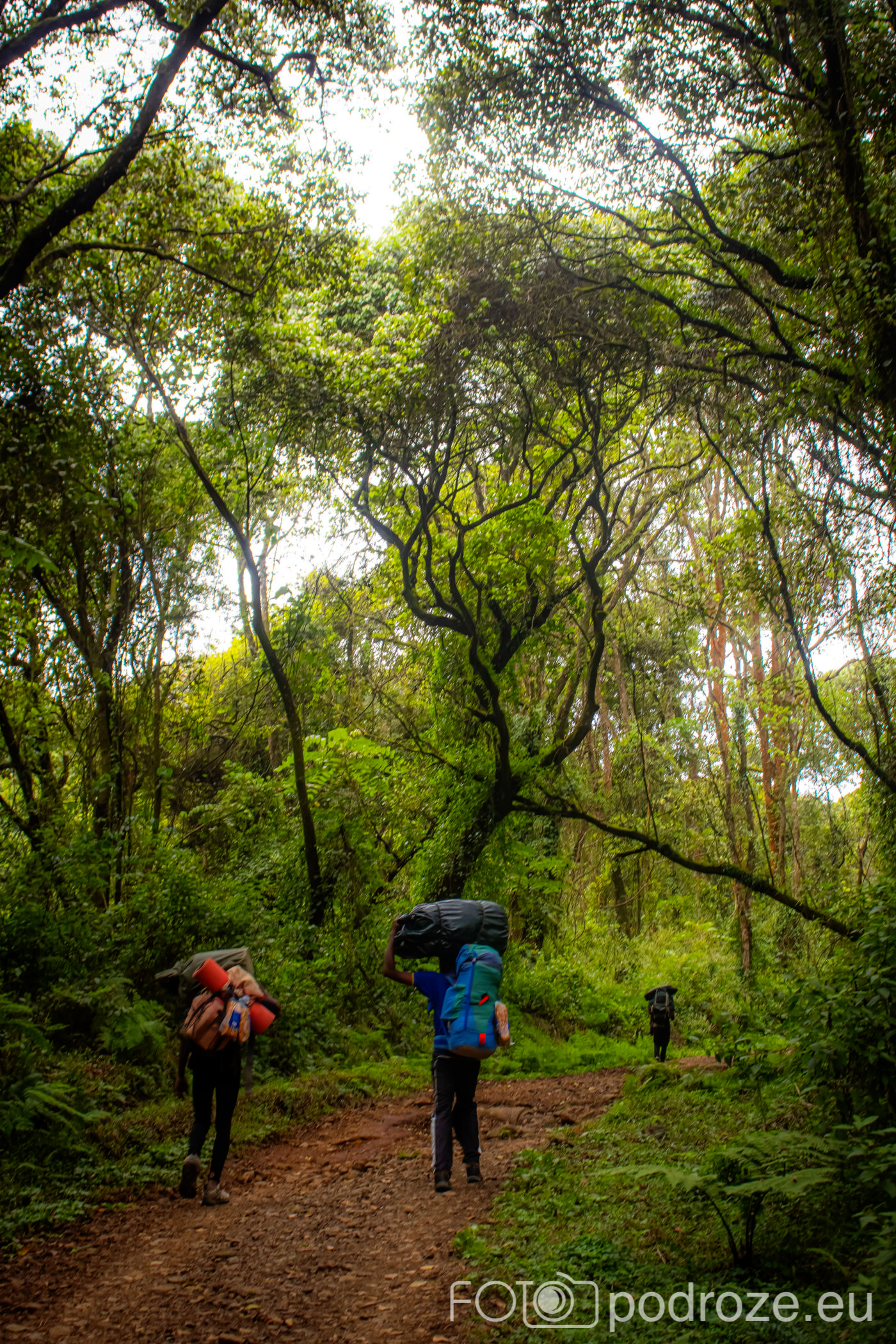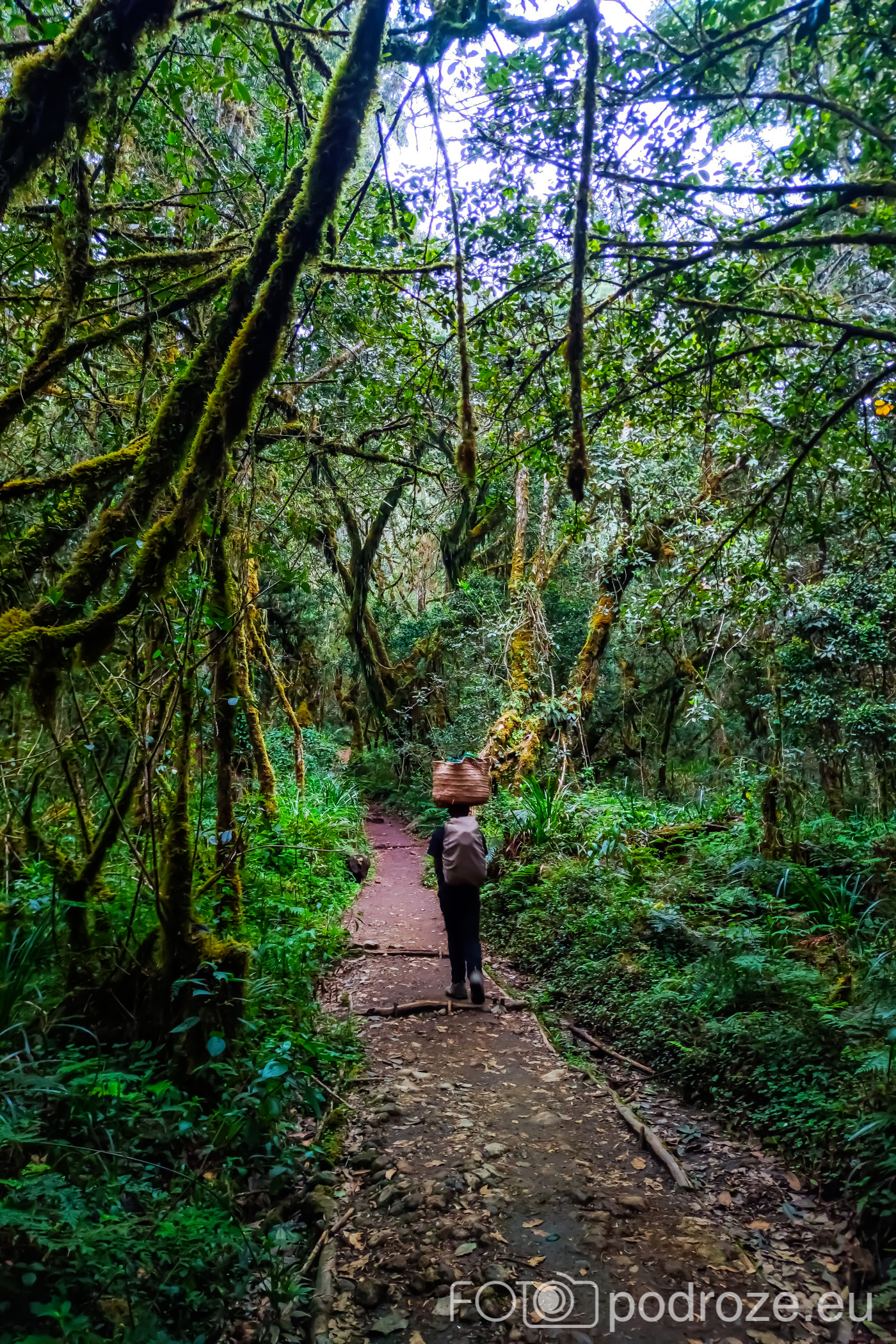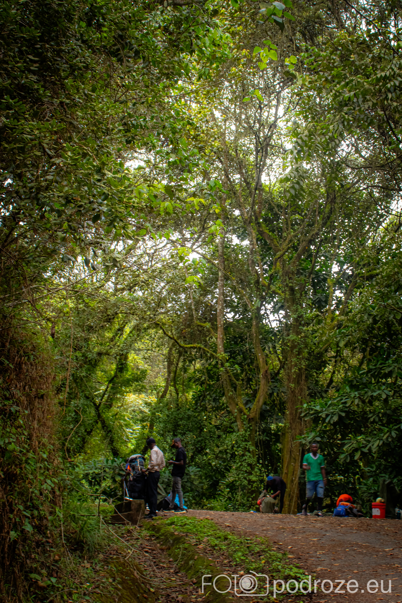 Wolno, kroczek za kroczkiem, cały czas popijając. Jeszcze choroba wysokościowa nas nie dotyczy, ale aby jej nie mieć lub przejść łagodnie, trzeba się mocno nawadniać od samego początku. Robimy kilka przerw, aby opróżnić pęcherze, nawodnić się, ewentualnie przebrać. Chowam do plecaka aparat, bo o tej porze dnia w tej części masywu Kilimandżaro nie ma już w ogóle słońca, a i pora powoli jest coraz późniejsza. Szlak jest raz łagodny, raz droga pnie się mocniej w górę. W końcu wcale nie mało mamy dzisiaj do przejścia, bo około 1200 metrów różnicy wysokości.