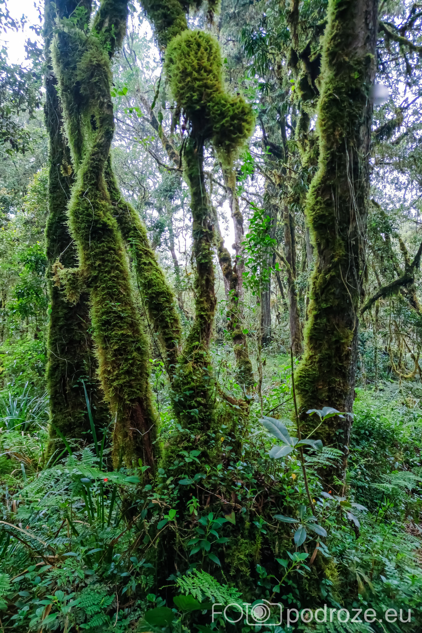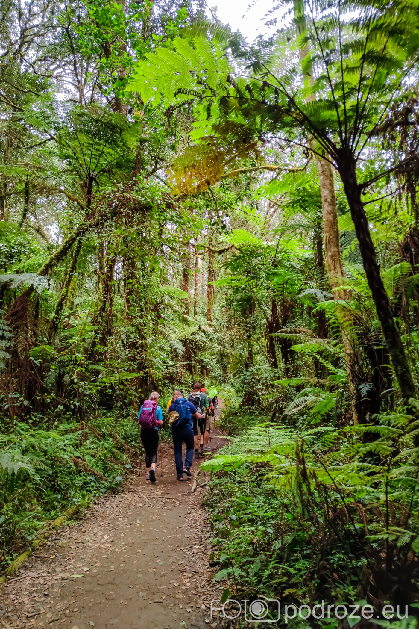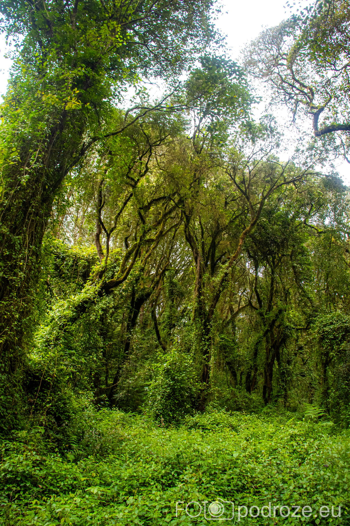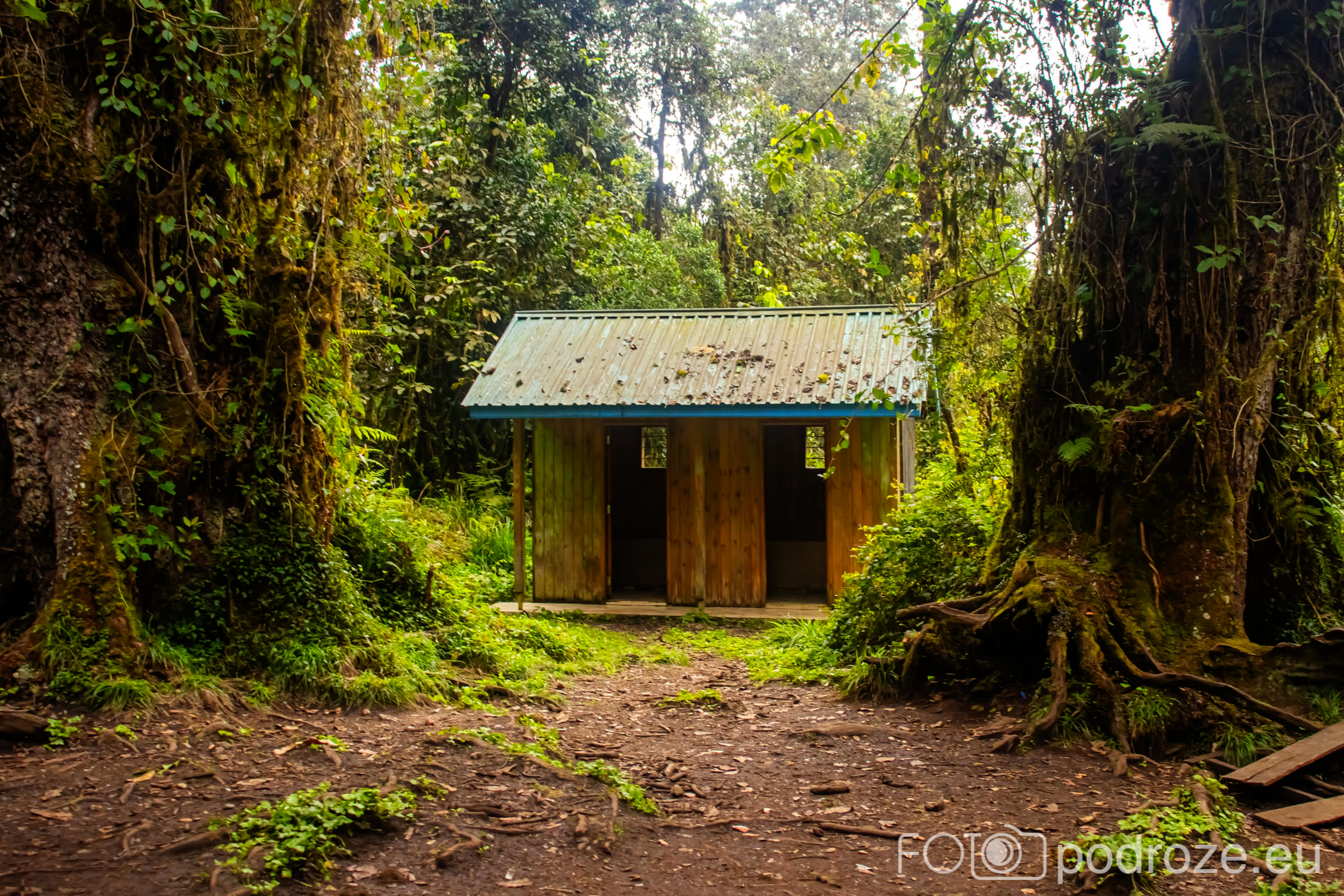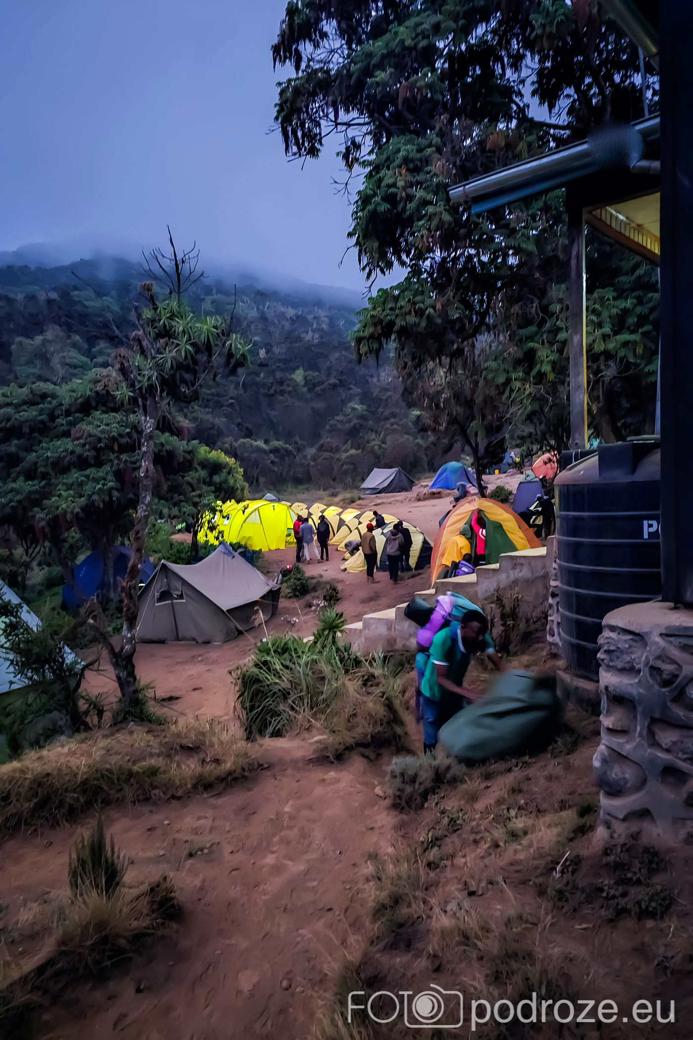 Wolno, kroczek za kroczkiem, cały czas popijając. Jeszcze choroba wysokościowa nas nie dotyczy, ale aby jej nie mieć lub przejść łagodnie, trzeba się mocno nawadniać od samego początku. Robimy kilka przerw, aby opróżnić pęcherze, nawodnić się, ewentualnie przebrać. Chowam do plecaka aparat, bo o tej porze dnia w tej części masywu Kilimandżaro nie ma już w ogóle słońca, a i pora powoli jest coraz późniejsza. Szlak jest raz łagodny, raz droga pnie się mocniej w górę. W końcu wcale nie mało mamy dzisiaj do przejścia, bo około 1200 metrów różnicy wysokości.