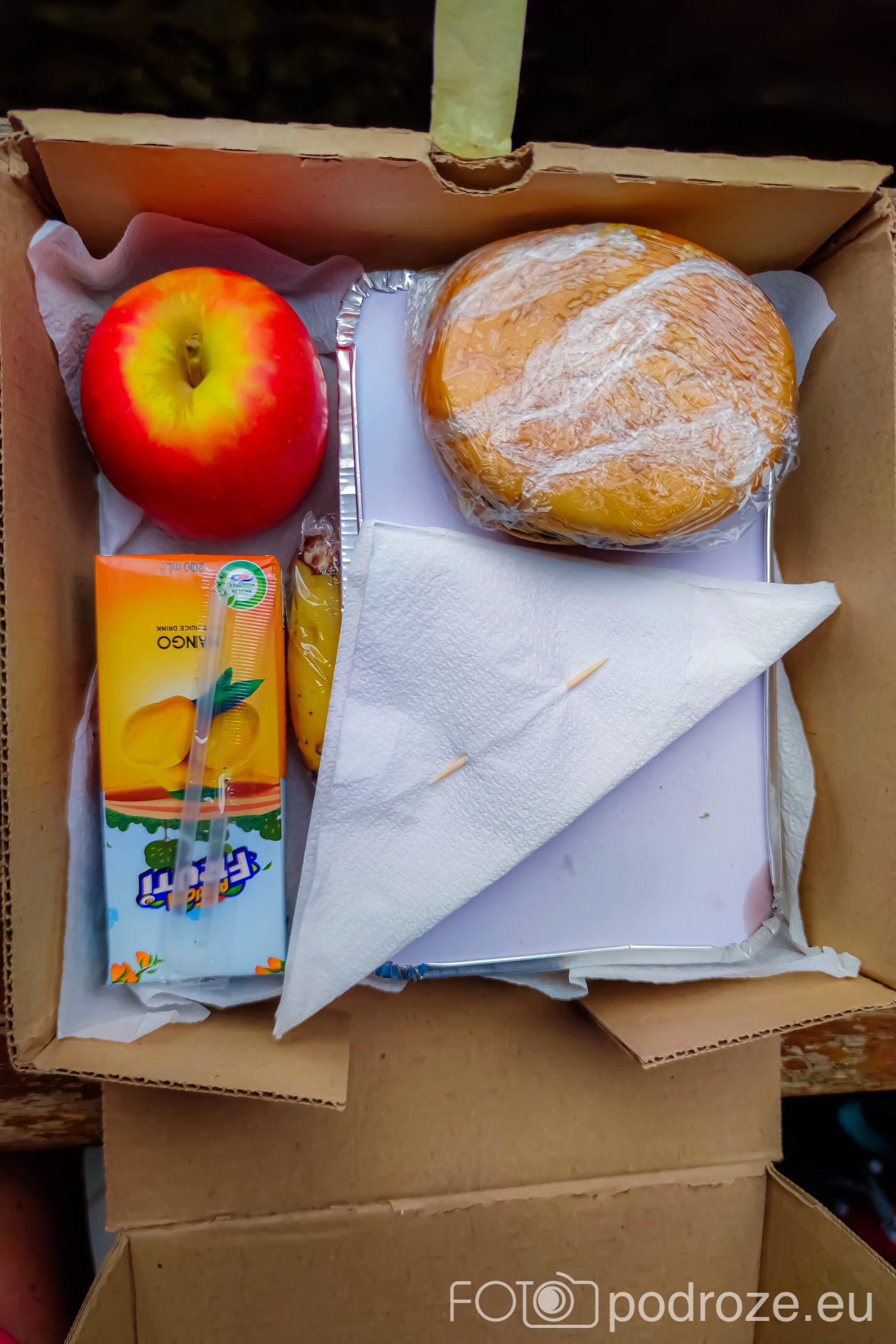 Jest godzina 10.30 rano, ale teraz długa przerwa, bo trzeba załatwić wszystkie formalności. Bez pozwoleń, uiszczenia odpowiednich opłat, sprawdzania ilości osób zatrudnionych, nie wpuszczą nikogo do Parku Narodowego. Mamy więc dużo czasu na zjedzenie wielkiego lunchu, który dostajemy w pudełkach. Jedzonko pyszne i już wiemy, że głodowanie nam nie grozi, bo porcje są ogromne. W toaletach można wziąć ostatni prysznic, gdyby ktoś chciał. Można też nabyć u panów stojących przed bramą flagi narodowe (mają chyba wszystkie), w sklepiku pod wiatą nabyć coś z ubrania. No i obowiązkowo zrobić sobie zdjęcia przy bramie.