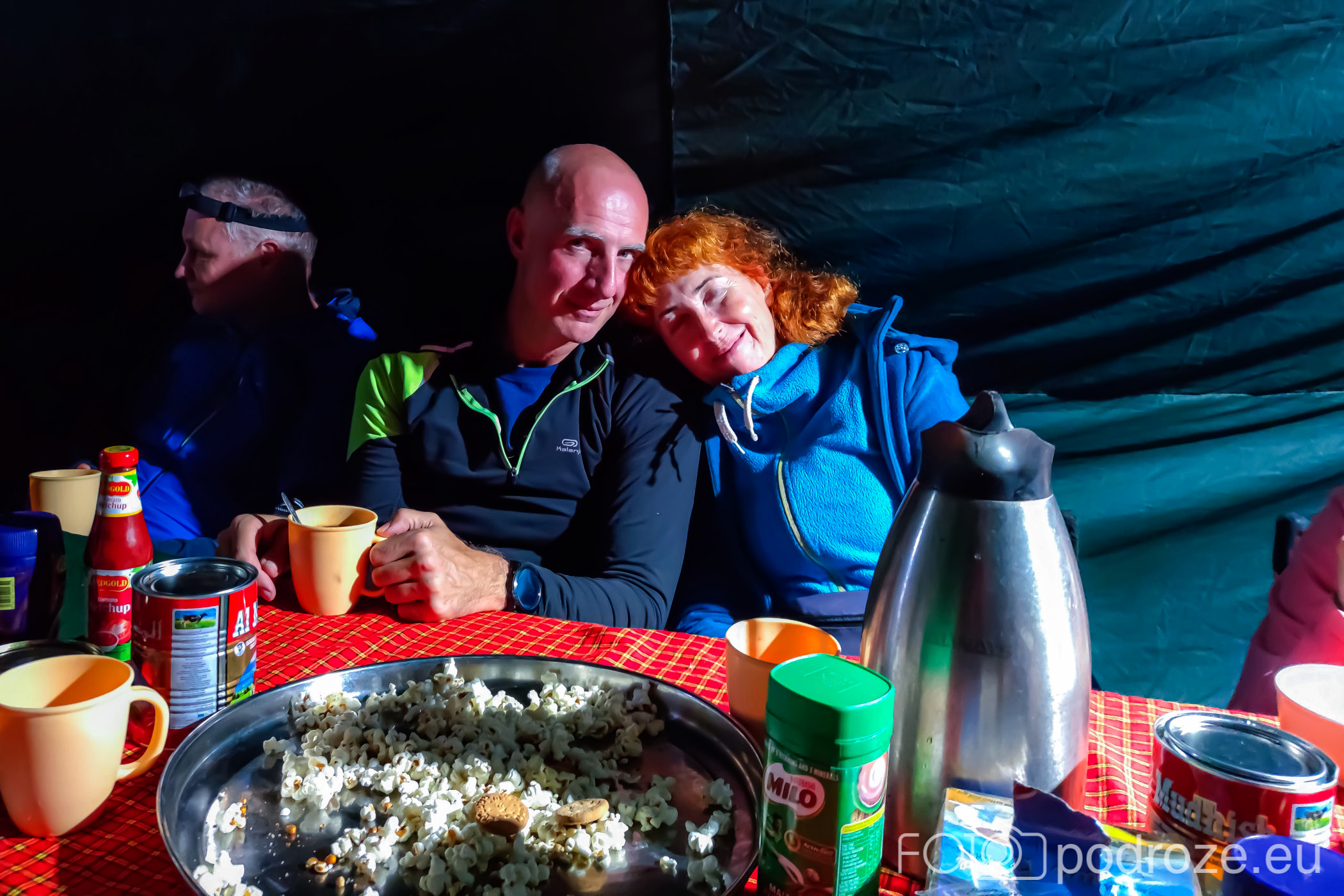 Koło godziny 19.00 meldujemy się w wielkim zielonym namiocie. Od dzisiaj będzie to nasza jadalnia. Na stole czekają już wielkie patery z popcornem i ciasteczkami oraz gorąca woda na herbatkę lub kawę. I tak zajadając i gawędząc z ekipą czekamy na główny posiłek. Pyszny dwudaniowy obiad składający się z zupki i makaronu z sosem zajadamy z przyjemnością. Potem następuje badanie saturacji i odprawa, czyli szereg informacji dotyczących kolejnego dnia. Kiedy wstajemy, jemy śniadanie, o której ruszamy w góry ? Co nas czeka na trasie jak się ubrać, co spakować i czego się spodziewać ? Informacje faktycznie bardzo ważne, kiedy jest się na tym szlaku po raz pierwszy.