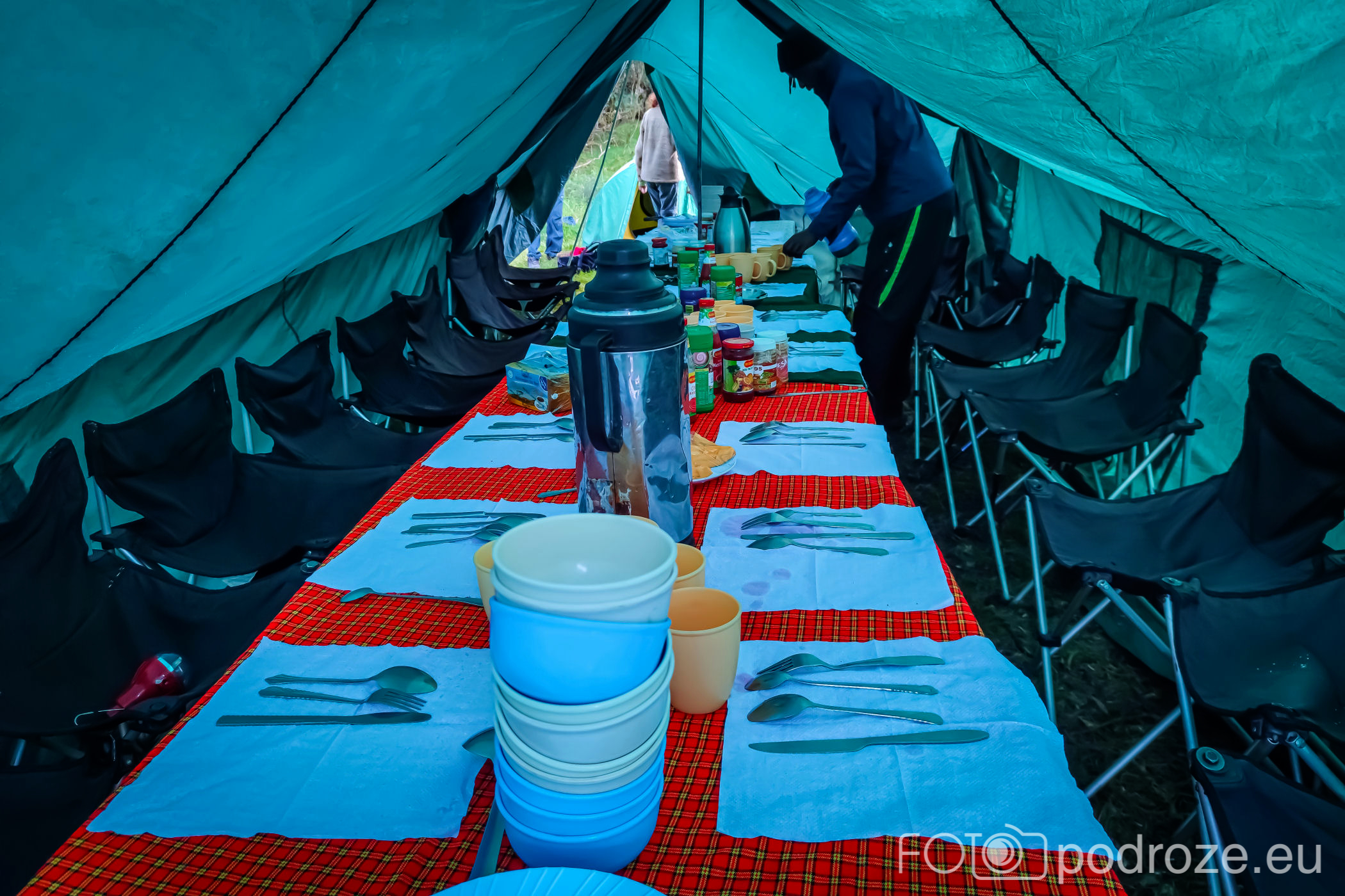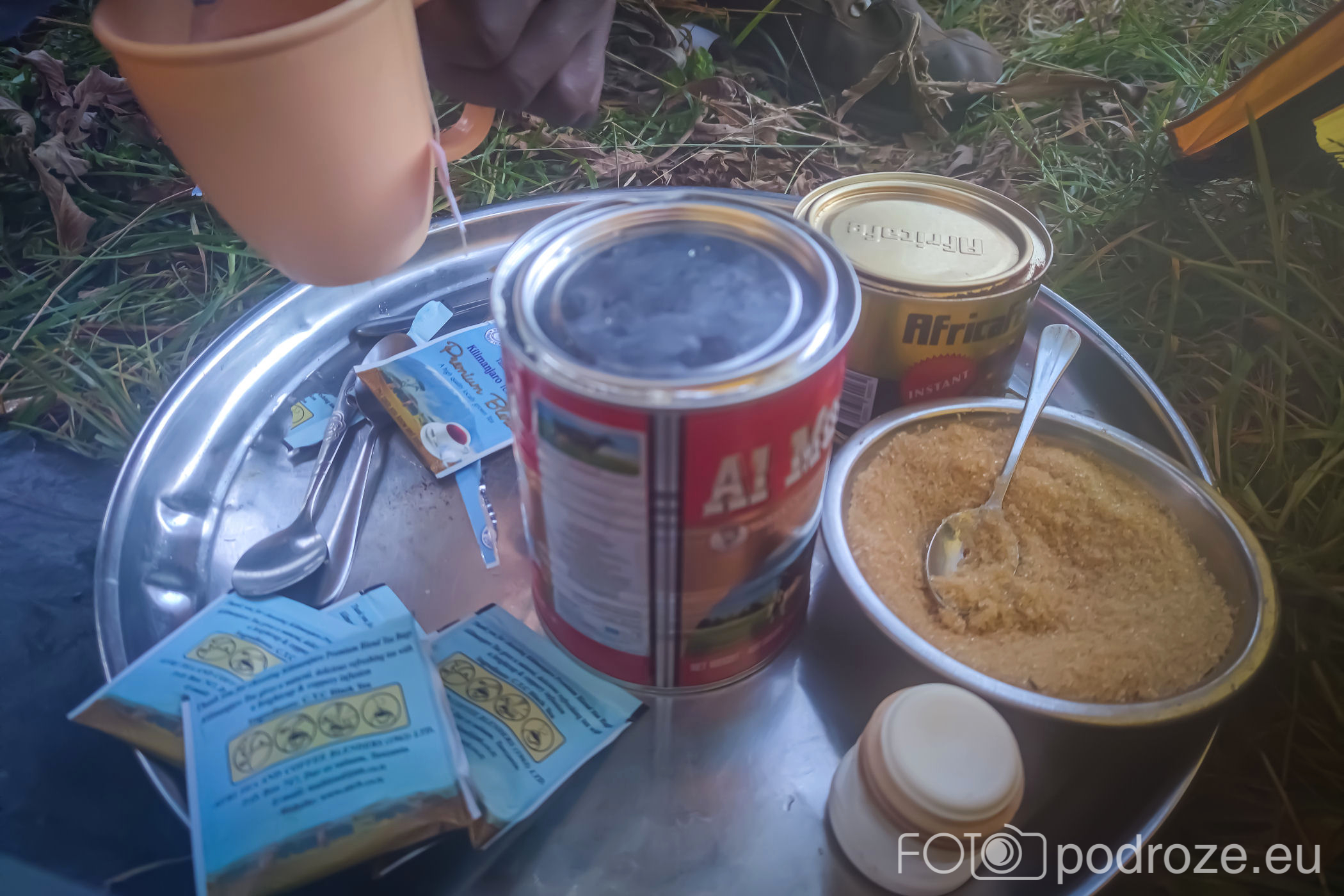 6.00 pobudka. Słyszymy JUMBO, czyli cześć, potem otwieranie zamka w namiocie i wita nas Tanzańczyk z tacą oferując kawę lub herbatę. Taka fantastyczna pobudka czeka na nas od dzisiaj każdego kolejnego dnia. Wypicie gorącej herbatki jest absolutnie cudowne. Od razu człowiekowi chce się wstawać na to zimno.