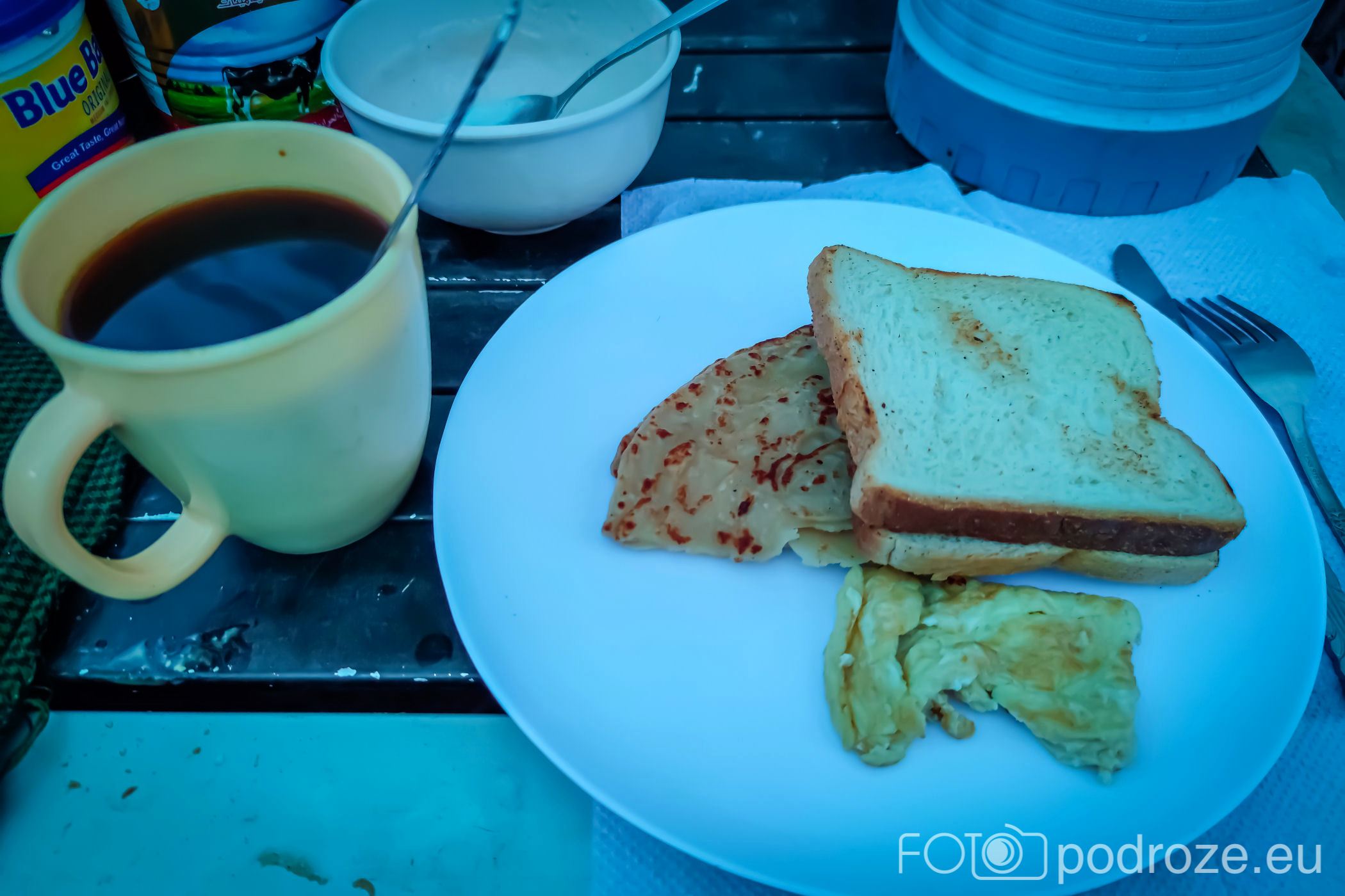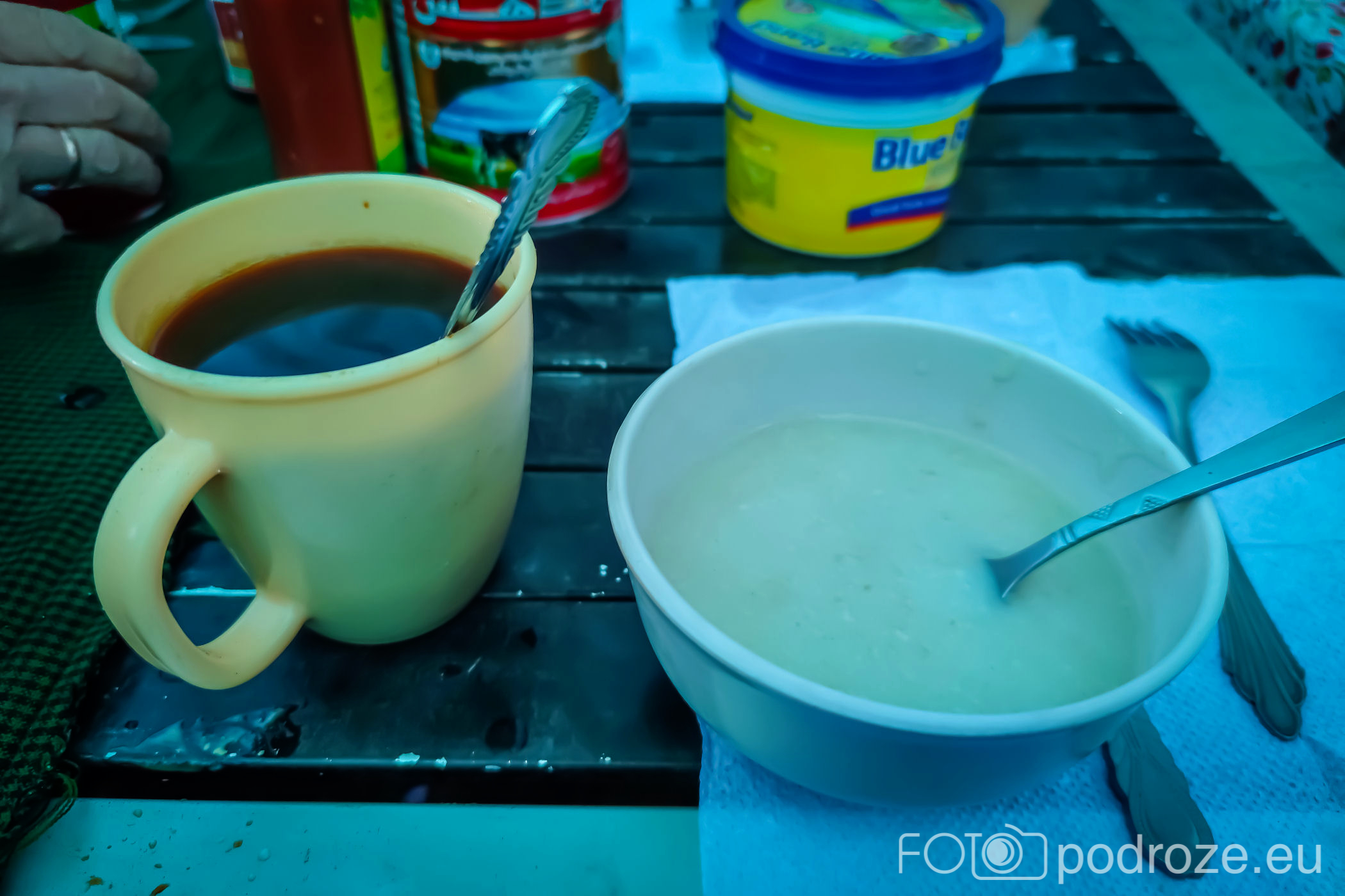 O 7.00 śniadanko, do tego czasu trzeba wszystko spakować, zwinąć śpiwory, materace i opróżnić cały namiot, a także przygotować plecak na wędrówkę ze wszystkim co niezbędne. ktoś właśnie chodzi z koszem i zbiera od ekipy butelki, camelbaki i termosy. Mamy mieć ze sobą minimum 3 litry wody. W zielonym namiocie czeka nas śniadanko, zaczynamy od obowiązkowej każdego dnia pysznej owsianki, potem kanapki, parówki, czasem jakieś tosty, naleśniczki, czy omlety … „full wypas” jak to mówią.