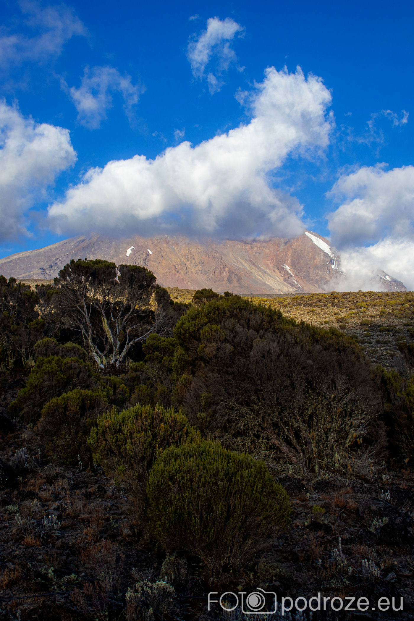 A gdy się obrócimy o 180 stopni to naszym oczom ukazuje się cały masyw Kilimandżaro. Chmury przewalają się raz odsłaniając krater, raz zasłaniając. Oj, piękna ta góra i prawie już na wyciągnięcie ręki !!!